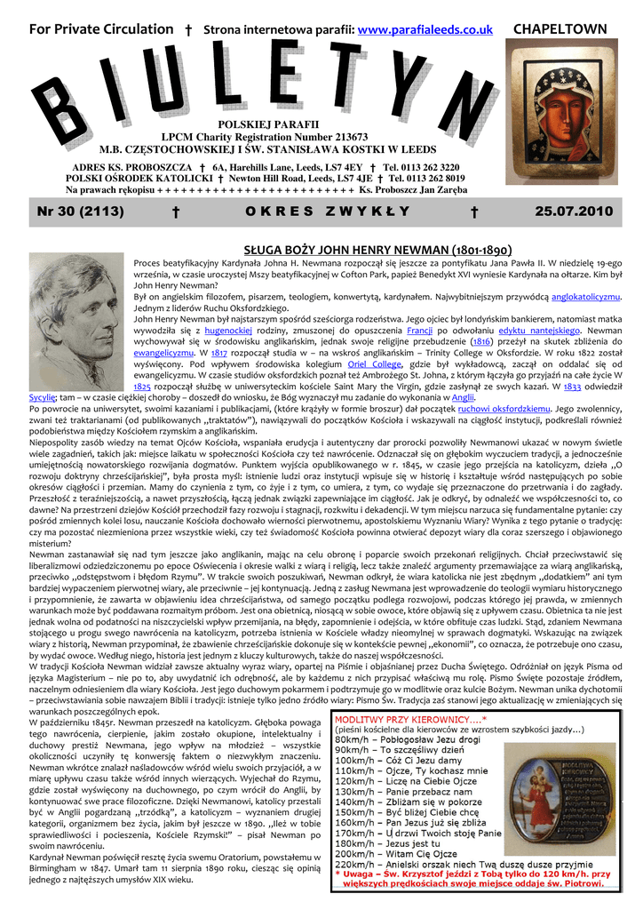 For Private Circulation † Strona internetowa parafii: www.parafialeeds.co.uk CHAPELTOWN POLSKIEJ PARAFII LPCM Charity Registration Number 213673 M.B. CZĘSTOCHOWSKIEJ I ŚW. STANISŁAWA KOSTKI W LEEDS ADRES KS. PROBOSZCZA † 6A, Harehills Lane, Leeds, LS7 4EY † Tel. 0113 262 3220 POLSKI OŚRODEK KATOLICKI † Newton Hill Road, Leeds, LS7 4JE † Tel. 0113 262 8019 Na prawach rękopisu + + + + + + + + + + + + + + + + + + + + + + + + + Ks. Proboszcz Jan Zaręba Nr 30 (2113) † OKRES ZWYKŁY † 25.07.2010 SŁUGA BOŻY JOHN HENRY NEWMAN (1801-1890) Proces beatyfikacyjny Kardynała Johna H. Newmana rozpoczął się jeszcze za pontyfikatu Jana Pawła II. W niedzielę 19-ego września, w czasie uroczystej Mszy beatyfikacyjnej w Cofton Park, papież Benedykt XVI wyniesie Kardynała na ołtarze. Kim był John Henry Newman? Był on angielskim filozofem, pisarzem, teologiem, konwertytą, kardynałem. Najwybitniejszym przywódcą anglokatolicyzmu. Jednym z liderów Ruchu Oksfordzkiego. John Henry Newman był najstarszym spośród sześciorga rodzeństwa. Jego ojciec był londyńskim bankierem, natomiast matka wywodziła się z hugenockiej rodziny, zmuszonej do opuszczenia Francji po odwołaniu edyktu nantejskiego. Newman wychowywał się w środowisku anglikańskim, jednak swoje religijne przebudzenie (1816) przeżył na skutek zbliżenia do ewangelicyzmu. W 1817 rozpoczął studia w – na wskroś anglikańskim – Trinity College w Oksfordzie. W roku 1822 został wyświęcony. Pod wpływem środowiska kolegium Oriel College, gdzie był wykładowcą, zaczął on oddalać się od ewangelicyzmu. W czasie studiów oksfordzkich poznał też Ambrożego St. Johna, z którym łączyła go przyjaźń na całe życie W 1825 rozpoczął służbę w uniwersyteckim kościele Saint Mary the Virgin, gdzie zasłynął ze swych kazań. W 1833 odwiedził Sycylię; tam – w czasie ciężkiej choroby – doszedł do wniosku, że Bóg wyznaczył mu zadanie do wykonania w Anglii. Po powrocie na uniwersytet, swoimi kazaniami i publikacjami, (które krążyły w formie broszur) dał początek ruchowi oksfordzkiemu. Jego zwolennicy, zwani też traktarianami (od publikowanych „traktatów”), nawiązywali do początków Kościoła i wskazywali na ciągłość instytucji, podkreślali również podobieństwa między Kościołem rzymskim a anglikańskim. Niepospolity zasób wiedzy na temat Ojców Kościoła, wspaniała erudycja i autentyczny dar prorocki pozwoliły Newmanowi ukazać w nowym świetle wiele zagadnień, takich jak: miejsce laikatu w społeczności Kościoła czy też nawrócenie. Odznaczał się on głębokim wyczuciem tradycji, a jednocześnie umiejętnością nowatorskiego rozwijania dogmatów. Punktem wyjścia opublikowanego w r. 1845, w czasie jego przejścia na katolicyzm, dzieła „O rozwoju doktryny chrześcijańskiej”, była prosta myśl: istnienie ludzi oraz instytucji wpisuje się w historię i kształtuje wśród następujących po sobie okresów ciągłości i przemian. Mamy do czynienia z tym, co żyje i z tym, co umiera, z tym, co wydaje się przeznaczone do przetrwania i do zagłady. Przeszłość z teraźniejszością, a nawet przyszłością, łączą jednak związki zapewniające im ciągłość. Jak je odkryć, by odnaleźć we współczesności to, co dawne? Na przestrzeni dziejów Kościół przechodził fazy rozwoju i stagnacji, rozkwitu i dekadencji. W tym miejscu narzuca się fundamentalne pytanie: czy pośród zmiennych kolei losu, nauczanie Kościoła dochowało wierności pierwotnemu, apostolskiemu Wyznaniu Wiary? Wynika z tego pytanie o tradycję: czy ma pozostać niezmieniona przez wszystkie wieki, czy też świadomość Kościoła powinna otwierać depozyt wiary dla coraz szerszego i objawionego misterium? Newman zastanawiał się nad tym jeszcze jako anglikanin, mając na celu obronę i poparcie swoich przekonań religijnych. Chciał przeciwstawić się liberalizmowi odziedziczonemu po epoce Oświecenia i okresie walki z wiarą i religią, lecz także znaleźć argumenty przemawiające za wiarą anglikańską, przeciwko „odstępstwom i błędom Rzymu”. W trakcie swoich poszukiwań, Newman odkrył, że wiara katolicka nie jest zbędnym „dodatkiem” ani tym bardziej wypaczeniem pierwotnej wiary, ale przeciwnie – jej kontynuacją. Jedną z zasług Newmana jest wprowadzenie do teologii wymiaru historycznego i przypomnienie, że zawarta w objawieniu idea chrześcijaństwa, od samego początku podlega rozwojowi, podczas którego jej prawda, w zmiennych warunkach może być poddawana rozmaitym próbom. Jest ona obietnicą, niosącą w sobie owoce, które objawią się z upływem czasu. Obietnica ta nie jest jednak wolna od podatności na niszczycielski wpływ przemijania, na błędy, zapomnienie i odejścia, w które obfituje czas ludzki. Stąd, zdaniem Newmana stojącego u progu swego nawrócenia na katolicyzm, potrzeba istnienia w Kościele władzy nieomylnej w sprawach dogmatyki. Wskazując na związek wiary z historią, Newman przypominał, że zbawienie chrześcijańskie dokonuje się w kontekście pewnej „ekonomii”, co oznacza, że potrzebuje ono czasu, by wydać owoce. Według niego, historia jest jednym z kluczy kulturowych, także do naszej współczesności. W tradycji Kościoła Newman widział zawsze aktualny wyraz wiary, opartej na Piśmie i objaśnianej przez Ducha Świętego. Odróżniał on język Pisma od języka Magisterium – nie po to, aby uwydatnić ich odrębność, ale by każdemu z nich przypisać właściwą mu rolę. Pismo Święte pozostaje źródłem, naczelnym odniesieniem dla wiary Kościoła. Jest jego duchowym pokarmem i podtrzymuje go w modlitwie oraz kulcie Bożym. Newman unika dychotomii – przeciwstawiania sobie nawzajem Biblii i tradycji: istnieje tylko jedno źródło wiary: Pismo Św. Tradycja zaś stanowi jego aktualizację w zmieniających się warunkach poszczególnych epok. W październiku 1845r. Newman przeszedł na 