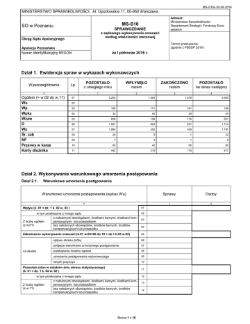 MS-S10o 05.08.2016 MINISTERSTWO SPRAWIEDLIWOŚCI, Al. Ujazdowskie 11, 00-950 Warszawa Adresat: Ministerstwo Sprawiedliwości Departament Strategii i Funduszy Europejskich MS-S10 SO w Poznaniu SPRAWOZDANIE z sądowego wykonywania orzeczeń według właściwości rzeczowej Okręg Sądu Apelacyjnego Termin przekazania: zgodnie z PBSSP 2016 r. Apelacja Poznańska Numer identyfikacyjny REGON za I półrocze 2016 r. Dział 1. Ewidencja spraw w wykazach wykonawczych Wyszczególnienie Lp. POZOSTAŁO z ubiegłego roku WPŁYNĘŁO razem 1 2 0 Ogółem (= w.02 do w.11) Wu Wp Wpkz Wzaw D Wz Śr. zab NF Przerwy w karze Karty dłużnika 01 ZAKOŃCZONO razem POZOSTAŁO na okres następny 3 4 5.204 1.554 1.818 4.940 156 171 161 166 02 03 04 33 40 29 44 05 658 109 116 651 06 1.921 624 831 1.714 07 1.884 352 439 1.797 08 20 3 1 22 09 7 3 1 9 10 83 42 65 60 11 442 210 175 477 Dział 2. Wykonywanie warunkowego umorzenia postępowania Dział 2.1. Warunkowe umorzenie postępowania Warunkowo umorzone postępowania (wykaz Wu) 0 Wpływ (k. 01 = dz. 1 k. 02 w. 02 ) 01 w tym przekazane z innego sądu z nałożonymi obowiązkami, środkami karnymi, środkami kompensacyjnymi lub przepadkiem Z liczby ogółem (z w.01) bez nałożonych obowiązków, środków karnych, środków kompensacyjnych lub przepadku 02 Zakończono wykonywanie orzeczeń (k.01 w.05=06 do 10 = dz.1 k.03 w.02) 05 03 04 upływu okresu próby 06 podjęcia warunkowo umorzonego postępowania 07 przekazania innemu sądowi 08 umorzenia postępowania wykonawczego 09 innych przyczyn 10 Pozostało (stan w ostatnim dniu okresu statystycznego) (k. 01 = dz. 1 k. 04 w. 02 ) 11 na skutek w tym przekazane z innego sądu z nałożonymi obowiązkami, środkami karnymi, środkami kompensacyjnymi lub przepadkiem Z liczby ogółem (z w.11) bez nałożonych obowiązków, środków karnych, środków kompensacyjnych lub przepadku Strona 1 z 18 12 13 14 Sprawy Osoby 1 2 MS-S10o 05.08.2016 Dział 2.2. Wykonywanie środków karnych, środków kompensacyjnych, oraz przepadku obowiązków w okresie warunkowego umorzenia postępowania Środki karne, obowiązki orzeczone przy warunkowym umorzeniu postępowania (sprawy z wykazu Wu) (k. 01 w. 01+05 >= dz. 2.1 k. 01 w. 03) Wpływ (w okresie sprawozdawczym) Wykonywane (stan w ostatnim dniu okresu sprawozdawczego) 0 1 2 Ogółem liczba środków karnych (w.01 = w.02 do 04) Orzeczone środki karne w art. 01 39 pkt 3 kk zakaz prowadzenia pojazdów 02 39 pkt 6 kk nawiązka 03 39 pkt 7 kk świadczenie pieniężne 04 Ogółem liczba obowiązków (w.05 = w.06 do 11+15 do 18+21 do 24) 67 § 3 kk naprawienie szkody lub zadośćuczynienie 06 72 § 1 pkt 1 kk informowania sądu lub kuratora o przebiegu okresu próby 07 72 § 1 pkt 2 kk przeproszenia pokrzywdzonego wykonywania ciążącego na nim obowiązku łożenia na utrzymanie innej osoby powstrzymania się od nadużywania alkoholu lub używania innych środków odurzających ogółem (w.11 = 12 do 14) 08 leczenie odwykowe (terapia uzależnień) – alkohol 12 leczenie odwykowe (terapia uzależnień) – środki odurzające 13 leczenie rehabilitacyjne, oddziaływania terapeutyczne 14 uczestnictwo w oddziaływaniach korekcyjno-edukacyjnych 15 terapia 16 uczestnictwa w oddziaływaniach korekcyjno-edukacyjnych 17 ogółem (w.18 = 19+20) powstrzymania się od kontaktowania się z pokrzywdzonym lub innymi osobami w określony sposób powstrzymywania się od zbliżania się do pokrzywdzonego lub innych osób opuszczenia lokalu zajmowanego wspólnie z pokrzywdzonym 18 72 § 1 pkt 3 kk 72 § 1 pkt 5 kk 72 § 1 pkt 6 kk Orzeczone obowiązki w art. 05 72 § 1 pkt 6a kk 72 § 1 pkt 6b kk 72 § 1 pkt 7a kk 72 § 1 pkt 7b kk 09 10 11 19 20 21 72 § 1a kk określenie przez sąd sposób kontaktu skazanego z pokrzywdzonym w razie orzeczenia obowiązku z § 1 pkt 7b 22 45a kk przepadek 23 z innych ustaw Dział 2.3. 24 Dozór w okresie warunkowego umorzenia postępowania Sprawy (= k. 02+03) Orzeczone dozory przy warunkowym umorzeniu postępowania (wykaz D) 0 1 Wpływ (w.01=03+04=05+06) 01 w tym przekazane z innych sądów Z tego dozory orzeczono (z w.01) Z tego dozory orzeczono (z w.01) 02 w wyroku 03 w okresie próby (art. 67 § 4 kk w zw. z art. 74 § 2 kk) 04 z orzeczonymi obowiązkami probacyjnymi 05 bez obowiązków probacyjnych 06 Zakończono (w okresie sprawozdawczym) (w. 07= w. 08) 07 Przyczyny zakończenia dozorów - razem (w.08 = w.09 do 12+21) 08 na skutek upływu okresu próby 09 zwolnienia od dozoru (art. 67 § 4 kk w zw. 74 § 2 kk) 10 przekazania innym sądom 11 podjęcia warunkowo umorzonego postępowania - ogółem (w.12<=w.14) 12 z w.12 po pisemnym upomnieniu sądowego kuratora zawodowego (art. 68 § 2a kk) 13 razem (w.15 do 20) 14 popełnienia w okresie próby przestępstwa umyślnego, za które sprawca został prawomocnie skazany (art. 68 § 1 kk) 15 popełnienia przestępstwa innego niż w art. 68 § 1 kk na rażącego naruszenia porządku prawnego w inny sposób (art. 68 § 2 kk) skutek uchylania się od dozoru (art. 68 § 2 kk) 16 17 18 uchylania się od wykonywania nałożonego obowiązku, środka karnego, środka kompensacyjnego, przepadku lub niewykonywania ugody (art. 68 § 2 kk) 19 określonego w art. 68 § 3 kk 20 innego 21 Pozostało (dozory, wykonywane wg stanu w ostatnim dniu okresu sprawozdawczego) Strona 2 z 18 22 z tego dozory sprawowane przez kuratorów inne podmioty 2 3 Osoby 4 MS-S10o 05.08.2016 Dział 2.4. Podjęcie warunkowego umorzenia postępowania (w okresie sprawozdawczym) Działanie sądu z urzędu/wnioski w przedmiocie podjęcia warunkowo umorzonego postępowania Podjęcia warunkowo umorzonego postępowania (wykaz Wu) 0 Ogółem sprawy ( w. 02 do w. 05) 01 Działania sądu z urzędu 02 kuratora Wnioski złożone inny uprawniony podmiot sprawujący dozór przez: prokuratora 03 razem (rubryka 2+3) uwzględnione nieuwzględnione 1 2 3 04 05 razem (w.06 = w.07 do 13) 06 popełnienia w okresie próby przestępstwa umyślnego, za które sprawca został prawomocnie s
