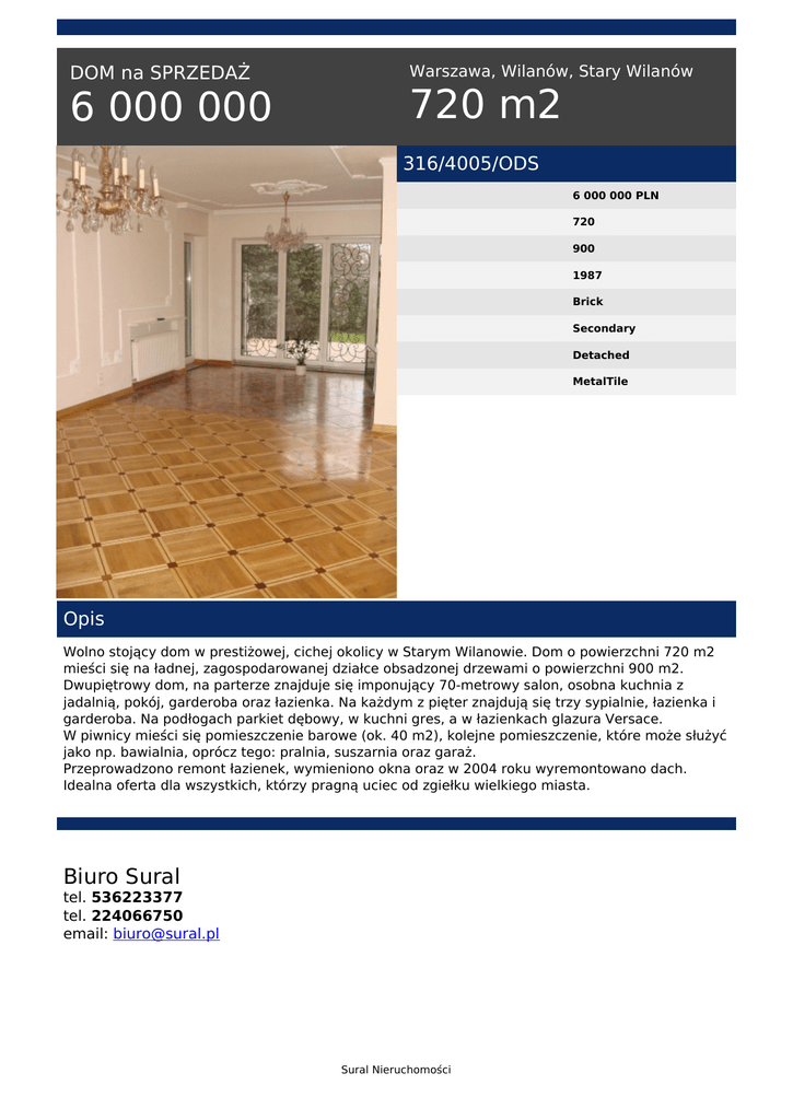 DOM na SPRZEDAŻ 6 000 000 Warszawa, Wilanów, Stary Wilanów 720 m2 316/4005/ODS 6 000 000 PLN 720 900 1987 Brick Secondary Detached MetalTile Opis Wolno stojący dom w prestiżowej, cichej okolicy w Starym Wilanowie. Dom o powierzchni 720 m2 mieści się na ładnej, zagospodarowanej działce obsadzonej drzewami o powierzchni 900 m2. Dwupiętrowy dom, na parterze znajduje się imponujący 70-metrowy salon, osobna kuchnia z jadalnią, pokój, garderoba oraz łazienka. Na każdym z pięter znajdują się trzy sypialnie, łazienka i garderoba. Na podłogach parkiet dębowy, w kuchni gres, a w łazienkach glazura Versace. W piwnicy mieści się pomieszczenie barowe (ok. 40 m2), kolejne pomieszczenie, które może służyć jako np. bawialnia, oprócz tego: pralnia, suszarnia oraz garaż. Przeprowadzono remont łazienek, wymieniono okna oraz w 2004 roku wyremontowano dach. Idealna oferta dla wszystkich, którzy pragną uciec od zgiełku wielkiego miasta. Biuro Sural tel. 536223377 tel. 224066750 email: [email protected] Sural Nieruchomości Powered by TCPDF (www.tcpdf.org)