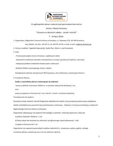 VI ogólnopolski plener malarski pod patronatem Burmistrza Gminy i Miasta Drzewicy “ Drzewica w obrazach zaklęta - zamek i kościół.” 7 - 10 lipca 2016r. 1. Organizator: Regionalne Centrum Kultury w Drzewicy, ul. Stawowa 27A, 26-340 Drzewica, woj. łódzkie, tel./fax.: 48 375 51 10, 48-675-35-93, e-mail: e-mail: [email protected] 2. Patroni medialni: Tygodnik Opoczyński, Radio Plus; Wieści z nad Drzewiczki 3. Cele: - Promowanie piękna terenu Drzewicy i najbliższych okolic - Stworzenie możliwości kontaktu mieszkańców ze sztuką i jej twórcami (plener, wernisaż) - Integracja polskich środowisk artystycznych i twórczych - Wydanie folderu promującego miasto i okolice -Powiększenie zbiorów artystycznych RCK (wystawy, cele reklamowe i promocyjne Gminy ) 4. Przedmiot Pleneru: Każdy z uczestników pleneru zobowiązuje się wykonać: - pracę na płótnie w formacie 70x50 cm- w technice olejnej lub akrylowej 1 szt., oraz - pracę na papierze w formacie A2- 1szt. lub A3- 2 sztuki- w technice dowolnej Tematyka prac do wyboru: Drzewicki zamek, dworek, kościół (fragmenty obiektów lub całość). W przynajmniej jednej pracy zabytkowy obiekt architektoniczny powinien być przedstawiony całościowo. Wybrane 2-4 prace przechodzą na własność Regionalnego Centrum Kultury w Drzewicy. Organizator zobowiązuje się zapewnić dla każdego uczestnika materiały plastyczne, takie jak: a) płótno malarskie 70x50cm -1 szt. b) farby olejne lub akrylowe (w zależności od zgłoszonego zapotrzebowania)- 1 kpl. c) papier w formacie A2-1 szt. Organizator nie zapewnia pozostałych mediów malarskich tj.: terpentyna, palety, pędzle, sztalugiuczestnicy pleneru zaopatrują się w nie we własnym zakresie. 1 5. Miejsce i termin - Regionalne Centrum Kultury, ul. Stawowa 27A, 26-340 Drzewica ; oraz baza noclegowa: Domki LKK Drzewica, ul. Sosnowa- pokoje 3 i 4 osobowe - 7- 10 lipca 2016r. 6. Warunki uczestnictwa Konkurs ma charakter otwarty, ogólnopolski. Mogą brać w nim udział artyści profesjonalni i nieprofesjonalni od 16 roku życia wzwyż. 7. Zgłoszenia do dnia 21 czerwca (wtorek)2016r. - e -mail: [email protected] - pocztą: : Regionalne Centrum Kultury, ul. Stawowa 27A, 26-340 Drzewica, woj. Łódzkie/ z dopiskiem „PLENER MALARSKI” (pod uwagę brana jest data wpływu zgłoszenia) 8. Inne: 1) Załącznik- regulamin, karta zgłoszenia, oświadczenie. Załączniki można pobrać ze strony internetowej www.drzewica.pl 2) Osoby odpowiedzialne za organizację i wybór prac plastycznych do zbiorów organizatora pleneru: Alina Szymańska, Anna Woźniak, tel.: kom.: 724098860; , tel./fax.: 48 375 51 10 wew.225, 48-675-35-93; 9. Organizacja pleneru: Organizatorzy zabezpieczają: -noclegi, -wyżywienie (śniadanie i obiadokolacja)- dla osób z poza terenu gminy Drzewica -materiały plastyczne (wymienione w regulaminie)-wszystkim uczestnikom -organizator zobowiązuje się do zorganizowania wernisażu i wystawy poplenerowej 10. Postanowienia końcowe: 1) Uczestnicy przyjeżdżają na koszt własny Spotkanie organizacyjne odbędzie się dn. 07.07.15r. (czwartek), o godz. 9:00 w Regionalnym Centrum Kultury w Drzewicy -w sali wielofunkcyjnej (adres placówki na górze strony) 2) Uczestnicy pleneru zobowiązani są do przestrzegania ogólnie przyjętych zasad koleżeńskiej współpracy 3) Uczestnicy powinni posiadać aktualne ubezpieczenie 4) Organizatorzy zastrzegają sobie prawo wyboru uczestników pleneru (ograniczona ilość miejsc) Uczestnicy pleneru zostaną powiadomieni o wyborze drogą e-mailową lub telefonicznie do dn. 22.06.16r. 5) Można wziąć udział w plenerze w charakterze niestacjonarnym. Artysta zgłasza się do pleneru jako artysta niestacjonarny- przesyła kartę zgłoszeniową i oświadczenie do organizatora (do 21 czerwca). Uczestnik 2 maluje na własnych materiałach ( wymiary podane w regulaminie, tematyka- wg regulaminu, termin dostarczenia prac dla organizatora –RCK do 12 lipca –drogą pocztową na koszt własny artysty lub osobiście Artysta niestacjonarny bierze udział w wernisażu i wystawie poplenerowej. Zdjęcia prac i informacje o artyście dołączamy do folderu. Organizator zwraca uczestnikowi niestacjonarnemu materiały plastyczne (wymienione w regulaminie). 3
