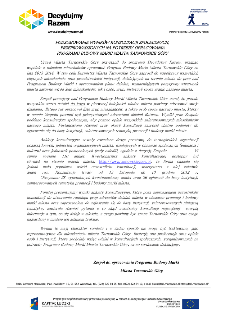 PODSUMOWANIE WYNIKÓW KONSULTACJI SPOŁECZNYCH, PRZEPROWADZONYCH NA POTRZEBY OPRACOWANIA PROGRAMU BUDOWY MARKI MIASTA TARNOWSKIE GÓRY Urząd Miasta Tarnowskie Góry przystąpił do programu Decydujmy Razem, pragnąc wspólnie z udziałem mieszkańców opracować Program Budowy Marki Miasta Tarnowskie Góry na lata 2013-2014. W tym celu Burmistrz Miasta Tarnowskie Góry zaprosił do współpracy wszystkich chętnych mieszkańców oraz przedstawicieli instytucji, działających na terenie miasta do prac nad Programem Budowy Marki i opracowaniem planu działań, wzmacniających pozytywny wizerunek miasta zarówno wśród jego mieszkańców, jak i osób, grup, instytucji spoza granic naszego miasta. Zespół pracujący nad Programem Budowy Marki Miasta Tarnowskie Góry uznał, że przede wszystkim warto ustalić do kogo w pierwszej kolejności władze miasta powinny adresować swoje działania, dlatego też opracował listę grup mieszkańców, a także osób spoza naszego miasta, którzy w ocenie Zespołu powinni być priorytetowymi adresatami działań Ratusza. Wyniki prac Zespołu poddano konsultacjom społecznym, aby poznać opinie wszystkich zainteresowanych mieszkańców naszego miasta. Postanowiono również przy okazji konsultacji zaprosić chętne podmioty do zgłoszenia się do bazy instytucji, zainteresowanych tematyką promocji i budowy marki miasta. Ankiety konsultacyjne zostały rozesłane droga pocztową do tarnogórskich organizacji pozarządowych, jednostek organizacyjnych miasta, działających w obszarze społecznym (edukacja i kultura) oraz jednostek pomocniczych (rady osiedli), zgodnie z decyzją Zespołu. W sumie wysłano 110 ankiet. Kwestionariusz ankiety konsultacyjnej dostępny był również na stronie urzędu miasta: http://www.tarnowskiegory.pl, ta forma okazała się jednak mało popularna wśród uczestników konsultacji, skorzystano z niej zaledwie jeden raz. Konsultacje trwały od 13 listopada do 13 grudnia 2012 r. Otrzymano 28 wypełnionych kwestionariuszy ankiet oraz 26 zgłoszeń do bazy instytucji, zainteresowanych tematyką promocji i budowy marki miasta. Poniżej prezentujemy wyniki ankiety konsultacyjnej, która poza zaproszeniem uczestników konsultacji do utworzenia rankingu grup adresatów działań miasta w obszarze promocji i budowy marki miasta oraz zaproszeniem do zgłoszenia się do bazy instytucji, zainteresowanych niniejszą tematyką, zawierała również pytania o to skąd uczetsnicy konsultacji najczęściej czerpią informacje o tym, co się dzieje w mieście, z czego powinny być znane Tarnowskie Góry oraz czego najbardziej w mieście ich zdaniem brakuje. Wyniki te mają charakter sondażu i w żaden sposób nie mogą być traktowane, jako reprezentatywne dla mieszkańców miasta Tarnowskie Góry. Ilustrują one preferencje oraz opinie osób i instytucji, które zechciały wziąć udział w konsultacjach społecznych, zorganizowanych na potrzeby Programu Budowy Marki Miasta Tarnowskie Góry, za co serdecznie dziękujęmy. Zespół ds. opracowania Programu Budowy Marki Miasta Tarnowskie Góry FRDL Centrum Mazowsze, Plac Inwalidów 10, 01-552 Warszawa, tel. (022) 322 84 25, fax. (022) 322 84 10, e-mail [email protected] http://frdl.mazowsze.pl/ Projekt jest współfinansowany przez Unię Europejską w ramach Europejskiego Funduszu Społecznego I. RANKING ADRESATÓW WEWNĘTRZNYCH i ZEWNETRZNYCH, do których w pierwszej kolejności zdaniem uczestnków konsultacji powinny być skierowane działania władz miasta. (uczestnicy konsultacji mogli wybrać maksymalnie trzy kategorie adresatów, zarówno wśród adresatów wewnętrznych, jak i zewnętrznych) ADRESACI WEWNĘTRZNI Liczba wskazań ADRESACI ZEWNĘTRZNI Liczba wskazań Mieszkańcy stali 23 Turyści 20 Inwestorzy 18 Inwestorzy 17 Młodzież 15 Dzieci i młodzież 12 Dzieci 7 Potencjalni mieszkańcy 7 Potencjalni mieszkańcy 6 Mieszkańcy z okolic 6 Rodziny 5 Odwiedzający 5 Emeryci/Seniorzy 3 Klienci branż działających w Tarnowskich Górach (górnictwo) 5 Osoby niepełnosprawne 3 Przypadkowi turyści 3 Mieszkańcy pracujący poza Tarnowskimi Górami 2 Sportowcy 2 1 1 Inne propozycje (jakie?)Tarnogórzanie, którzy w świecie osiągnęli sukces, Organizacje zagraniczne dla współtworzenia projektów partnerstwa, 1 Odwiedzający rodziny z zagranicy 1 Inne propozycje (jakie?) Rady Dzielnic FRDL Centrum Mazowsze, Plac Inwalidów 10, 01-552 Warszawa, tel. (022) 322 84 25, fax. (022) 322 84 10, e-mail [email protected] http://frdl.mazowsze.pl/ Projekt jest współfinansowany przez Unię Europejską w ramach Europejskiego Funduszu Społecznego II. NAJCZĘŚCIEJ WSKAZYWANE ŹRÓDŁA INFORMACJI O TYM, CO DZIEJE SIĘ W TARNOWSKICH GÓRACH Proszę o wskazanie maksymalnie trzech źródeł informacji, z których czerpie Pan/ Pani wiedzę o tym, co dzieje się w naszym mieście? Liczba wskazań Gwarek 22 http://www.tarnowskiegory.pl/ 14 DZ- dodatek 7 www.tarnogorski.pl 4 Gwarek.TV 3 Plakaty i afisze 3 Radio Piekary 3 Jako najbardziej popularne źródła informacji o wydarzeniach lokalnych uczestnicy konsultacji wskazali tygodnik Gwarek (22 wskazania na 28), następnie miejski portal www.tarnowskiegory.pl (14 wskazań na 28) oraz dodatek do Dziennika Zachodniego (7 wskazań na 28). FRDL Centrum Mazowsze, Plac Inwalidów 10, 01-552 Warszawa, tel. (022) 322 84 25, fax. (022) 322 84 10, e-mail [email protected] http://frdl.mazowsze.pl/ Projekt jest współfinansowany przez Unię Europejską w ramach Europejskiego Funduszu Społecznego III. Z CZEGO POWINNY BYĆ ZNANE TARNOWSKIE GÓRY? (OCENY UCZESTNIKÓW KONSULTACJI, zestawione z wynikami sondażu internetowago1 zrealizowanego w 2008 roku, w którym wzięło udział 48 osób) 2012 (N=28) Z czego Pana/ Pani zdaniem powinny być znane Tarnowskie Góry? 2008 (N=48) (liczba wskazań) Z czego Pana/ Pani zdaniem powinny być znane Tarnowskie Góry? odestek wskazań Kopalni Srebra 53,57 (15) Kopalni Zabytkowej 71,43 Imprezy Gwarki 46,42 (13) Rynku i Cenrum 53