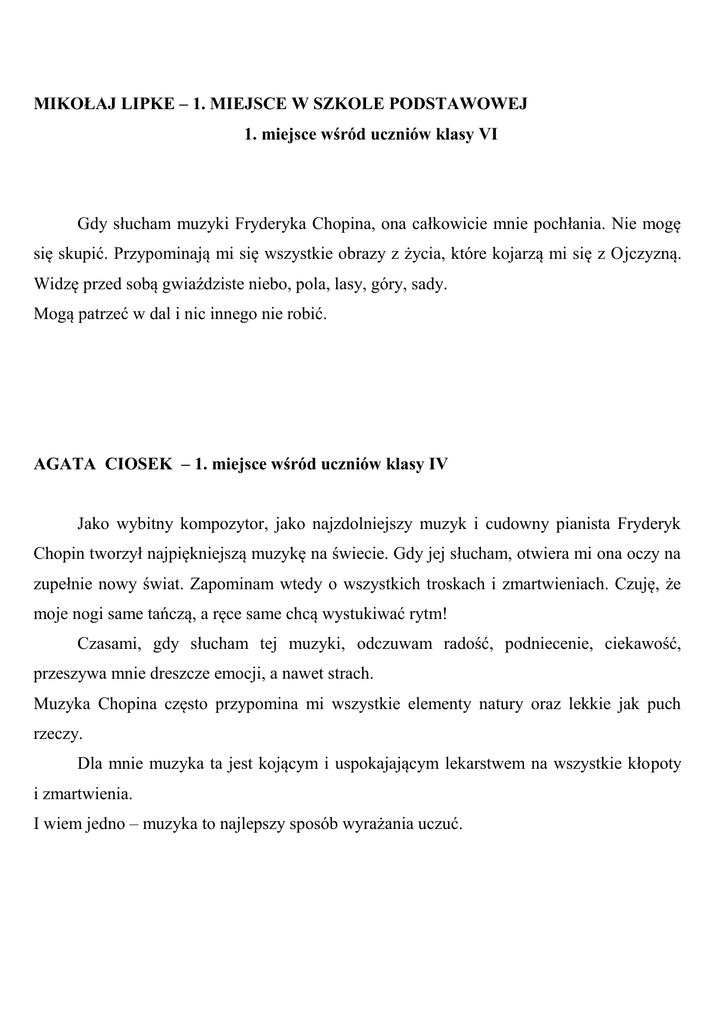 MIKOŁAJ LIPKE – 1. MIEJSCE W SZKOLE PODSTAWOWEJ 1. miejsce wśród uczniów klasy VI Gdy słucham muzyki Fryderyka Chopina, ona całkowicie mnie pochłania. Nie mogę się skupić. Przypominają mi się wszystkie obrazy z życia, które kojarzą mi się z Ojczyzną. Widzę przed sobą gwiaździste niebo, pola, lasy, góry, sady. Mogą patrzeć w dal i nic innego nie robić. AGATA CIOSEK – 1. miejsce wśród uczniów klasy IV Jako wybitny kompozytor, jako najzdolniejszy muzyk i cudowny pianista Fryderyk Chopin tworzył najpiękniejszą muzykę na świecie. Gdy jej słucham, otwiera mi ona oczy na zupełnie nowy świat. Zapominam wtedy o wszystkich troskach i zmartwieniach. Czuję, że moje nogi same tańczą, a ręce same chcą wystukiwać rytm! Czasami, gdy słucham tej muzyki, odczuwam radość, podniecenie, ciekawość, przeszywa mnie dreszcze emocji, a nawet strach. Muzyka Chopina często przypomina mi wszystkie elementy natury oraz lekkie jak puch rzeczy. Dla mnie muzyka ta jest kojącym i uspokajającym lekarstwem na wszystkie kłopoty i zmartwienia. I wiem jedno – muzyka to najlepszy sposób wyrażania uczuć. ALEKSANDRA WŁODARCZYK– 1. miejsce wśród uczniów klasy IV „Kraina wspomnień i łez” Gdy słucham muzyki na przykład Mozarta, nie umiem się w nią wsłuchać, gdybym nawet bardzo chciała. Lecz gdy do moich uszu dotrze muzyka Chopina, natychmiast w głębi duszy odżywają uczucia. Czasami są to dobre, a niekiedy złe wspomnienia, ale każde z nich są czasami potrzebne. Każdy musi czasami zastanowić się nad nieprzemyślanymi wcześniej czynami, a słuchanie Chopina to jest właśnie mój moment. Ta muzyka działa na mnie odprężająco, aż zbiera mi się na łzy, ponieważ tak mocne budzą się we mnie uczucia i tak bardzo oddaję się muzyce. Cieszę się, że był ktoś taki jak Fryderyk Chopin, którego muzyka pozwala moim uczuciom odżyć. ZUZANNA KUROWSKA – 1. miejsce wśród uczniów klasy Va „Obrazki muzyczne” Siedzący na łące ludzie widzą piękny krajobraz i zbliżające się burzowe chmury. Dostrzegają również lecącego motyla, który wpada w pajęczynę. Potem dziewczyna przebudza się i widzi ojca grającego na fortepianie. W sali pary tańczą poloneza. Mają wszyscy dobry nastrój. Jedna z par, mieszkająca za górami, w drodze do domu wpada do wody. Ale cóż to? Wyjeżdżają z jeziora i jadą dalej! Z jakiegoś małego domku na polanie rozlegają się kłótnie. Nagle człowiek zasiada przy fortepianie i przenosi swój nastrój na dźwięki, grając smutno. Po chwili staje się coraz weselszy i gra coraz piękniej. Pszczoły zbierają nektar z kwiatów. Lecąc do ula, zauważają, że koło ich domu z królową siedzi chłopczyk i śpiewa wesołą piosenkę o Polsce. Ma dobry nastrój, co słychać w jego muzyce. MARCEL KOŁDRZAK – 1. miejsce wśród uczniów klasy VB Muzyka Chopina przywodzi mi na myśl piękne, polskie łąki przepełnione kwiatami. I skowronka przelatującego między topolami stojącymi przy drodze. Jest lato, późne lato. Muzyka wydaje się radosna. Pod wieczór zaczynają cykać świerszcze. Zaczyna padać deszcz. Rzeka przybiera, aż w końcu wylewa się z koryta i zalewa pola. Następnego dnia wstaje słońce i osusza ziemię. Łąki znów stają się piękne. Lecz nie na długo – przychodzi jesień. Liście spadają z drzew, zakrywając drogi gruba warstwą żółtoczerwonych kształtów. Wszystko robi się smutne i brudne. Liście gniją, na polach powstaje błoto. Wkrótce rzeka zamarza, a krajobraz upiększa biały puch – śnieg. Jest go coraz więcej. Wkrótce zasypie nawet czubki drzew. Aż w końcu sople spadają z drzew, a wodę wchłania gleba. I wszystko zaczyna się od początku.