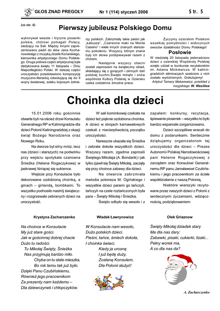 GŁOS ZNAD PREGOŁY (ze str. 4) Str. 5 Nr 1 (114) styczeń 2006 Pierwszy jubileusz Polskiego Domu wykonywał wesołe i liryczne piosenki polskie, chórowi pomagali Polacy, siedzący na Sali. Między innymi zaprezentowano pieśń do słów Jana Kochanowskiego z muzyką Józefa Konarskiego, kierownika artystycznego Domu Polskiego. Druga połowa części artystycznej była dedykowana świętu 11 listopada – Dniu Niepodległości Polski. W dalszej części uroczystości przedstawiono kompozycję muzyczno-literacką odwołującą się do II wojny światowej, szlaku bojowym żołnie- rzy polskich. Zabrzmiały takie pieśni jak „katiusza”, „Czerwone maki na Monte Cassino” i wiele innych znanych starszemu pokoleniu. W szyscy, którym znane były ich słowa podśpiewywali razem z chórem. Następnie wszyscy obecni zostali zaproszeni na świąteczny obiad, składający się z gorących i zimnych dań polskiej kuchni.Święto minęło i znów wspólnota Kultury Polskiej w Oziersku czeka codzienna żmudna praca. Życzymy oziorskim Polakom wszelkiej pomyślności i widocznych owoców działalności Domu Polskiego! Posłowie W niedzielę 20 listopada jedenaścioro dzieci z ozierskiej W spólnoty Polskiej wzięło udział w konkursie recytatorskim im. Adama Mickiewicza. W kaliningradzkich eliminacjach sześcioro z nich zostało wyróżnionych. Gratulujemy! Artykuł Tamary Makarewicz, przekład z rosyjskiego W. Wasiliew Choinka dla dzieci 15.01.2006 roku gościnnie otwarte byli na oścież drzwi Konsulatu Generalnego RP w Kaliningradzie dla dzieci Polonii Kaliningradzkiej z okazji świąt Bożego Narodzenia oraz Nowego Roku. Na dworze był silny mróz, lecz nas (dzieci i starszych) na podwórku przy wejściu spotykała czarowna Śnieżka (Helena Rogaczykowa) w jaskrawej lśniącej się sukience. Wejście przy Konsulacie było dekorowane ozdobioną choinką, a gmach – girlandą, bombkami. To wszystko podnosiło nastrój świąteczny i rozgrzewało zebranych dzieci na uroczystość. Krystyna Zacharczenko Na choince w Konsulacie My już stare gości. Jak w gościnnej dobrej chacie Dużo tu radości. Tu Mikołaj Święty, Śnieżka Nas przyjmują bardzo miło. Chyba on tu stale mieszka, Bo rok temu tak już było. Dzięki Panu Czubińskiemu, Również jego pracownikom Za prezenty nam każdemu – Dla dziewczynek i chłopczyków. W sali kominkowej czekała na dzieci też pięknie ozdobiona choinka. A dzieci w strojach karnawałowych czekali z niecierpliwością początku uroczystości. Nareszcie ukazała się Śnieżka i zebrała dokoła wszystkich dzieci. Wszyscy razem, zgadnie zaprosili Świętego Mikołaja (A. Bondarik) i jak tylko zjawił się Święty Mikołaj, zaczęły się przy choince zabawy dla dzieci. Na otwarcie zabrzmiała melodia poloneza M. Ogińskiego i wszystkie dzieci parami go tańczyli, tańczyli na czele roztańczonych była para – Święty Mikołaj i Śnieżka. Święto odbyło się wesoło i z zapałem: konkursy, recytacja, śpiewanie piosenek – wszystko to było bardzo wspaniale zorganizowano. Dzieci szczęśliwe wracali do domu z podarunkami. Serdecznie dziękujemy organizatorom tej uroczystości dla dzieci – Prezes Autonomii Polskiej Narodowościowej pani Helenie Rogaczykowej z zarządem oraz Konsulowi Generalnemu RP panu Jarosławowi Czubińskiemu i jego pracownikom za ścisłe współdziałanie z naszą Polonią. Niektóre wierszyki recytowane przez naszych dzieci z Polonii z serdecznymi życzeniami, wdzięcznością, podziękowaniem: Władek Ławrynowicz Olek Griaznow W Konsulacie nam wesoło, Dużo polskich dzieci. Pieśni, tańce, śmiech dokoła, I choinka świeci. Kiedy ja urosnę I już będę duży, Zostanę Konsulem, Dla Polonii służyć! Święty Mikołaj dziadek stary Ma dla nas dary: Zabawki, pisaki, cukierki, lizaki... Pełny worek ma, A co dla nas da? A. Zacharczenko