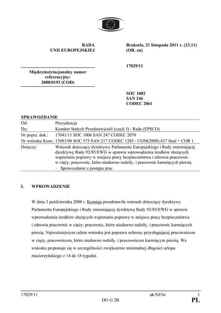RADA UNII EUROPEJSKIEJ Bruksela, 21 listopada 2011 r. (23.11) (OR. en) 17029/11 Międzyinstytucjonalny numer referencyjny: 2008/0193 (COD) SOC 1002 SAN 246 CODEC 2061 SPRAWOZDANIE Od: Prezydencja Do: Komitet Stałych Przedstawicieli (część I) / Rada (EPSCO) Nr poprz. dok.: 17041/11 SOC 1006 SAN 247 CODEC 2070 Nr wniosku Kom.: 13983/08 SOC 575 SAN 217 CODEC 1285 - COM(2008) 637 final + COR 1 Dotyczy: Wniosek dotyczący dyrektywy Parlamentu Europejskiego i Rady zmieniającej dyrektywę Rady 92/85/EWG w sprawie wprowadzenia środków służących wspieraniu poprawy w miejscu pracy bezpieczeństwa i zdrowia pracownic w ciąży, pracownic, które niedawno rodziły, i pracownic karmiących piersią – Sprawozdanie z postępu prac I. WPROWADZENIE W dniu 3 października 2008 r. Komisja przedstawiła wniosek dotyczący dyrektywy Parlamentu Europejskiego i Rady zmieniającej dyrektywę Rady 92/85/EWG w sprawie wprowadzenia środków służących wspieraniu poprawy w miejscu pracy bezpieczeństwa i zdrowia pracownic w ciąży, pracownic, które niedawno rodziły, i pracownic karmiących piersią. Najważniejszym celem wniosku jest poprawa ochrony przysługującej pracownicom w ciąży, pracownicom, które niedawno rodziły, i pracownicom karmiącym piersią. We wniosku proponuje się w szczególności zwiększenie minimalnej długości urlopu macierzyńskiego z 14 do 18 tygodni. 17029/11 ak/NJ/lw DG G 2B 1 PL Wszystkie delegacje podtrzymały ogólne zastrzeżenia weryfikacji do wniosku. Delegacje DK, FR, MT i UK zgłosiły zastrzeżenia parlamentarne. Ponadto kilka delegacji przypomniało swoje poparcie dla oświadczenia dołączonego do protokołu z posiedzenia Rady EPSCO, które miało miejsce w dniu 6 grudnia 2010 r.1 Parlament Europejski przyjął stanowisko podczas pierwszego czytania w dniu 20 października 2010 r. Europejski Komitet Ekonomiczno-Społeczny przyjął opinię w sprawie wniosku w dniu 13 maja 2009 r. Parlament Europejski jest zdania, że urlop macierzyński powinien trwać 20 tygodni i być pełnopłatny; Parlament przypomniał, że okres 20 tygodni jest zalecany przez Światową Organizację Zdrowia i że daje on matkom szansę odzyskania w pełni sił po porodzie, także stworzenia bliskiej więzi z nowonarodzonym dzieckiem. Opinia Parlamentu w pierwszym czytaniu zawiera ponad 70 poprawek do wniosku Komisji, w tym prawo do co najmniej dwóch tygodni pełnopłatnego urlopu ojcowskiego przysługującego osobie, której małżonka lub partnerka życiowa urodziła niedawno dziecko. W związku z tym, że podczas obrad Rady w dniu 6 grudnia 2010 r. długość urlopu macierzyńskiego oraz związany z nim zasiłek okazały się najbardziej delikatnymi kwestiami, prezydencja węgierska zaproponowała, aby oddzielić te dwie sprawy podczas dyskusji grupy roboczej na początku 2011 r. i zamiast tego skoncentrować się na szeregu tematycznych grup poprawek (przepisy dotyczące powrotu do pracy, zdrowie i bezpieczeństwo oraz warunki pracy pracownic w ciąży; łączenie życia zawodowego i prywatnego; równe traktowanie i ogólne kwestie związane z niedyskryminacją; urlopy okolicznościowe („urlopy specjalne”) i różne inne formy urlopu). Zaproponowane przez PE poprawki w przeważającej części nie znalazły poparcia większości delegacji w Radzie. Niektóre poprawki uznano za zbyt szczegółowe; kilka delegacji powtórzyły, że dyrektywa ma na celu ustanowienie minimalnych standardów. Zasadniczo delegacje uznały, że dyrektywa powinna dotyczyć wyłącznie urlopu macierzyńskiego, a tylko kilka delegacji było otwartych na kwestie urlopu adopcyjnego i ojcowskiego. W szczególności wiele delegacji podkreśliło, że wniosek powinien co do zasady skoncentrować się na kwestiach zdrowia i bezpieczeństwa w miejscu pracy2. A zatem delegacje zakwestionowały zarówno podwójną podstawę prawną wniosku Komisji, jak również ideę łączenia różnych rodzajów urlopu. 1 2 17716/10; oświadczenie złożone przez delegacje CZ, DK, DE, EE, NL, SK, SE i UK. Więcej informacji zob. 10541/11, s. 7–9. 17029/11 ak/NJ/lw DG G 2B 2 PL Chociaż prezydencja węgierska poczyniła pewne postępy, analizując poszczególne poprawki PE, stało się jednak jasne, że konieczne są dalsze dyskusje, aby Rada mogła sformułować swoje stanowisko w sprawie wniosku, a także aby znaleźć wspólną płaszczyznę porozumienia między dwoma współustawodawcami. II. PRACE PODCZAS POLSKIEJ PREZYDENCJI a) Podejście Prezydencji: Prezydencja w sposób jednoznaczny włączyła wniosek Komisji do listy priorytetów swego programu prac w ramach tematu „Solidarność międzypokoleniowa: demograficzna przyszłość Europy”. Aby ustalić, w jaki sposób należy kontynuować prace w tym zakresie, prezydencja odbyła szereg nieformalnych spotkań z różnymi delegacjami, przedstawicielami Parlamentu i Komisji; wobec braku odpowiedniego mandatu, prezydencja mogła tylko wysłuchać poszczególnych stron, sama jednakże nie zajęła w przedmiotowej sprawie stanowiska. Podczas nieformalnego posiedzenia ministrów ds. rodziny i równości płci w Krakowie w dniu 21 października, prezydencja zaprosiła ministrów do dyskusji nad kwestią godzenia pracy z życiem prywatnym i rodzinnym, ze szczególnym uwzględnieniem praw rodziców pracujących, przy czym uznano, że dyrektywa w sprawie urlopu macierzyńskiego mogłaby odegrać istotną rolę w tym kontekście. Opierając się na wynikach wyżej wymienionych obrad, prezydencja zwróciła się do Parlamentu podczas posiedzenia plenarnego w dniu 25 października w związku z pytaniem wymagającym odpowiedzi ustnej nr 184/2011, postawionym przez sprawozdawcę Edite Estrelę. W swoim pytaniu do Rady Edite Estrela stwierdziła, że Parlament ma „świadomość, że część państw członkowskich wyraziła swoje obawy w odniesieniu do poprawek przyjętych przez Parlament” oraz że Parlament jest gotowy „wykazać się elastycznością”1. Minister podkr