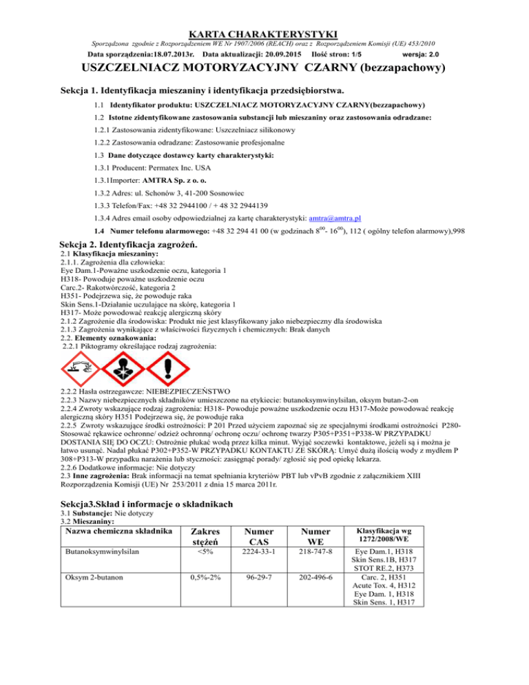 KARTA CHARAKTERYSTYKI Sporządzona zgodnie z Rozporządzeniem WE Nr 1907/2006 (REACH) oraz z Rozporządzeniem Komisji (UE) 453/2010 Data sporządzenia:18.07.2013r. Data aktualizacji: 20.09.2015 Ilość stron: 1/5 wersja: 2.0 USZCZELNIACZ MOTORYZACYJNY CZARNY (bezzapachowy) Sekcja 1. Identyfikacja mieszaniny i identyfikacja przedsiębiorstwa. 1.1 Identyfikator produktu: USZCZELNIACZ MOTORYZACYJNY CZARNY(bezzapachowy) 1.2 Istotne zidentyfikowane zastosowania substancji lub mieszaniny oraz zastosowania odradzane: 1.2.1 Zastosowania zidentyfikowane: Uszczelniacz silikonowy 1.2.2 Zastosowania odradzane: Zastosowanie profesjonalne 1.3 Dane dotyczące dostawcy karty charakterystyki: 1.3.1 Producent: Permatex Inc. USA 1.3.1Importer: AMTRA Sp. z o. o. 1.3.2 Adres: ul. Schonów 3, 41-200 Sosnowiec 1.3.3 Telefon/Fax: +48 32 2944100 / + 48 32 2944139 1.3.4 Adres email osoby odpowiedzialnej za kartę charakterystyki: [email protected] 1.4 Numer telefonu alarmowego: +48 32 294 41 00 (w godzinach 800- 1600), 112 ( ogólny telefon alarmowy),998 Sekcja 2. Identyfikacja zagrożeń. 2.1 Klasyfikacja mieszaniny: 2.1.1. Zagrożenia dla człowieka: Eye Dam.1-Poważne uszkodzenie oczu, kategoria 1 H318- Powoduje poważne uszkodzenie oczu Carc.2- Rakotwórczość, kategoria 2 H351- Podejrzewa się, że powoduje raka Skin Sens.1-Działanie uczulające na skórę, kategoria 1 H317- Może powodować reakcję alergiczną skóry 2.1.2 Zagrożenie dla środowiska: Produkt nie jest klasyfikowany jako niebezpieczny dla środowiska 2.1.3 Zagrożenia wynikające z właściwości fizycznych i chemicznych: Brak danych 2.2. Elementy oznakowania: 2.2.1 Piktogramy określające rodzaj zagrożenia: 2.2.2 Hasła ostrzegawcze: NIEBEZPIECZEŃSTWO 2.2.3 Nazwy niebezpiecznych składników umieszczone na etykiecie: butanoksymwinylsilan, oksym butan-2-on 2.2.4 Zwroty wskazujące rodzaj zagrożenia: H318- Powoduje poważne uszkodzenie oczu H317-Może powodować reakcję alergiczną skóry H351 Podejrzewa się, że powoduje raka 2.2.5 Zwroty wskazujące środki ostrożności: P 201 Przed użyciem zapoznać się ze specjalnymi środkami ostrożności P280Stosować rękawice ochronne/ odzież ochronną/ ochronę oczu/ ochronę twarzy P305+P351+P338-W PRZYPADKU DOSTANIA SIĘ DO OCZU: Ostrożnie płukać wodą przez kilka minut. Wyjąć soczewki kontaktowe, jeżeli są i można je łatwo usunąć. Nadal płukać P302+P352-W PRZYPADKU KONTAKTU ZE SKÓRĄ: Umyć dużą ilością wody z mydłem P 308+P313-W przypadku narażenia lub styczności: zasięgnąć porady/ zgłosić się pod opiekę lekarza. 2.2.6 Dodatkowe informacje: Nie dotyczy 2.3 Inne zagrożenia: Brak informacji na temat spełniania kryteriów PBT lub vPvB zgodnie z załącznikiem XIII Rozporządzenia Komisji (UE) Nr 253/2011 z dnia 15 marca 2011r. Sekcja3.Skład i informacje o składnikach 3.1 Substancje: Nie dotyczy 3.2 Mieszaniny: Nazwa chemiczna składnika Butanoksymwinylsilan Oksym 2-butanon Zakres stężeń Numer CAS Numer WE Klasyfikacja wg 1272/2008/WE <5% 2224-33-1 218-747-8 0,5%-2% 96-29-7 202-496-6 Eye Dam.1, H318 Skin Sens.1B, H317 STOT RE.2, H373 Carc. 2, H351 Acute Tox. 4, H312 Eye Dam. 1, H318 Skin Sens. 1, H317 KARTA CHARAKTERYSTYKI Sporządzona zgodnie z Rozporządzeniem WE Nr 1907/2006 (REACH) oraz z Rozporządzeniem Komisji (UE) 453/2010 Data sporządzenia:18.07.2013r. Data aktualizacji: 20.09.2015 Ilość stron: 2/5 wersja: 2.0 USZCZELNIACZ MOTORYZACYJNY CZARNY (bezzapachowy) SEKCJA 4. ŚRODKI PIERWSZEJ POMOCY 4.1 Opis środków pierwszej pomocy: 4.1.1 Połknięcie: W razie połknięcia przepłukać jamę ustną oraz przetransportować do najbliższej placówki medycznej celem podjęcia leczenia. Pokazać opakowanie lub etykietę. Nie wywoływać wymiotów, niebezpieczeństwo aspiracji. Jeśli wystąpią spontanicznie wymioty, trzymać głowę poniżej bioder. 4.1.2. Zatrucie inhalacyjne: Wynieść poszkodowanego z miejsca narażenia i zapewnić dostęp świeżego powietrza oraz spokój i odpoczynek. W przypadku dolegliwości (kaszel, wymioty, zawroty głowy, świszczący oddech) zapewnić pomoc lekarską. Nieprzytomnego ułożyć w pozycji bocznej. 4.1.3. Skażenie skóry: Zdjąć skażoną odzież. Skórę zmyć ciepłą wodą z mydłem. W razie wystąpienia podrażnienia skóry skontaktować się z lekarzem. 4.1.4.Skażenie oczu: Jeżeli poszkodowany nosi szkła kontaktowe niezwłocznie je wyjąć. Dokładnie przemyć oczy dużą ilością wody, wywijając powieki. Zapewnić pomoc okulisty. Uwaga: osoby narażone na skażenie oczu powinny być pouczone o konieczności i sposobie natychmiastowego płukania oczu 4.2 Najważniejsze ostre i opóźnione objawy oraz skutki narażenia: 4.2.1 Skażenie oczu: Występuje podrażnienie, zaczerwienienie oraz łzawienie 4.2.2 Połknięcie: Mogą pojawić się mdłości, wymioty oraz ból brzucha, biegunka. 4.2.3 Wdychanie: Bóle głowy, nudności, zawroty głowy, podrażnienie dróg oddechowych, uszkodzenie centralnego układu nerwowego 4.3 Wskazania dotyczące wszelkiej natychmiastowej pomocy lekarskiej i szczególnego postępowania z poszkodowanym: Podjąć leczenie objawowe. SEKCJA 5. POSTĘPOWANIE W PRZYPADKU POŻARU 5.1 Środki gaśnicze: 5.1.1 Odpowiednie środki gaśnicze: Stosować CO2, proszek gaśniczy, mgła wodna 5.1.2 Niewłaściwe środki gaśnicze: Zwarty strumień wody 5.2 Szczególne zagrożenia związane z mieszaniną: Produkt w sprayu. Pary produktu mogą tworzyć palne i wybuchowe mieszaniny z powietrzem. W trakcie spalania wydzielają się toksyczne gazy, pary i dymy. 5.3 Informacje dla straży pożarnej: Środki ochrony ogólnej typowe w przypadku pożaru. Nie należy przebywać w zagrożonej ogniem strefie bez odpowiedniego ubrania odpornego na chemikalia i aparatu do oddychania z niezależnym obiegiem powietrza. Zagrożone pożarem zbiorniki usunąć jeśli to możliwe i nie wiąże się z nadmiernym ryzykiem lub chłodzić rozpyloną wodą z odpowiedniej odległości. SEKCJA 6. POSTĘPOWANIE W