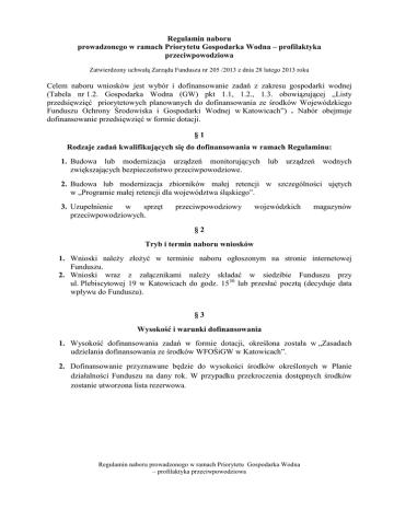 Regulamin naboru prowadzonego w ramach Priorytetu Gospodarka Wodna – profilaktyka przeciwpowodziowa Zatwierdzony uchwałą Zarządu Funduszu nr 205 /2013 z dnia 28 lutego 2013 roku Celem naboru wniosków jest wybór i dofinansowanie zadań z zakresu gospodarki wodnej (Tabela nr 1.2. Gospodarka Wodna (GW) pkt 1.1, 1.2., 1.3. obowiązującej „Listy przedsięwzięć priorytetowych planowanych do dofinansowania ze środków Wojewódzkiego Funduszu Ochrony Środowiska i Gospodarki Wodnej w Katowicach”) . Nabór obejmuje dofinansowanie przedsięwzięć w formie dotacji. §1 Rodzaje zadań kwalifikujących się do dofinansowania w ramach Regulaminu: 1. Budowa lub modernizacja urządzeń monitorujących zwiększających bezpieczeństwo przeciwpowodziowe. lub urządzeń wodnych 2. Budowa lub modernizacja zbiorników małej retencji w szczególności ujętych w „Programie małej retencji dla województwa śląskiego”. 3. Uzupełnienie w sprzęt przeciwpowodziowych. przeciwpowodziowy wojewódzkich magazynów §2 Tryb i termin naboru wniosków 1. Wnioski naleŜy złoŜyć w terminie naboru ogłoszonym na stronie internetowej Funduszu. 2. Wnioski wraz z załącznikami naleŜy składać w siedzibie Funduszu przy ul. Plebiscytowej 19 w Katowicach do godz. 1530 lub przesłać pocztą (decyduje data wpływu do Funduszu). §3 Wysokość i warunki dofinansowania 1. Wysokość dofinansowania zadań w formie dotacji, określona została w „Zasadach udzielania dofinansowania ze środków WFOŚiGW w Katowicach”. 2. Dofinansowanie przyznawane będzie do wysokości środków określonych w Planie działalności Funduszu na dany rok. W przypadku przekroczenia dostępnych środków zostanie utworzona lista rezerwowa. Regulamin naboru prowadzonego w ramach Priorytetu Gospodarka Wodna – profilaktyka przeciwpowodziowa §4 Kryteria wyboru 1. Ocenie formalnej podlegać będą wnioski złoŜone na obowiązujących formularzach, zawierające komplet wymaganych dokumentów. Formularze wniosków wraz z wymaganymi załącznikami dostępne są na stronie internetowej Funduszu www.wfosigw.katowice.pl. W przypadku negatywnej oceny formalnej Wnioskodawca zostanie wezwany do poprawy wniosku w terminie do 30 dni od daty otrzymania informacji. 2. Ocena merytoryczna dokonana będzie w oparciu o następujące kryteria: 2.1. Kryterium osiągnięcia standardów Unii Europejskiej: a) współfinansowanie ze środków UE lub innych środków zagranicznych i krajowych, b) ujęcie zadania w jednym z krajowych lub wojewódzkich programów dotyczących ochrony przeciwpowodziowej i gospodarki wodnej: - Program małej retencji dla Województwa Śląskiego, - Program ochrony przed powodzią w dorzeczu Górnej Wisły, - Program Odra 2006. 2.2. Kryterium zintegrowanej efektywności ekologicznej, ekonomicznej i społecznej: a) przepływ miarodajny lub kontrolny wód w korycie rzeki (m3/s), b) koszt budowy 1 mb wału przeciwpowodziowego lub innego rodzaju umocnień, c) wartość uzyskanej rezerwy powodziowej (dotyczy budowy lub modernizacji zbiorników retencyjnych), d) koszt uzyskania 1 m3 rezerwy powodziowej (dotyczy budowy lub modernizacji zbiorników retencyjnych), e) powierzchnia obszaru chronionego, f) liczba mieszkańców obszaru chronionego, g) obiekty uŜyteczności publicznej i obiekty wpisane do rejestru zabytków na chronionym obszarze. 2.3. Kryterium stanu przygotowania zadania: gotowość do realizacji inwestycji. Po pozytywnej ocenie wniosek zostanie skierowany do decyzji właściwego organu Funduszu (Zarządu lub Rady Nadzorczej Funduszu). Wnioskodawca zostanie powiadomiony o dofinansowaniu zadania, o jego odrzuceniu lub umieszczeniu na liście rezerwowej. 3. §5 Postanowienia końcowe 1. − − 2. W kwestiach nieobjętych niniejszym regulaminem obowiązują: Zasady udzielania dofinansowania ze środków WFOŚiGW w Katowicach, Kryteria wyboru przedsięwzięć finansowanych ze środków WFOŚiGW w Katowicach. Regulaminem nie są objęte zadania realizowane w oparciu o „Szczególne zasady finansowania przedsięwzięć związanych z wystąpieniem klęski Ŝywiołowej lub innych nadzwyczajnych zdarzeń noszących znamiona klęski Ŝywiołowej”. 3. Niniejszy regulamin nie dotyczy państwowych jednostek budŜetowych. Regulamin naboru prowadzonego w ramach Priorytetu Gospodarka Wodna – profilaktyka przeciwpowodziowa