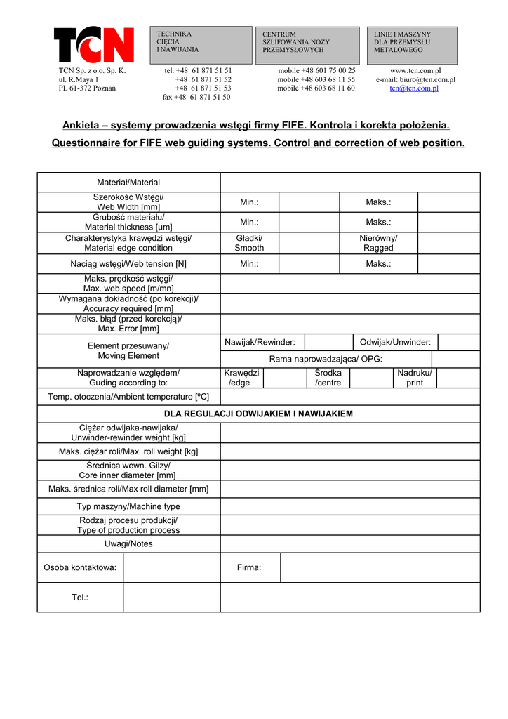 TECHNIKA CIĘCIA I NAWIJANIA TCN Sp. z o.o. Sp. K. ul. R.Maya 1 PL 61-372 Poznań CENTRUM SZLIFOWANIA NOŻY PRZEMYSŁOWYCH tel. +48 61 871 51 51 +48 61 871 51 52 +48 61 871 51 53 fax +48 61 871 51 50 mobile +48 601 75 00 25 mobile +48 603 68 11 55 mobile +48 603 68 11 60 LINIE I MASZYNY DLA PRZEMYSŁU METALOWEGO www.tcn.com.pl e-mail: [email protected] [email protected] Ankieta – systemy prowadzenia wstęgi firmy FIFE. Kontrola i korekta położenia. Questionnaire for FIFE web guiding systems. Control and correction of web position. Materiał/Material Szerokość Wstęgi/ Web Width [mm] Grubość materiału/ Material thickness [μm] Charakterystyka krawędzi wstęgi/ Material edge condition Naciąg wstęgi/Web tension [N] Min.: Maks.: Min.: Maks.: Gładki/ Smooth Nierówny/ Ragged Min.: Maks.: Maks. prędkość wstęgi/ Max. web speed [m/mn] Wymagana dokładność (po korekcji)/ Accuracy required [mm] Maks. błąd (przed korekcją)/ Max. Error [mm] Element przesuwany/ Moving Element Naprowadzanie względem/ Guding according to: Nawijak/Rewinder: Odwijak/Unwinder: Rama naprowadzająca/ OPG: Krawędzi /edge Środka /centre Temp. otoczenia/Ambient temperature [ºC] DLA REGULACJI ODWIJAKIEM I NAWIJAKIEM Ciężar odwijaka-nawijaka/ Unwinder-rewinder weight [kg] Maks. ciężar roli/Max. roll weight [kg] Średnica wewn. Gilzy/ Core inner diameter [mm] Maks. średnica roli/Max roll diameter [mm] Typ maszyny/Machine type Rodzaj procesu produkcji/ Type of production process Uwagi/Notes Osoba kontaktowa: Tel.: Firma: Nadruku/ print