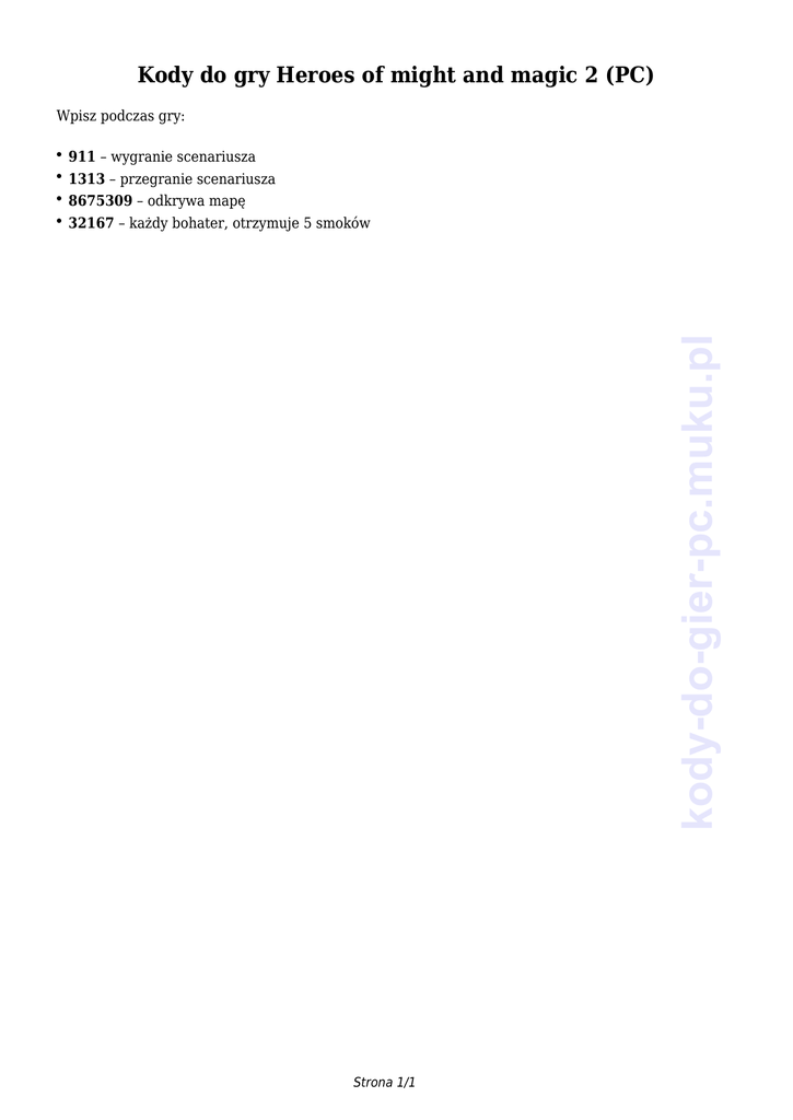 Kody do gry Heroes of might and magic 2 (PC) Wpisz podczas gry: 911 – wygranie scenariusza ● 1313 – przegranie scenariusza ● 8675309 – odkrywa mapę ● 32167 – każdy bohater, otrzymuje 5 smoków kody-do-gier-pc.muku.pl ● Strona 1/1