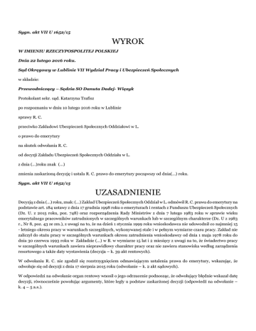 Sygn. akt VII U 1652/15 WYROK W IMIENIU RZECZYPOSPOLITEJ POLSKIEJ Dnia 22 lutego 2016 roku. Sąd Okręgowy w Lublinie VII Wydział Pracy i Ubezpieczeń Społecznych w składzie: Przewodniczący – Sędzia SO Danuta Dadej- Więsyk Protokolant sekr. sąd. Katarzyna Trafisz po rozpoznaniu w dniu 10 lutego 2016 roku w Lublinie sprawy R. C. przeciwko Zakładowi Ubezpieczeń Społecznych Oddziałowi w L. o prawo do emerytury na skutek odwołania R. C. od decyzji Zakładu Ubezpieczeń Społecznych Oddziału w L. z dnia (...)roku znak (...) zmienia zaskarżoną decyzję i ustala R. C. prawo do emerytury począwszy od dnia(...) roku. Sygn. akt VII U 1652/15 UZASADNIENIE Decyzją z dnia (...) roku, znak: (...) Zakład Ubezpieczeń Społecznych Oddział w L. odmówił R. C. prawa do emerytury na podstawie art. 184 ustawy z dnia 17 grudnia 1998 roku o emeryturach i rentach z Funduszu Ubezpieczeń Społecznych (Dz. U. z 2015 roku, poz. 748) oraz rozporządzenia Rady Ministrów z dnia 7 lutego 1983 roku w sprawie wieku emerytalnego pracowników zatrudnionych w szczególnych warunkach lub w szczególnym charakterze (Dz. U z 1983 r., Nr 8, poz. 43 ze zm.), z uwagi na to, że na dzień 1 stycznia 1999 roku wnioskodawca nie udowodnił co najmniej 15 - letniego okresu pracy w warunkach szczególnych, wykonywanej stale i w pełnym wymiarze czasu pracy. Zakład nie zaliczył do stażu pracy w szczególnych warunkach okresu zatrudnienia wnioskodawcy od dnia 1 maja 1978 roku do dnia 30 czerwca 1993 roku w Zakładzie (...) w B. w wymiarze 15 lat i 2 miesięcy z uwagi na to, że świadectwo pracy w szczególnych warunkach zawiera nieprawidłowy charakter pracy oraz nie zawiera stanowiska według zarządzenia resortowego a także daty wystawienia (decyzja – k. 39 akt rentowych). W odwołaniu R. C. nie zgodził się rozstrzygnięciem odmawiającym ustalenia prawa do emerytury, wskazując, że odwołuje się od decyzji z dnia 17 sierpnia 2015 roku (odwołanie – k. 2 akt sądowych). W odpowiedzi na odwołanie organ rentowy wnosił o jego odrzucenie podnosząc, że odwołujący błędnie wskazał datę decyzji, równocześnie powołując argumenty, które legły u podstaw zaskarżonej decyzji (odpowiedź na odwołanie – k. 4 – 5 a.s.). W piśmie procesowym z dnia 2 listopada 2015 roku odwołujący oświadczył, że odwołuje się od decyzji z dnia 28 sierpnia 2015 roku (pismo – k. 10 a.s.). Na posiedzeniu w dniu 10 lutego 2015 roku odwołujący wyjaśnił, że domaga się uwzględnienia w stażu pracy w szczególnych warunkach całego okresu zatrudnienia w Zakładach (...) w B. od dnia 13 maja 1974 roku do dnia 11 marca 1996 roku (protokół – k. 26v. a.s.). Ostatecznie organ rentowy wnosił o oddalenie odwołania (protokół – k. 26v. a.s.). Sąd Okręgowy ustalił, co następuje: R. C., urodzony (...), w dniu 29 czerwca 2015 roku złożył wniosek o emeryturę. W jego treści zawarł oświadczenie o tym, że nie jest członkiem otwartego funduszu emerytalnego. Na podstawie przedłożonych dokumentów organ rentowy uznał za udowodniony na dzień 1 stycznia 1999 roku łączny okres podlegania ubezpieczeniom w wymiarze 24 lat, 9 miesięcy i 16 dni, w tym 22 lata i 6 miesięcy okresów nieskładkowych oraz 2 lata, 3 miesiące i 16 dni okresów nieskładkowych. W ramach rozpoznania wniosku Zakład wydał w dniu 6 sierpnia 2015 roku decyzję odmawiającą prawa do świadczenia z uwagi na nie osiągnięcie do dnia 1 stycznia 1999 roku 25 – letniego okresu składkowego i nieskładkowego oraz nieudowodnienia 15 – letniego okresu pracy w szczególnych warunkach. W odpowiedzi na decyzję ubezpieczony w dniu 17 sierpnia 2015 roku złożył pismo w którym wnosił o ponowne wyliczenia stażu pracy. Do pisma dołączył świadectwo pracy, przy uwzględnieniu którego organ rentowy uznał za udowodniony na dzień 1 stycznia 1999 roku łączny okres podlegania ubezpieczeniom w wymiarze 26 lat, 7 miesięcy i 28 dni, w tym 24 lata, 4 miesiące i 12 dni okresów nieskładkowych oraz 2 lata, 3 miesięcy i 16 dni okresów nieskładkowych. W tym stanie rzeczy wydana została zaskarżona decyzja w której organ rentowy nie uwzględnił do stażu pracy w szczególnych warunkach żadnego okresu zatrudnienia ubezpieczonego (okoliczności bezsporne). R. C. został z dniem 13 maja 1974 roku zatrudniony w Zakładach (...) w B. (następnie Zakład (...) S.A.) na podstawie umowy o pracę na siedmiodniowy okres próbny z upływem którego umowa przekształciła się w zawartą na czas nieokreślony w pełnym wymiarze czasu pracy na stanowisku robotnika magazynowego z przydziałem świadczenia pracy do magazynu tkanin surowych na wydziale wykańczalni. Na zajmowanym stanowisku ubezpieczony zajmował się przenoszeniem, ważeniem, przewijaniem oraz oznaczeniem co do rodzaju, wagi i ilości metrów bel tkaniny, które to czynności wykonywał wspólnie innym pracownikiem magazynu. Na wydziale wykańczalni wykonywana była obróbka tkanin z wykorzystaniem środków chemicznych, których przy wykonywaniu swoich obowiązków ubezpieczony nie używał. W okresie od dnia (...)roku ubezpieczony odbywał zasadniczą służbę wojskową. Po zakończeniu służby powrócił do pracy u dotychczasowego pracodawcy na uprzednio zajmowane stanowisko pracy w dniu 7 maja 1977 roku, na którym świadczył pracę do dnia 30 kwietnia 1978 roku. Z dniem 1 maja 1978 roku ubezpieczony został przeniesiony na stanowisko podmistrza z przydziałem do świadczenia pracy na wydziale tkalni. Na zajmowanym stanowisku wraz z mistrzem był zobowiązany zapewnić sprawność pracy maszyny tkackie, eliminować ich błędy mechaniczne w toku pracy, w taki sposób aby przez cały cykl produkcyjny maszyny spełniały swoje zadania, tj. wytwarzały produkty według wzorów, metryczek technologów i zamówień. W zasadzie obowiązkiem ubezpieczonego było utrzymać w ciągłej sprawności maszyny tkackie. Zajmował się nadzorem pracy i usuwaniem awarii oraz remontam