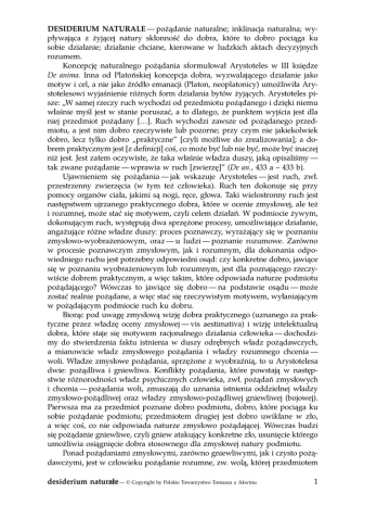 DESIDERIUM NATURALE — pożądanie naturalne; inklinacja naturalna; wypływająca z żyjącej natury skłonność do dobra, które to dobro pociąga ku sobie działanie; działanie chciane, kierowane w ludzkich aktach decyzyjnych rozumem. Koncepcję naturalnego pożądania sformułował Arystoteles w III księdze De anima. Inna od Platońskiej koncepcja dobra, wyzwalającego działanie jako motyw i cel, a nie jako źródło emanacji (Platon, neoplatonicy) umożliwiła Arystotelesowi wyjaśnienie różnych form działania bytów żyjących. Arystoteles pisze: „W samej rzeczy ruch wychodzi od przedmiotu pożądanego i dzięki niemu właśnie myśl jest w stanie poruszać, a to dlatego, że punktem wyjścia jest dla niej przedmiot pożądany […]. Ruch wychodzi zawsze od pożądanego przedmiotu, a jest nim dobro rzeczywiste lub pozorne; przy czym nie jakiekolwiek dobro, lecz tylko dobro „praktyczne” [czyli możliwe do zrealizowania]; a dobrem praktycznym jest [z definicji] coś, co może być lub nie być, może być inaczej niż jest. Jest zatem oczywiste, że taka właśnie władza duszy, jaką opisaliśmy — tak zwane pożądanie — wprawia w ruch [zwierzę]” (De an., 433 a – 433 b). Ujawnieniem się pożądania — jak wskazuje Arystoteles — jest ruch, zwł. przestrzenny zwierzęcia (w tym też człowieka). Ruch ten dokonuje się przy pomocy organów ciała, jakimi są nogi, ręce, głowa. Taki wielostronny ruch jest następstwem ujrzanego praktycznego dobra, które w ocenie zmysłowej, ale też i rozumnej, może stać się motywem, czyli celem działań. W podmiocie żywym, dokonującym ruch, występują dwa sprzężone procesy, umożliwiające działanie, angażujące różne władze duszy: proces poznawczy, wyrażający się w poznaniu zmysłowo-wyobrażeniowym, oraz — u ludzi — poznanie rozumowe. Zarówno w procesie poznawczym zmysłowym, jak i rozumnym, dla dokonania odpowiedniego ruchu jest potrzebny odpowiedni osąd: czy konkretne dobro, jawiące się w poznaniu wyobrażeniowym lub rozumnym, jest dla poznającego rzeczywiście dobrem praktycznym, a więc takim, które odpowiada naturze podmiotu pożądającego? Wówczas to jawiące się dobro — na podstawie osądu — może zostać realnie pożądane, a więc stać się rzeczywistym motywem, wyłaniającym w pożądającym podmiocie ruch ku dobru. Biorąc pod uwagę zmysłową wizję dobra praktycznego (uznanego za praktyczne przez władzę oceny zmysłowej — vis aestimativa) i wizję intelektualną dobra, które staje się motywem racjonalnego działania człowieka — dochodzimy do stwierdzenia faktu istnienia w duszy odrębnych władz pożądawczych, a mianowicie władz zmysłowego pożądania i władzy rozumnego chcenia — woli. Władze zmysłowe pożądania, sprzężone z wyobraźnią, to u Arystotelesa dwie: pożądliwa i gniewliwa. Konflikty pożądania, które powstają w następstwie różnorodności władz psychicznych człowieka, zwł. pożądań zmysłowych i chcenia — pożądania woli, zmuszają do uznania istnienia oddzielnej władzy zmysłowo-pożądliwej oraz władzy zmysłowo-pożądliwej gniewliwej (bojowej). Pierwsza ma za przedmiot poznane dobro podmiotu, dobro, które pociąga ku sobie pożądanie podmiotu; przedmiotem drugiej jest dobro uwikłane w zło, a więc coś, co nie odpowiada naturze zmysłowo pożądającej. Wówczas budzi się pożądanie gniewliwe, czyli gniew atakujący konkretne zło, usunięcie którego umożliwia osiągnięcie dobra stosownego dla zmysłowej natury podmiotu. Ponad pożądaniami zmysłowymi, zarówno gniewliwymi, jak i czysto pożądawczymi, jest w człowieku pożądanie rozumne, zw. wolą, której przedmiotem desiderium naturale PEF — © Copyright by Polskie Towarzystwo Tomasza z Akwinu 1 jest dobro jako dobro. Jest ono motywem działania i pobudzenia sił motorycznych człowieka. Osoba, poprzez akty poznania i chcenia, czyli akty organizujące się w decyzjach wolnej woli, konstytuuje się jako źródło osobowego działania. W tradycji filozofii klasycznej wyróżniono dwojakiego rodzaju akty woli przyporządkowane realnemu pożądaniu dobra: akty wyłonione naturalnie oraz akty nakazane. Akty wyłonione naturalnie mają za swoją bezpośrednią przyczynę samą wolę, i dlatego nazywają się aktami dobrowolnymi; są przyporządkowane dobru jako celowi, który jest motywem wyłonienia się tych aktów. Aktem wyłonionym przez wolę jest miłość, która może przybierać różne formy, w zależności od charakteru konkretnego dobra, ku któremu zmierza, np. formę tęsknoty, radości, nienawiści, smutku, nadziei, rozpaczy, trwogi, gniewu. Akty tak rozumianej miłości występują w człowieku wraz z odpowiednimi aktami uczuć zmysłowych (dały one nazwy różnym formom miłości jako aktom woli). Wyłonione przez wolę akty naturalne mają za swój formalny (gatunkujący) przedmiot dobro, które w warunkach konkretnego działania jest zawsze dobrem konkretnym, „takim oto” dobrem, które jako realnie istniejące samo w sobie jest dobrem na miarę swego istnienia. Dlatego w takiej mierze, w jakiej istnieje, jest dobrem jako dobro. Istnienie bytu przygodnego jest „otrzymane”, jest pochodne, partycypujące w istnieniu Bytu, który Jest istnieniem, stąd siła pociągania dobra jest siłą uczestniczącą w Dobru Pierwszym. Konkretnie chciane — pożądane dobra, suponujące, że ze względu na swą ontyczną strukturę (akt istnienia „darowanego”) dobro jako dobro, które pierwotnie jawi się w naszym poznaniu intelektualnym jako dobro w swej analogicznej ogólności (analogia jest konkretystyczną generalizacją!) — dobro tak rozumiane „gatunkuje”, różnicuje wolę jako jej formalny przedmiot, tak jak byt „gatunkuje” ludzki intelekt. Owo dobro, w swej analogicznej „ogólności” będąc przedmiotem naturalnych aktów woli, bezpośrednio przez nią wyłonionych, stoi u podstaw przeżycia zw. „szczęściem w ogólnoś