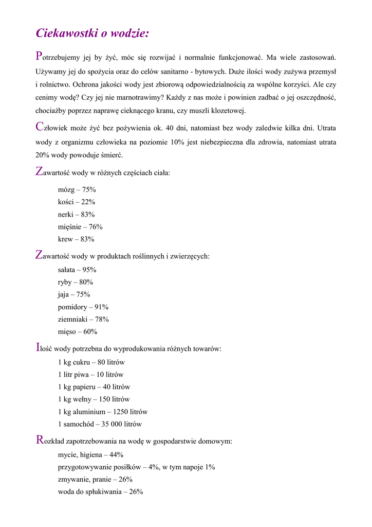 Ciekawostki o wodzie: Potrzebujemy jej by żyć, móc się rozwijać i normalnie funkcjonować. Ma wiele zastosowań. Używamy jej do spożycia oraz do celów sanitarno - bytowych. Duże ilości wody zużywa przemysł i rolnictwo. Ochrona jakości wody jest zbiorową odpowiedzialnością za wspólne korzyści. Ale czy cenimy wodę? Czy jej nie marnotrawimy? Każdy z nas może i powinien zadbać o jej oszczędność, chociażby poprzez naprawę cieknącego kranu, czy muszli klozetowej. Człowiek może żyć bez pożywienia ok. 40 dni, natomiast bez wody zaledwie kilka dni. Utrata wody z organizmu człowieka na poziomie 10% jest niebezpieczna dla zdrowia, natomiast utrata 20% wody powoduje śmierć. Zawartość wody w różnych częściach ciała: mózg – 75% kości – 22% nerki – 83% mięśnie – 76% krew – 83% Zawartość wody w produktach roślinnych i zwierzęcych: sałata – 95% ryby – 80% jaja – 75% pomidory – 91% ziemniaki – 78% mięso – 60% Ilość wody potrzebna do wyprodukowania różnych towarów: 1 kg cukru – 80 litrów 1 litr piwa – 10 litrów 1 kg papieru – 40 litrów 1 kg wełny – 150 litrów 1 kg aluminium – 1250 litrów 1 samochód – 35 000 litrów Rozkład zapotrzebowania na wodę w gospodarstwie domowym: mycie, higiena – 44% przygotowywanie posiłków – 4%, w tym napoje 1% zmywanie, pranie – 26% woda do spłukiwania – 26% Obieg wody w przyrodzie: Chmury, śniegi, deszcze, źródła, rzeki, jeziora, morza lub oceany: z ziemi do nieba i z nieba do ziemi – jest to ciągle ta sama woda, która bezustannie zmienia formę, ale która na szczęście nigdy nie ginie. Sporządził: Oddział Higieny Komunalnej Wojewódzkiej Stacji Sanitarno – Epidemiologicznej w Gdańsku 16 marca 2011r.