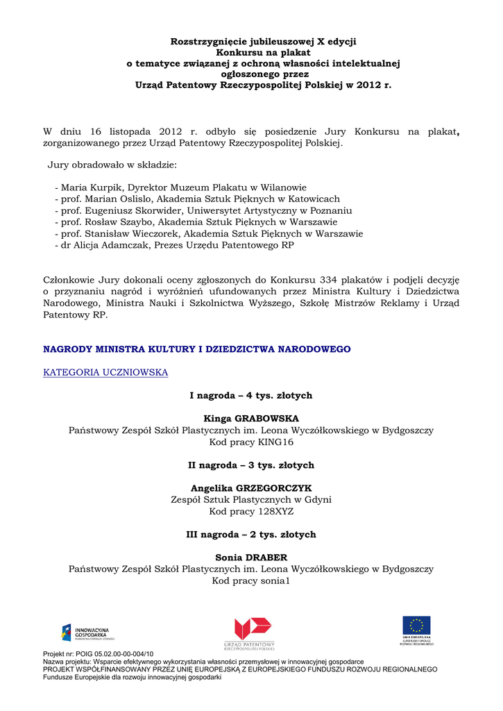 Rozstrzygnięcie jubileuszowej X edycji Konkursu na plakat o tematyce związanej z ochroną własności intelektualnej ogłoszonego przez Urząd Patentowy Rzeczypospolitej Polskiej w 2012 r. W dniu 16 listopada 2012 r. odbyło się posiedzenie Jury Konkursu na plakat, zorganizowanego przez Urząd Patentowy Rzeczypospolitej Polskiej. Jury obradowało w składzie: - Maria Kurpik, Dyrektor Muzeum Plakatu w Wilanowie - prof. Marian Oslislo, Akademia Sztuk Pięknych w Katowicach - prof. Eugeniusz Skorwider, Uniwersytet Artystyczny w Poznaniu - prof. Rosław Szaybo, Akademia Sztuk Pięknych w Warszawie - prof. Stanisław Wieczorek, Akademia Sztuk Pięknych w Warszawie - dr Alicja Adamczak, Prezes Urzędu Patentowego RP Członkowie Jury dokonali oceny zgłoszonych do Konkursu 334 plakatów i podjęli decyzję o przyznaniu nagród i wyróżnień ufundowanych przez Ministra Kultury i Dziedzictwa Narodowego, Ministra Nauki i Szkolnictwa Wyższego, Szkołę Mistrzów Reklamy i Urząd Patentowy RP. NAGRODY MINISTRA KULTURY I DZIEDZICTWA NARODOWEGO KATEGORIA UCZNIOWSKA I nagroda – 4 tys. złotych Kinga GRABOWSKA Państwowy Zespół Szkół Plastycznych im. Leona Wyczółkowskiego w Bydgoszczy Kod pracy KING16 II nagroda – 3 tys. złotych Angelika GRZEGORCZYK Zespół Sztuk Plastycznych w Gdyni Kod pracy 128XYZ III nagroda – 2 tys. złotych Sonia DRABER Państwowy Zespół Szkół Plastycznych im. Leona Wyczółkowskiego w Bydgoszczy Kod pracy sonia1 Projekt nr: POIG 05.02.00-00-004/10 Nazwa projektu: Wsparcie efektywnego wykorzystania własności przemysłowej w innowacyjnej gospodarce PROJEKT WSPÓŁFINANSOWANY PRZEZ UNIĘ EUROPEJSKĄ Z EUROPEJSKIEGO FUNDUSZU ROZWOJU REGIONALNEGO Fundusze Europejskie dla rozwoju innowacyjnej gospodarki 3 równorzędne wyróżnienia w wysokości 1 tys. złotych Magdalena BOJDO Państwowy Zespół Szkół Plastycznych im. Leona Wyczółkowskiego w Bydgoszczy Kod pracy 358967 Paweł GOJOWY Państwowy Zespół Szkół Plastycznych im. Leona Wyczółkowskiego w Bydgoszczy Kod pracy 58ABC2 Jagoda JĘCIKOWSKA Liceum Plastyczne im. Piotra Potworowskiego w Poznaniu Kod pracy JJ0406 KATEGORIA STUDENCKA I nagroda – 4 tys. złotych Marta CZAUDERNA – Akademia Sztuk Pięknych w Gdańsku Kod pracy B613FG II nagroda – 3 tys. złotych Angelika RYCHERT – Akademia Sztuk Pięknych w Gdańsku Kod pracy NGRHT7 III nagroda – decyzją Jury nie została przyznana KATEGORIA ZAMKNIĘTA I nagroda – 4 tys. złotych Kamil BANACH – Poznań Kod pracy NO1176 II nagroda – 3 tys. złotych Anna ŻUKOWSKA-ZYŚKO – Lublin Kod pracy 01625A III nagroda – 2 tys. złotych Joanna FRYDRYCHOWICZ i Krzysztof SKRZYPCZYK – Toruń Kod pacy BBXXZZ Projekt nr: POIG 05.02.00-00-004/10 Nazwa projektu: Wsparcie efektywnego wykorzystania własności przemysłowej w innowacyjnej gospodarce PROJEKT WSPÓŁFINANSOWANY PRZEZ UNIĘ EUROPEJSKĄ Z EUROPEJSKIEGO FUNDUSZU ROZWOJU REGIONALNEGO Fundusze Europejskie dla rozwoju innowacyjnej gospodarki 2 równorzędne wyróżnienia w wysokości 1 tys. złotych Maciej MYTNIK – Łysa Góra Kod pracy 672948 Agnieszka POPEK-BANACH – Poznań Kod pracy 130908 KATEGORIA OTWARTA Decyzją Jury w kategorii otwartej nagrody nie zostały przyznane WYRÓŻNIENIA MINISTRA NAUKI I SZKOLNICTWA WYŻSZEGO KATEGORIA STUDENCKA 2 równorzędne wyróżnienia w wysokości 1tys. złotych Anna KUKOWSKA – Uniwersytet Mikołaja Kopernika w Toruniu Kod pracy A6180B Tina MROCZKOWSKA – Uniwersytet Mikołaja Kopernika w Toruniu Kod pracy TTT321 WYRÓŻNIENIE PREZESA URZĘDU PATENTOWEGO RP Wyróżnienie w wysokości 1 tys. złotych Dominik ŁYSZCZARZ Lubelska Szkoła Sztuki i Projektowania Kod pracy DM4701 NAGRODA SZKOŁY MISTRZÓW REKLAMY roczne stypendium o wartości 12 tys zl. na kursie copywriting / art direction dla ucznia Państwowego Zespołu Szkół Plastycznych im. Leona Wyczółkowskiego w Bydgoszczy Projekt nr: POIG 05.02.00-00-004/10 Nazwa projektu: Wsparcie efektywnego wykorzystania własności przemysłowej w innowacyjnej gospodarce PROJEKT WSPÓŁFINANSOWANY PRZEZ UNIĘ EUROPEJSKĄ Z EUROPEJSKIEGO FUNDUSZU ROZWOJU REGIONALNEGO Fundusze Europejskie dla rozwoju innowacyjnej gospodarki