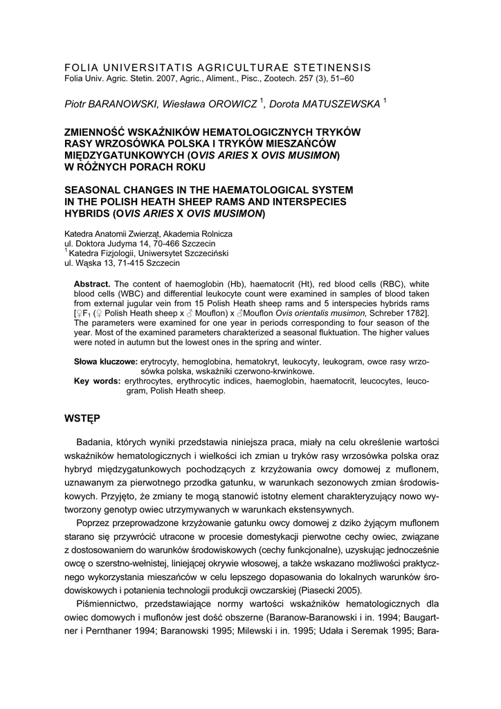 FOLIA UNIVERSITATIS AGRICULTURAE STETINENSIS Folia Univ. Agric. Stetin. 2007, Agric., Aliment., Pisc., Zootech. 257 (3), 51–60 Piotr BARANOWSKI, Wiesława OROWICZ 1, Dorota MATUSZEWSKA 1 ZMIENNOŚĆ WSKAŹNIKÓW HEMATOLOGICZNYCH TRYKÓW RASY WRZOSÓWKA POLSKA I TRYKÓW MIESZAŃCÓW MIĘDZYGATUNKOWYCH (OVIS ARIES X OVIS MUSIMON) W RÓŻNYCH PORACH ROKU SEASONAL CHANGES IN THE HAEMATOLOGICAL SYSTEM IN THE POLISH HEATH SHEEP RAMS AND INTERSPECIES HYBRIDS (OVIS ARIES X OVIS MUSIMON) Katedra Anatomii Zwierząt, Akademia Rolnicza ul. Doktora Judyma 14, 70-466 Szczecin 1 Katedra Fizjologii, Uniwersytet Szczeciński ul. Wąska 13, 71-415 Szczecin Abstract. The content of haemoglobin (Hb), haematocrit (Ht), red blood cells (RBC), white blood cells (WBC) and differential leukocyte count were examined in samples of blood taken from external jugular vein from 15 Polish Heath sheep rams and 5 interspecies hybrids rams [♀F1 (♀ Polish Heath sheep x ♂ Mouflon) x ♂Mouflon Ovis orientalis musimon, Schreber 1782]. The parameters were examined for one year in periods corresponding to four season of the year. Most of the examined parameters charakterized a seasonal fluktuation. The higher values were noted in autumn but the lowest ones in the spring and winter. Słowa kluczowe: erytrocyty, hemoglobina, hematokryt, leukocyty, leukogram, owce rasy wrzosówka polska, wskaźniki czerwono-krwinkowe. Key words: erythrocytes, erythrocytic indices, haemoglobin, haematocrit, leucocytes, leucogram, Polish Heath sheep. WSTĘP Badania, których wyniki przedstawia niniejsza praca, miały na celu określenie wartości wskaźników hematologicznych i wielkości ich zmian u tryków rasy wrzosówka polska oraz hybryd międzygatunkowych pochodzących z krzyżowania owcy domowej z muflonem, uznawanym za pierwotnego przodka gatunku, w warunkach sezonowych zmian środowiskowych. Przyjęto, że zmiany te mogą stanowić istotny element charakteryzujący nowo wytworzony genotyp owiec utrzymywanych w warunkach ekstensywnych. Poprzez przeprowadzone krzyżowanie gatunku owcy domowej z dziko żyjącym muflonem starano się przywrócić utracone w procesie domestykacji pierwotne cechy owiec, związane z dostosowaniem do warunków środowiskowych (cechy funkcjonalne), uzyskując jednocześnie owcę o szerstno-wełnistej, liniejącej okrywie włosowej, a także wskazano możliwości praktycznego wykorzystania mieszańców w celu lepszego dopasowania do lokalnych warunków środowiskowych i potanienia technologii produkcji owczarskiej (Piasecki 2005). Piśmiennictwo, przedstawiające normy wartości wskaźników hematologicznych dla owiec domowych i muflonów jest dość obszerne (Baranow-Baranowski i in. 1994; Baugartner i Pernthaner 1994; Baranowski 1995; Milewski i in. 1995; Udała i Seremak 1995; Bara- 52 P. Baranowski i in. nowski i in. 1997; Baranowski i Kmieć 1997; Baranowski i Grzesiak 1999; Peinado i in. 1999; Udała i in. 2000; Mostaghni i in. 2005), ale brakuje w nim publikacji nt. materiału pochodzącego z hybrydyzacji, co uzasadnia celowość przeprowadzenia omawianych badań. Wyniki badań, przeprowadzanych na różnych gatunkach zwierząt i ludziach, wskazują na związek między wartością wskaźników hematologicznych a ciśnieniem barometrycznym, temperaturą powietrza oraz długością dnia jako czynnikiem środowiska zwiększającym aktywność zwierząt (Hock 1964; Tromp 1973; Gill 1982; Mehrotra i Gupta 1989; Yoneyama i in. 1999). Ponieważ muflony, jak wszystkie zwierzęta żyjące na wolności, charakteryzują się zdolnością do zmiany tempa procesów rozwojowych oraz reagują intensywniej i szerszym zakresem anatomicznych i fizjologicznych mechanizmów adaptacji na sezonowe zmiany warunków środowiskowych, wyrażonych m.in. gromadzeniem tłuszczu na okres zimowy, dwukrotną w ciągu roku zmianą okrywy włosowej (Hawkey i in. 1984; Lincoln 1998; Goldman 1999; Santiago-Moreno i in. 2005), postanowiono poddać analizie profil hematologiczny nowo tworzonego genotypu, uwzględniając różne pory roku. MATERIAŁ I METODY Materiałem do badań była krew pełna jednorocznych tryków rasy wrzosówka polska (n=15) oraz tryków mieszańców międzygatunkowych (n=5) z 75-procentowym udziałem genotypu muflona – ♀F1 (♀ wrzosówka polska x ♂ muflon) x ♂muflon Ovis orientalis musimon (Schreber 1782). Wszystkie osobniki utrzymywane były w tych samych warunkach właściwego dla owiec dobrostanu owczarni Ośrodka Hodowli Zarodowej w Lubianie – w gospodarstwie rolnym Boguszyny (53°06’N, 15°20’E). Tryki przebywały w owczarni na głębokiej ściółce, z nieograniczonym dostępem do naturalnego fotoperiodu, o utwardzonym, betonowym podłożu i wybiegach o powierzchni około 500 m2. Ich żywienie odbywało się z wykorzystaniem pasz gospodarskich, w skład których wchodziły w okresie zimy: kiszonka z traw, kiszonka z kukurydzy, okopowe korzeniowe – głównie buraki półcukrowe, siano łąkowe, słoma z roślin motylkowych, słoma owsiana i jęczmienna. W okresie lata żywienie oparte było na koszonej zielonce z traw, sianie łąkowym i słomie owsianej. Przez cały czas badań tryki były objęte rutynową opieką weterynaryjną i miały swobodny dostęp do lizawek oraz wody. Krew, w ilości około 30 ml od każdego tryka, pobierano do analiz, w warunkach zminimalizowanego stresu, z żyły szyjnej zewnętrznej, w okresie odpowiadającym przełomowi każdej z czterech pór roku, w ciągu roku. W celu wyeliminowania zmienności dobowej krew pobierano w stałych godzinach rannych (między 6,30 a 7,30). Dla uniknięcia zmian wynikających z karmienia trykom w dniu poprzedzającym pobieranie krwi podawano tylko siano i zapewniono swobodny dostęp do wody. Zastosowanym antykoagulantem była heparyna (Heparinum-Jelfa, 500 j.m.). W pełnej krwi oznaczono: stężenie Hb – metodą z zastosowaniem odczynnika Drabkina, wartość wskaźnika Ht – metodą mikrohematokrytową przy użyciu wirówki MPW-3