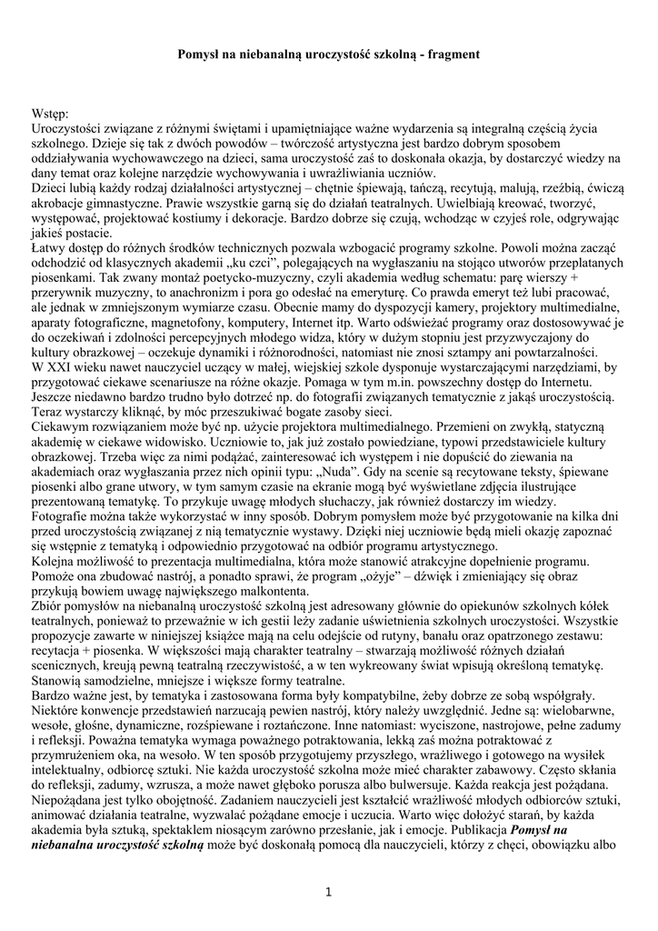 Pomysł na niebanalną uroczystość szkolną - fragment Wstęp: Uroczystości związane z różnymi świętami i upamiętniające ważne wydarzenia są integralną częścią życia szkolnego. Dzieje się tak z dwóch powodów – twórczość artystyczna jest bardzo dobrym sposobem oddziaływania wychowawczego na dzieci, sama uroczystość zaś to doskonała okazja, by dostarczyć wiedzy na dany temat oraz kolejne narzędzie wychowywania i uwrażliwiania uczniów. Dzieci lubią każdy rodzaj działalności artystycznej – chętnie śpiewają, tańczą, recytują, malują, rzeźbią, ćwiczą akrobacje gimnastyczne. Prawie wszystkie garną się do działań teatralnych. Uwielbiają kreować, tworzyć, występować, projektować kostiumy i dekoracje. Bardzo dobrze się czują, wchodząc w czyjeś role, odgrywając jakieś postacie. Łatwy dostęp do różnych środków technicznych pozwala wzbogacić programy szkolne. Powoli można zacząć odchodzić od klasycznych akademii „ku czci”, polegających na wygłaszaniu na stojąco utworów przeplatanych piosenkami. Tak zwany montaż poetycko-muzyczny, czyli akademia według schematu: parę wierszy + przerywnik muzyczny, to anachronizm i pora go odesłać na emeryturę. Co prawda emeryt też lubi pracować, ale jednak w zmniejszonym wymiarze czasu. Obecnie mamy do dyspozycji kamery, projektory multimedialne, aparaty fotograficzne, magnetofony, komputery, Internet itp. Warto odświeżać programy oraz dostosowywać je do oczekiwań i zdolności percepcyjnych młodego widza, który w dużym stopniu jest przyzwyczajony do kultury obrazkowej – oczekuje dynamiki i różnorodności, natomiast nie znosi sztampy ani powtarzalności. W XXI wieku nawet nauczyciel uczący w małej, wiejskiej szkole dysponuje wystarczającymi narzędziami, by przygotować ciekawe scenariusze na różne okazje. Pomaga w tym m.in. powszechny dostęp do Internetu. Jeszcze niedawno bardzo trudno było dotrzeć np. do fotografii związanych tematycznie z jakąś uroczystością. Teraz wystarczy kliknąć, by móc przeszukiwać bogate zasoby sieci. Ciekawym rozwiązaniem może być np. użycie projektora multimedialnego. Przemieni on zwykłą, statyczną akademię w ciekawe widowisko. Uczniowie to, jak już zostało powiedziane, typowi przedstawiciele kultury obrazkowej. Trzeba więc za nimi podążać, zainteresować ich występem i nie dopuścić do ziewania na akademiach oraz wygłaszania przez nich opinii typu: „Nuda”. Gdy na scenie są recytowane teksty, śpiewane piosenki albo grane utwory, w tym samym czasie na ekranie mogą być wyświetlane zdjęcia ilustrujące prezentowaną tematykę. To przykuje uwagę młodych słuchaczy, jak również dostarczy im wiedzy. Fotografie można także wykorzystać w inny sposób. Dobrym pomysłem może być przygotowanie na kilka dni przed uroczystością związanej z nią tematycznie wystawy. Dzięki niej uczniowie będą mieli okazję zapoznać się wstępnie z tematyką i odpowiednio przygotować na odbiór programu artystycznego. Kolejna możliwość to prezentacja multimedialna, która może stanowić atrakcyjne dopełnienie programu. Pomoże ona zbudować nastrój, a ponadto sprawi, że program „ożyje” – dźwięk i zmieniający się obraz przykują bowiem uwagę największego malkontenta. Zbiór pomysłów na niebanalną uroczystość szkolną jest adresowany głównie do opiekunów szkolnych kółek teatralnych, ponieważ to przeważnie w ich gestii leży zadanie uświetnienia szkolnych uroczystości. Wszystkie propozycje zawarte w niniejszej książce mają na celu odejście od rutyny, banału oraz opatrzonego zestawu: recytacja + piosenka. W większości mają charakter teatralny – stwarzają możliwość różnych działań scenicznych, kreują pewną teatralną rzeczywistość, a w ten wykreowany świat wpisują określoną tematykę. Stanowią samodzielne, mniejsze i większe formy teatralne. Bardzo ważne jest, by tematyka i zastosowana forma były kompatybilne, żeby dobrze ze sobą współgrały. Niektóre konwencje przedstawień narzucają pewien nastrój, który należy uwzględnić. Jedne są: wielobarwne, wesołe, głośne, dynamiczne, rozśpiewane i roztańczone. Inne natomiast: wyciszone, nastrojowe, pełne zadumy i refleksji. Poważna tematyka wymaga poważnego potraktowania, lekką zaś można potraktować z przymrużeniem oka, na wesoło. W ten sposób przygotujemy przyszłego, wrażliwego i gotowego na wysiłek intelektualny, odbiorcę sztuki. Nie każda uroczystość szkolna może mieć charakter zabawowy. Często skłania do refleksji, zadumy, wzrusza, a może nawet głęboko porusza albo bulwersuje. Każda reakcja jest pożądana. Niepożądana jest tylko obojętność. Zadaniem nauczycieli jest kształcić wrażliwość młodych odbiorców sztuki, animować działania teatralne, wyzwalać pożądane emocje i uczucia. Warto więc dołożyć starań, by każda akademia była sztuką, spektaklem niosącym zarówno przesłanie, jak i emocje. Publikacja Pomysł na niebanalna uroczystość szkolną może być doskonałą pomocą dla nauczycieli, którzy z chęci, obowiązku albo 1 nawet przymusu przygotowują szkolne programy artystyczne. Od 20 lat zajmuję się animacją szkolnych działań teatralnych, co daje mi radość i satysfakcję, ale przysparza też wielu stresów. Współpracuję z Powiatowym Ośrodkiem Doskonalenia Nauczycieli w Lublinie, gdzie pełnię rolę doradcy metodycznego w zakresie teatru szkolnego. Jestem świadoma problemów, z jakimi borykają się nauczyciele (np. niedostatki repertuarowe, brak nowych propozycji, niski poziom niektórych publikacji internetowych, trudności w pisaniu własnych tekstów). Podczas warsztatów metodycznych zdarza mi się słyszeć, że dla niektórych nauczycieli obowiązek przygotowania akademii to przykra konieczność. Pozwala mi to sądzić, że Pomysł na niebanalną uroczystość szkolną jest pozycją potrzebną. Przedstawione w k
