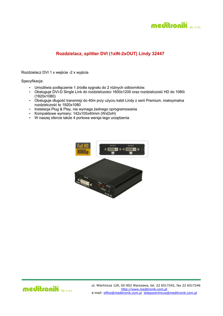 Rozdzielacz, splitter DVI (1xIN-2xOUT) Lindy 32447 Rozdzielacz DVI 1 x wejście -2 x wyjścia Specyfikacja: • • • • • • Umożliwia podłączenie 1 źródła sygnału do 2 różnych odbiorników. Obsługuje DVI-D Single Link do rozdzielczości 1600x1200 oraz rozdzielczość HD do 1080i (1920x1080) Obsługuje długość transmisji do 40m przy użyciu kabli Lindy z serii Premium, maksymalna rozdzielczość to 1920x1080 Instalacja Plug & Play, nie wymaga żadnego oprogramowania Kompaktowe wymiary: 142x105x40mm (WxDxH) W naszej ofercie także 4 portowa wersja tego urządzenia ul. Wiertnicza 129, 02-952 Warszawa, tel. 22 6517242, fax 22 6517246 http://www.meditronik.com.pl e-mail: [email protected] [email protected]