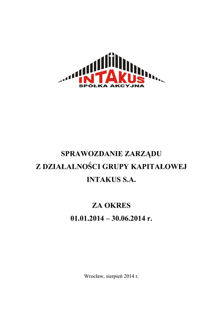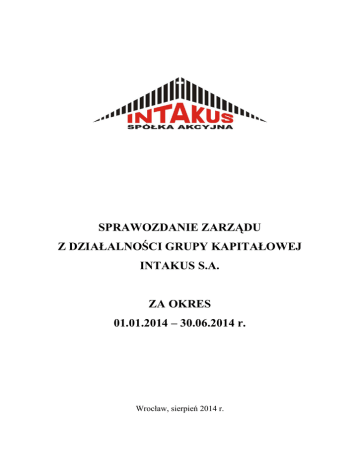 SPRAWOZDANIE ZARZĄDU Z DZIAŁALNOŚCI GRUPY KAPITAŁOWEJ INTAKUS S.A. ZA OKRES 01.01.2014 – 30.06.2014 r. Wrocław, sierpień 2014 r. Sprawozdanie Zarządu z działalności GRUPY KAPITAŁOWEJ INTAKUS S.A. za okres od 01.01.2014r. do 30.06.2014r. SPIS TREŚCI: 1. Wprowadzenie do sprawozdania ..................................................................................... 3 2. Podstawowe informacje o Grupie Kapitałowej .............................................................. 3 2.1. Dane rejestracyjne i adresowe podmiotu dominującego ....................................... 3 2.2. Informacje o powiązaniach kapitałowych lub organizacyjnych z innymi podmiotami ........................................................................................................................... 4 2.3. Podstawowe informacje o spółkach zależnych ........................................................ 4 2.4. Przedmiot działalności Grupy Kapitałowej ............................................................ 5 2.5. Kapitał zakładowy podmiotu dominującego ........................................................... 7 2.6. Rada Nadzorcza ....................................................................................................... 25 2.7. Zarząd ....................................................................................................................... 27 2.8. Rekompensaty dla osób zarządzających w przypadku rezygnacji lub zwolnienia z zajmowanego stanowiska bez ważnej przyczyny .......................................................... 29 3. Podstawowe dane ekonomiczno-finansowe Grupy Kapitałowej INTAKUS S.A. za I półrocze 2014 roku .......................................................................................................... 29 4. Charakterystyka działalności w I półroczu 2014 roku ................................................ 30 5. Najważniejsi odbiorcy w I półroczu 2014 roku ............................................................ 31 6. Budowy o największym poziomie przerobu w I półroczu 2014 roku ......................... 32 7. Najważniejsi dostawcy w I półroczu 2014 roku ........................................................... 32 8. Zawarte znaczące umowy i umowy zawarte pomiędzy akcjonariuszami .................. 32 9. Transakcje z podmiotami powiązanymi ....................................................................... 37 10. Informacje o zaciągniętych i wypowiedzianych umowach dotyczących kredytów i pożyczek ................................................................................................................................ 37 11. Informacje o udzielonych pożyczkach, poręczeniach i gwarancjach ......................... 38 12. Sprawy sądowe ................................................................................................................ 38 13. Istotne czynniki ryzyka................................................................................................... 38 14. Emisja akcji i wykorzystanie wpływów z emisji .......................................................... 40 15. Informacja dotycząca prognozy wyników .................................................................... 41 16. Zarządzanie zasobami finansowymi ............................................................................. 41 17. Ocena czynników nietypowych i zdarzeń mających wpływ na wynik ....................... 42 18. Charakterystyka zewnętrznych i wewnętrznych czynników istotnych dla rozwoju Spółki oraz opis perspektyw rozwoju działalności .............................................................. 42 19. Zmiany w podstawowych zasadach zarządzania w Grupie Kapitałowej .................. 43 20. Liczba i wartość nominalna wszystkich akcji INTAKUS SA będących w posiadaniu osób nadzorujących i zarządzających .................................................................................. 43 21. Informacje o znanych umowach, w wyniku których mogą w przyszłości nastąpić zmiany w proporcjach posiadanych akcji przez dotychczasowych akcjonariuszy ......... 43 22. Informacje o systemie kontroli programów akcji pracowniczych ............................. 43 23. Informacje o dacie zawarcia umowy z podmiotem uprawnionym do przeglądu sprawozdań finansowych, wynagrodzeniu za przegląd za I półrocze 2014 ...................... 44 24. Pozycje pozabilansowe.................................................................................................... 44 2 Sprawozdanie Zarządu z działalności GRUPY KAPITAŁOWEJ INTAKUS S.A. za okres od 01.01.2014r. do 30.06.2014r. 1. Wprowadzenie do sprawozdania Sprawozdanie Zarządu z działalności Grupy Kapitałowej INTAKUS za I półrocze 2014 roku zostało przygotowane przy zastosowaniu zasad rachunkowości, zgodnie z Międzynarodowymi Standardami Sprawozdawczości Finansowej, które zostały zatwierdzone przez Unię Europejska oraz w zakresie wymaganym przez rozporządzenie Ministra Finansów z dnia 19 lutego 2009 roku w sprawie informacji bieżących i okresowych przekazywanych przez emitentów papierów wartościowych (Dz. U. Nr 33, poz. 259). 2. Podstawowe informacje o Grupie Kapitałowej 2.1. Dane rejestracyjne i adresowe podmiotu dominującego Podmiot dominujący Grupy Kapitałowej działa pod nazwą INTAKUS Spółka Akcyjna (nazwa skrócona INTAKUS S.A.) i jest wpisany do rejestru przedsiębiorców Krajowego Rejestru Sądowego prowadzonego przez Sąd Rejonowy dla Wrocławia Fabrycznej we Wrocławiu, VI Wydział Gospodarczy, pod numerem 0000292030. Podmiot dominujący powstał w wyniku podjętej w dniu 27 września 2007 roku przez Walne Zgromadzenie Akcjonariuszy uchwały w sprawie przekształcenia INTAKUS – BART Sp. z o.o. w spółkę akcyjną. W dniu 31 października 2007 roku, powstały w wyniku przekształcenia nowy podmiot, INTAKUS S.A. został wpisany do rejestru przedsiębiorców Krajowego Rejestru Sądowego.