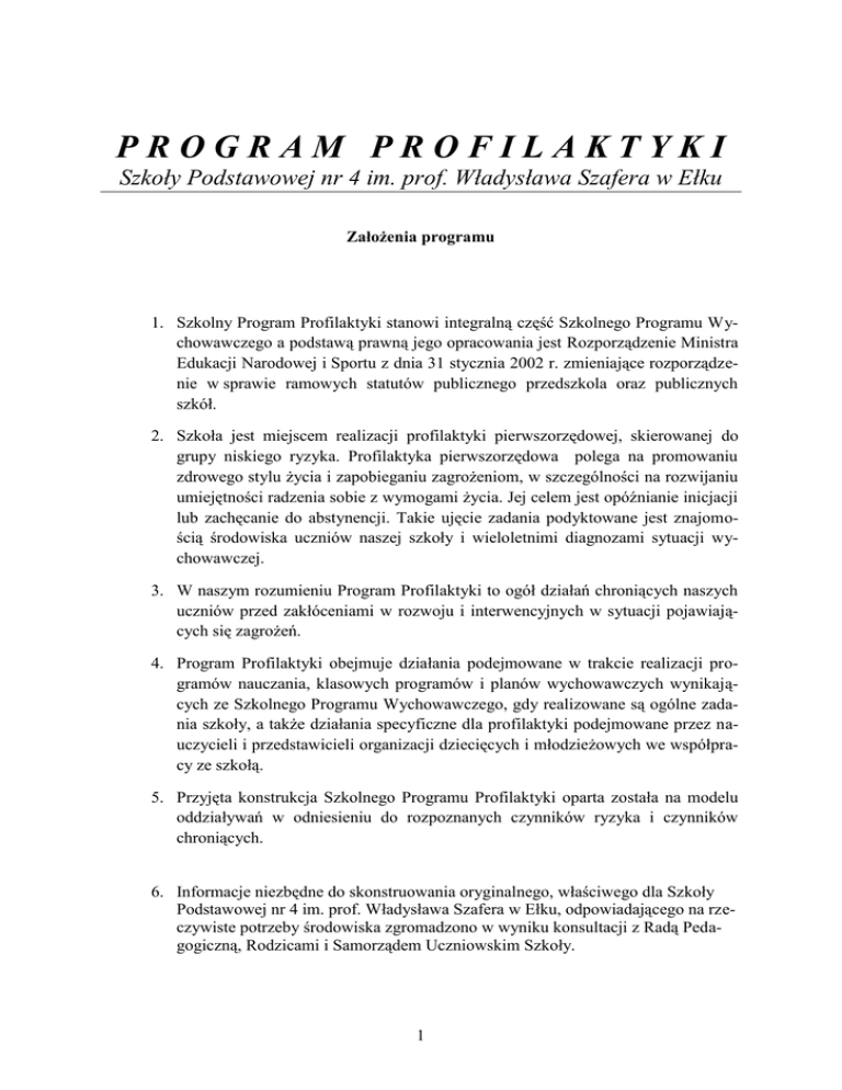 PROGRAM PROFILAKTYKI Szkoły Podstawowej nr 4 im. prof. Władysława Szafera w Ełku Założenia programu 1. Szkolny Program Profilaktyki stanowi integralną część Szkolnego Programu Wychowawczego a podstawą prawną jego opracowania jest Rozporządzenie Ministra Edukacji Narodowej i Sportu z dnia 31 stycznia 2002 r. zmieniające rozporządzenie w sprawie ramowych statutów publicznego przedszkola oraz publicznych szkół. 2. Szkoła jest miejscem realizacji profilaktyki pierwszorzędowej, skierowanej do grupy niskiego ryzyka. Profilaktyka pierwszorzędowa polega na promowaniu zdrowego stylu życia i zapobieganiu zagrożeniom, w szczególności na rozwijaniu umiejętności radzenia sobie z wymogami życia. Jej celem jest opóźnianie inicjacji lub zachęcanie do abstynencji. Takie ujęcie zadania podyktowane jest znajomością środowiska uczniów naszej szkoły i wieloletnimi diagnozami sytuacji wychowawczej. 3. W naszym rozumieniu Program Profilaktyki to ogół działań chroniących naszych uczniów przed zakłóceniami w rozwoju i interwencyjnych w sytuacji pojawiających się zagrożeń. 4. Program Profilaktyki obejmuje działania podejmowane w trakcie realizacji programów nauczania, klasowych programów i planów wychowawczych wynikających ze Szkolnego Programu Wychowawczego, gdy realizowane są ogólne zadania szkoły, a także działania specyficzne dla profilaktyki podejmowane przez nauczycieli i przedstawicieli organizacji dziecięcych i młodzieżowych we współpracy ze szkołą. 5. Przyjęta konstrukcja Szkolnego Programu Profilaktyki oparta została na modelu oddziaływań w odniesieniu do rozpoznanych czynników ryzyka i czynników chroniących. 6. Informacje niezbędne do skonstruowania oryginalnego, właściwego dla Szkoły Podstawowej nr 4 im. prof. Władysława Szafera w Ełku, odpowiadającego na rzeczywiste potrzeby środowiska zgromadzono w wyniku konsultacji z Radą Pedagogiczną, Rodzicami i Samorządem Uczniowskim Szkoły. 1 Kompetencje grup uczestniczących w opracowaniu i realizacji Programu Profilaktyki Rada Pedagogiczna Określa zadania w zakresie profilaktyki tworząc Szkolny Program Profilaktyki. Określa zapotrzebowanie na realizację programów profilaktycznych. Dokonuje analizy działalności profilaktycznej. Nauczyciele Współpracują z wychowawcami klas w realizacji zadań profilaktycznych. Wykonują zalecenia zawarte w orzeczeniach wydanych przez PPP. Doskonalą kwalifikacje i zdobywają nowe umiejętności w zakresie działań profilaktycznych. Wychowawca klasy Integruje zespół klasowy. Dba o poczucie bezpieczeństwa i akceptacji ucznia w klasie. Wyposaża uczniów w umiejętności radzenia sobie w trudnych sytuacjach. Realizuje zadania w zakresie profilaktyki we współpracy z rodzicami uczniów. Pedagog szkoły Rozpoznaje indywidualne potrzeby uczniów oraz analizuje przyczyny niepowodzeń szkolnych. Określa formy i sposoby udzielania uczniom, w tym uczniom z wybitnymi uzdolnieniami, pomocy psychologiczno-pedagogicznej, odpowiednio do rozpoznanych potrzeb. Organizuje i prowadzi różne formy pomocy psychologiczno-pedagogicznej dla uczniów, rodziców i nauczycieli. Podejmuje działania profilaktyczno-wychowawcze wynikające ze Szkolnego Programu Wychowawczego i Programu Profilaktyki w stosunku do uczniów, z udziałem rodziców i nauczycieli. Wspiera działania opiekuńczo-wychowawcze nauczycieli, wynikające z przyjętego Programu. Rada Rodziców Opiniuje Szkolny Program Profilaktyki. Analizuje i diagnozuje opinie rodziców na temat profilaktyki przekazując je dyrektorowi. Współpracuje z Radą Pedagogiczną, dyrektorem, Samorządem Uczniowskim. 2 Rodzice Współuczestniczą w tworzeniu i realizacji zadań Szkolnego Programu Profilaktyki. Przedstawiają Radzie Rodziców opinie na temat profilaktyki. Korzystają z pomocy i wsparcia ze strony pedagoga i szkolnej służby zdrowia w zakresie profilaktyki. Wnioskują do odpowiednich organów i instytucji w sprawach kształcenia specjalnego, nauczania indywidualnego, zajęć rewalidacyjno-wychowawczych. Dyrektor szkoły Inicjuje i organizuje przedsięwzięcia wynikające ze Szkolnego Programu Profilaktyki. Monitoruje pracę wychowawców klas i pedagoga w zakresie profilaktyki. Diagnozuje oczekiwania uczniów i rodziców w zakresie profilaktyki. Współpracuje z podmiotami szkoły oraz instytucjami wspomagającymi działania z zakresu profi-laktyki.. Organ prowadzący –Gmina Miasto Ełk Decyduje o zatrudnianiu i wymiarze czasu pracy pedagoga, psychologa, innych pedagogów wspierających rozwój dziecka. Poprzez akceptację założeń projektu organizacyjnego szkoły tworzy warunki do realizacji działań proflaktycznych. Współuczestniczy w wyposażaniu szkoły w pomoce dydaktyczne, środki niezbędne do realizacji Programu. Zasady oddziaływań profilaktycznych Realizacja Szkolnego Programu Profilaktyki zakłada przestrzeganie następujących zasad: 1. Zasada bezpieczeństwa uczestników przejawia się w respektowaniu podmiotowości wszystkich uczestników procesu oddziaływań profilaktycznych, wzajemnym poszanowaniu ich godności i indywidualności, zapewnieniu dyskrecji. Koordynatorzy działań profilaktycznych powinni posiadać przygotowanie pedagogiczne i projektować oraz prowadzić działania odpowiednie do wieku i poziomu rozwoju uczestników, z uwzględnieniem obowiązującego systemu wartości określonych w Szkolnym Programie Wychowawczym adekwatnie do stopnia wrażliwości uczestników. Za sprzeczne z założeniami Programu uznaje się stosowanie technik, które naruszają mechanizmy obronne osobowości (terapeutycznych, psychomanipulacyjnych). 2. Zasada adekwatność oddziaływań polega na dostosowaniu projektowanych zadań i sposobów ich realizacji do potrzeb i problemów odbiorców. 3 3. Zasada skuteczności zakłada konsekwencję zaprojektowanych i realizowanych działań. Powinny one być zgodne z aktualnym stanem wiedzy z dziedziny, której dotyczą, wykorzystywać wied