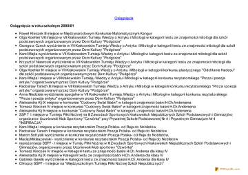 Osiągnięcia Osiągnięcia w roku szkolnym 2000/01 Paweł Kłeczek III miejsce w Międzynarodowym Konkursie Matematycznym Kangur Olga Koehler VIII miejsce w VII Krakowskim Turnieju Wiedzy o Antyku i Mitologii w kategorii testu ze znajomości mitologii dla szkół podstawowych organizowanym przez Dom Kultury "Podgórze" Grzegorz Czech wyróżnienie w VII Krakowskim Turnieju Wiedzy o Antyku i Mitologii w kategorii testu ze znajomości mitologii dla szkół podstawowych organizowanym przez Dom Kultury "Podgórze" Karol Majta wyróżnienie w VII Krakowskim Turnieju Wiedzy o Antyku i Mitologii w kategorii testu ze znajomości mitologii dla szkół podstawowych organizowanym przez Dom Kultury "Podgórze" Krzysztof Nawrocki wyróżnienie w VII Krakowskim Turnieju Wiedzy o Antyku i Mitologii w kategorii testu ze znajomości mitologii dla szkół podstawowych organizowanym przez Dom Kultury "Podgórze" Olga Koehler IV miejsce w VII Krakowskim Turnieju Wiedzy o Antyku i Mitologii w kategorii konkursu plastycznego "Odchłanie Hadesu" dla szkół podstawowych organizowanym przez Dom Kultury "Podgórze" Karol Majta I miejsce w VII Krakowskim Turnieju Wiedzy o Antyku i Mitologii w kategorii konkursu recytatorskiego "Proza i poezja antyku" organizowanym przez Dom Kultury "Podgórze" Radosław Tarach III miejsce w VII Krakowskim Turnieju Wiedzy o Antyku i Mitologii w kategorii konkursu recytatorskiego "Proza i poezja antyku" organizowanym przez Dom Kultury "Podgórze" Anna Niedziela wyróżnienie specjalne w VII Krakowskim Turnieju Wiedzy o Antyku i Mitologii w kategorii konkursu recytatorskiego "Proza i poezja antyku" organizowanym przez Dom Kultury "Podgórze" Aleksandra Kij IX miejsce w konkursie "Cudowny Świat Baśni" w kategorii znajomość baśni H.Ch.Andersena Tomasz Kłeczek IV miejsce w konkursie "Cudowny Świat Baśni" w kategorii znajomość baśni H.Ch.Andersena Aleksandra Kij 9 miejsce w konkursie "Cudowny Świat Baśni" w kategorii -znajomość baśni H.Ch.Andersena SSP 7 1 miejsce w Turnieju Piłki Nożnej na III Zawodach Sportowych Krakowskich Niepublicznych Szkół Podstawowych i Gimnazjów; organizator: Uczniowski Klub Sportowy "Czwórka" przy Prywatnej Szkole Podstawowej Nr 4 i Prywatnym Gimnazjum Nr 4 "INSPIRACJA" Karol Majta I miejsce w konkursie recytatorskim Poezja Polska- od Reja do Noblistów Radosław Tarach II miejsce w konkursie recytatorskim Poezja Polska- od Reja do Noblistów Marcin Sołtysik wyróżnienie w konkursie recytatorskim Poezja Polska- od Reja do Noblistów, Maciej Miklaszewski - wyróżnienie w konkursie recytatorskim Poezja Polska- od Reja do Noblistów reprezentacja SSP7 - I miejsce w Turniju Piłki Nożnej w III Zwodach Sportowych Krakowskich Niepublicznych Szkół Podstawowych i Gimnazjów, organizowany przez Uczniowski klub sportowy "Czwórka" Tomasz Kłeczek IV miejsce w Kategorii testu ze znajomości baśni H.Ch. Andersa dla klasy IV Aleksnadra Kij IX miejsce w Kategorii testu ze znajomości baśni H.Ch. Andersa dla klasy IV Gabriela Gawlik wyróżnienie w Kategorii testu ze znajomości baśni H.Ch. Andersa dla klasy IV Chłopcy SSP7 - I miejsce na "Międzyszkolnym Turnieju Piłki Nożnej Szkół Niepublicznych" PDFmyURL.com PDFmyURL.com