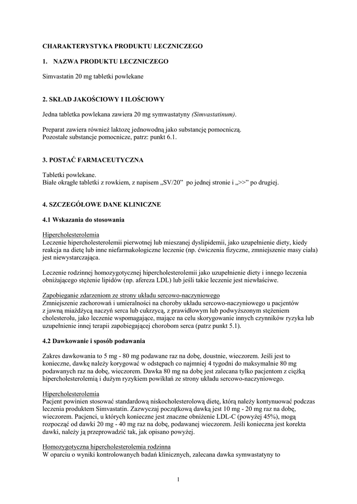 CHARAKTERYSTYKA PRODUKTU LECZNICZEGO 1. NAZWA PRODUKTU LECZNICZEGO Simvastatin 20 mg tabletki powlekane 2. SKŁAD JAKOŚCIOWY I ILOŚCIOWY Jedna tabletka powlekana zawiera 20 mg symwastatyny (Simvastatinum). Preparat zawiera również laktozę jednowodną jako substancję pomocniczą. Pozostałe substancje pomocnicze, patrz: punkt 6.1. 3. POSTAĆ FARMACEUTYCZNA Tabletki powlekane. Białe okrągłe tabletki z rowkiem, z napisem „SV/20” po jednej stronie i „>>” po drugiej. 4. SZCZEGÓŁOWE DANE KLINICZNE 4.1 Wskazania do stosowania Hipercholesterolemia Leczenie hipercholesterolemii pierwotnej lub mieszanej dyslipidemii, jako uzupełnienie diety, kiedy reakcja na dietę lub inne niefarmakologiczne leczenie (np. ćwiczenia fizyczne, zmniejszenie masy ciała) jest niewystarczająca. Leczenie rodzinnej homozygotycznej hipercholesterolemii jako uzupełnienie diety i innego leczenia obniżającego stężenie lipidów (np. afereza LDL) lub jeśli takie leczenie jest niewłaściwe. Zapobieganie zdarzeniom ze strony układu sercowo-naczyniowego Zmniejszenie zachorowań i umieralności na choroby układu sercowo-naczyniowego u pacjentów z jawną miażdżycą naczyń serca lub cukrzycą, z prawidłowym lub podwyższonym stężeniem cholesterolu, jako leczenie wspomagające, mające na celu skorygowanie innych czynników ryzyka lub uzupełnienie innej terapii zapobiegającej chorobom serca (patrz punkt 5.1). 4.2 Dawkowanie i sposób podawania Zakres dawkowania to 5 mg - 80 mg podawane raz na dobę, doustnie, wieczorem. Jeśli jest to konieczne, dawkę należy korygować w odstępach co najmniej 4 tygodni do maksymalnie 80 mg podawanych raz na dobę, wieczorem. Dawka 80 mg na dobę jest zalecana tylko pacjentom z ciężką hipercholesterolemią i dużym ryzykiem powikłań ze strony układu sercowo-naczyniowego. Hipercholesterolemia Pacjent powinien stosować standardową niskocholesterolową dietę, którą należy kontynuować podczas leczenia produktem Simvastatin. Zazwyczaj początkową dawką jest 10 mg - 20 mg raz na dobę, wieczorem. Pacjenci, u których konieczne jest znaczne obniżenie LDL-C (powyżej 45%), mogą rozpocząć od dawki 20 mg - 40 mg raz na dobę, podawanej wieczorem. Jeśli konieczna jest korekta dawki, należy ją przeprowadzić tak, jak opisano powyżej. Homozygotyczna hipercholesterolemia rodzinna W oparciu o wyniki kontrolowanych badań klinicznych, zalecana dawka symwastatyny to 1 40 mg raz na dobę, wieczorem lub 80 mg na dobę w trzech dawkach: rano i w południe po 20 mg, a wieczorem 40 mg. W tej grupie pacjentów, Simvastatin należy stosować jako lek uzupełniający inne metody leczenia zmniejszające stężenie lipidów (np. afereza LDL) lub jeśli takie leczenie jest niedostępne. Zapobieganie zdarzeniom ze strony układu sercowo-naczyniowego Zalecaną dawką produktu Simvastatin u pacjentów z dużym ryzykiem wystąpienia zdarzeń wieńcowych (choroba wieńcowa, z hiperlipidemią lub bez) jest 20 mg do 40 mg na dobę, w pojedynczej dawce, wieczorem. Leczenie może być rozpoczęte jednocześnie ze stosowaniem diety i ćwiczeniami fizycznymi. Jeśli konieczna jest korekta dawkowania, należy ją przeprowadzić tak, jak opisano powyżej. Jednoczesne stosowanie z innymi lekami zmniejszającymi stężenie lipidów. Produkt leczniczy Simvastatin jest skuteczny w monoterapii lub w skojarzeniu z produktami wiążącymi kwasy żółciowe. Produkt leczniczy należy podawać albo nie mniej niż 2 godziny przed lub nie mniej niż 4 godziny po podaniu produktów wiążących kwasy żółciowe. Pacjenci przyjmujący jednocześnie z produktem leczniczym Simvastatin cyklosporynę, danazol, gemfibrozyl, inne fibraty (z wyjątkiem fenofibratu) oraz niacynę w dawkach zmniejszających stężenie lipidów (> 1 g na dobę) nie mogą stosować dobowej dawki produktu Simvastatin większej niż 10 mg na dobę. Pacjenci przyjmujący jednocześnie z produktem Simvastatin amiodaron lub werapamil, nie mogą stosować dawki produktu Simvastatin większej niż 20 mg na dobę (patrz punkt 4.4 i 4.5). Niewydolność nerek Nie ma konieczności zmiany dawkowania u pacjentów z umiarkowaną niewydolnością nerek. U pacjentów z ostrą niewydolnością nerek (klirens kreatyniny < 30 ml/min), należy bardzo starannie rozważyć podawanie dawki większej niż 10 mg na dobę i jeśli jest to niezbędne, bardzo ostrożnie rozpocząć leczenie. Stosowanie u pacjentów w podeszłym wieku Dostosowanie dawkowania nie jest konieczne. Stosowanie u dzieci i młodzieży (w wieku 10-17 lat) Dla dzieci i młodzieży (chłopcy w stadium dojrzałości płciowej II lub wyższym według skali Tannera i dziewczynki miesiączkujące od co najmniej roku) z heterozygotyczną hipercholesterolemią rodzinną zalecana dawka początkowa wynosi 10 mg raz na dobę wieczorem. Przed rozpoczęciem leczenia produktem Simvastatin u dzieci i młodzieży należy wprowadzić standardową dietę obniżającą poziom cholesterolu i następnie kontynuować w trakcie leczenia produktem Simvastatin. Zalecany zakres dawkowania wynosi 10-40 mg/dobę, maksymalna zalecana dawka wynosi 40 mg/dobę. Dawki należy dobierać indywidualnie zgodnie z założonym celem terapeutycznym według zaleceń wytycznych leczenia pediatrycznego (patrz punkt 4.4 i 5.1). Korekta dawki powinna następować nie częściej niż co 4 tygodnie. Dane dotyczące stosowania symwastatyny u dzieci przed rozpoczęciem pokwitania (okresu dojrzewania) są ograniczone. 4.3 Przeciwwskazania Nadwrażliwość na symwastatynę lub inne składniki produktu leczniczego. Czynna choroba wątroby lub utrzymujące się, niewyjaśnione zwiększenie aktywności aminotransferaz w surowicy. Ciąża i okres karmienia piersią (patrz punkt 4.6). Jednoczesne podawanie silnych inhibitorów CYP3A4 (np. itrakonazol, ketokonazol, inhibitory proteazy wirusa HIV, erytromycyna, klarytromycyna, telitromycyna i nefazodon) (patrz punkt 4.5). 2 4.4 Specjalne ostrzeżenia i środki ostrożnośc