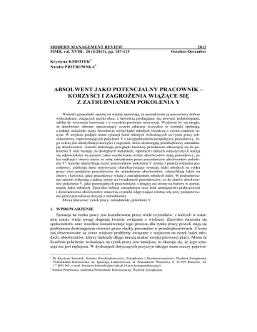 MODERN MANAGEMENT REVIEW MMR, vol. XVIII, 20 (4/2013), pp. 107-115 2013 October-December Krystyna KMIOTEK1 Natalia PIOTROWSKA2 ABSOLWENT JAKO POTENCJALNY PRACOWNIK – KORZYŚCI I ZAGROśENIA WIĄśĄCE SIĘ Z ZATRUDNIANIEM POKOLENIA Y Warunki gospodarki opartej na wiedzy sprawiają, Ŝe poszukiwani są pracownicy dobrze wykształceni, znających języki obce, z łatwością posługujący się nowymi technologiami, zdolni do tworzenia innowacji i o wysokim poziomie motywacji. Wydawać by się mogło, Ŝe absolwenci obecnie opuszczający system edukacji wszystkie te warunki spełniają, a jednak wskaźniki stopy bezrobocia wśród ludzi młodych świadczą o czymś zupełnie innym. W artykule podjęto temat sytuacji ludzi młodych wchodzących na rynek pracy (absolwentów), reprezentujących pokolenie Y z uwzględnieniem perspektywy pracodawcy. Jego celem jest identyfikacja korzyści i zagroŜeń, które dostrzegają przedsiębiorcy zatrudniając absolwentów. Autorki dokonując przeglądu literatury przedmiotu odnoszącej się do pokolenia Y oraz bazując na dostępnych badaniach, raportach i danych statystycznych starają się odpowiedzieć na pytanie: jakie oczekiwania wobec absolwentów mają pracodawcy, jakie nadzieje i obawy niesie ze sobą zatrudnianie przez pracodawców absolwentów pokolenia Y? Autorki identyfikują cechy pracowników pokolenia Y istotne z punktu widzenia pracodawcy, analizują dane statystyczne charakteryzujące sytuację ludzi młodych na rynku pracy oraz podejście pracodawców do zatrudniania absolwentów, identyfikują takŜe na obawy i korzyści, jakie pracodawcy wiąŜą z zatrudnianiem młodych ludzi. W podsumowaniu autorki wskazują z jednej strony na świadomość pracodawców, co do atutów absolwentów pokolenia Y, jako potencjalnych pracowników z drugiej zaś strony na bariery w zatrudnianiu ludzi młodych. Zjawisko inflacji zatrudnienia oraz brak umiejętności praktycznych i doświadczenia absolwentów stanowią czynniki odgrywające istotną rolę przy podejmowaniu przez pracodawcę decyzji o zatrudnieniu. Słowa kluczowe: rynek pracy, zatrudnienie, pokolenie Y. 1. WPROWADZENIE Sytuacja na runku pracy jest kształtowana przez wiele czynników, z których w ostatnim czasie wiele uwagi skupiają kwestie związane z wiekiem. Zjawisko starzenia się społeczeństw oraz wszelkie konsekwencje tego procesu dla rynku pracy powoli stają się problemem dostrzeganym równieŜ przez słuŜby personalne w przedsiębiorstwach. Z kolei zaś obserwowane są coraz większe problemy związane z wejściem na rynek ludzi młodych, absolwentów, którzy niekiedy długo muszą szukać swojej pierwszej pracy. Mimo Ŝe liczebnie pokolenie wchodzące na rynek pracy jest mniejsze, to okazuje się, Ŝe jego sytuacja nie jest najlepsza. W dyskusjach dotyczących przyczyn takiego stanu rzeczy pojawia1 Dr Krystyna Kmiotek, Katedra Przedsiębiorczości, Zarządzania i Ekoinnowacyjności, Wydział Zarządzania, Politechnika Rzeszowska im. Ignacego Łukasiewicza, al. Powstańców Warszawy 8, 35-959 Rzeszów, tel. 17 8651165, e-mail: [email protected] (Autor korespondencyjny). 2 Natalia Piotrowska, studentka Politechniki Rzeszowskiej, Wydział Zarządzania 108 K. Kmiotek, N. Piotrowska ją się róŜne argumenty, między innymi kryzys, słabe przygotowanie zawodowe, niedostosowane do oczekiwań pracodawcy. NaleŜy takŜe rozwaŜyć, na ile cechy młodego pokolenia, jego charakterystyka, przyczyniają się do jego trudności w znalezieniu pracy. Zdaniem specjalistów w zakresie zarządzania zasobami ludzkimi absolwenci wkraczający obecnie na rynek pracy reprezentują młode pokolenie, które swoją charakterystyką odbiega od charakterystyki poprzednich pokoleń, a to rodzi określone problemy dla pracodawcy. W dobie budowania gospodarki opartej na wiedzy pracodawcy dla sukcesu firmy potrzebują talentów, młodych ludzi ze świeŜym spojrzeniem i nieskrepowaną fantazją oraz zapałem i energią, a jednocześnie dobrze wykształconych, znających języki obce, łatwo radzących sobie z nowymi technologiami. Tymczasem wskaźniki bezrobocia wśród młodych ludzi świadczą o tym, Ŝe jednak pracodawcy niechętnie zatrudniają młodych ludzi. W związku z tym autorki, na podstawie dostępnych badań i analiz, podjęły próbę odpowiedzi na pytanie: jakie oczekiwania wobec absolwentów mają pracodawcy, jakie nadzieje i obawy niesie ze sobą zatrudnianie przez pracodawców absolwentów pokolenia Y? Uzyskanie odpowiedzi na tak sformułowane pytania słuŜy identyfikacji korzyści i zagroŜeń, które dostrzegają przedsiębiorcy, zatrudniając absolwentów. W artykule oparto się na przeglądzie literatury oraz dostępnych raportach i danych statystycznych. 2. CHARAKTERYSTYKA ABSOLWENTÓW POKOLENIA Y Sytuacji absolwentów i jego problemom wiele uwagi poświęcają specjaliści z wielu dziedzin: demografii, socjologii rynku pracy, ekonomii i zarządzania zasobami ludzkimi. Według definicji Głównego Urzędu Statystycznego absolwentem jest „osoba, która ukończyła klasę programowo najwyŜszą w danym typie szkoły i otrzymała świadectwo ukończenia tej szkoły – dotyczy absolwentów w szkołach objętych systemem oświaty. Absolwent szkoły wyŜszej to osoba, która uzyskała dyplom stwierdzający ukończenie studiów wyŜszych i – po obronie pracy – uzyskała tytuł zawodowy magistra (po studiach magisterskich jednolitych lub drugiego stopnia/uzupełniających), inŜyniera lub licencjata (po studiach pierwszego stopnia/zawodowych)”3. Młodzi ludzie, wychodząc z systemu edukacyjnego, wyposaŜeni w określoną wiedzę, umiejętności, a takŜe z określonym nastawieniem do pracy i kariery zawodowej, poszukują pierwszych moŜliwości zdobycia doświadczenia i nie tylko samodzielnego zarobienia pierwszych pieniędzy, ale i sprawdzenia się. Trafiają do przedsiębiorstw, które mają określone rozwiązania organizacyjne w zakresie rekrutacji, rozwoju pracowników, m