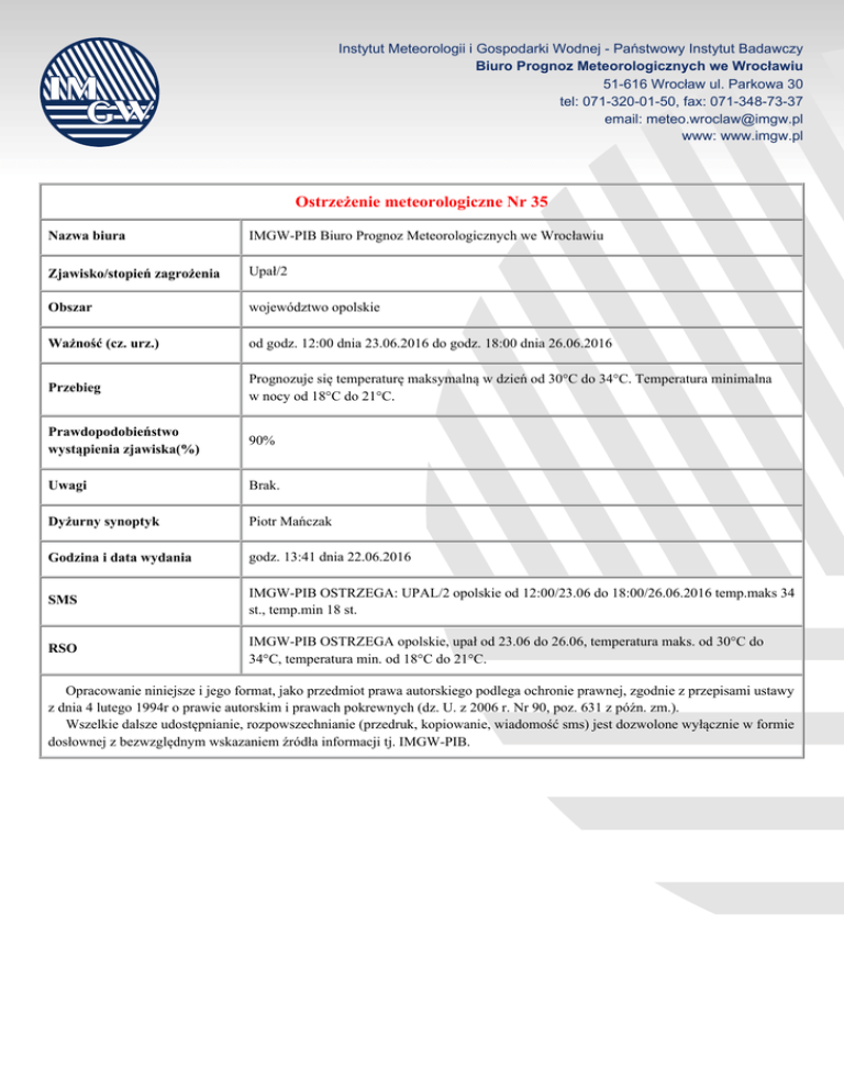 Instytut Meteorologii i Gospodarki Wodnej - Państwowy Instytut Badawczy Biuro Prognoz Meteorologicznych we Wrocławiu 51-616 Wrocław ul. Parkowa 30 tel: 071-320-01-50, fax: 071-348-73-37 email: [email protected] www: www.imgw.pl Ostrzeżenie meteorologiczne Nr 35 Nazwa biura IMGW-PIB Biuro Prognoz Meteorologicznych we Wrocławiu Zjawisko/stopień zagrożenia Upał/2 Obszar województwo opolskie Ważność (cz. urz.) od godz. 12:00 dnia 23.06.2016 do godz. 18:00 dnia 26.06.2016 Przebieg Prognozuje się temperaturę maksymalną w dzień od 30°C do 34°C. Temperatura minimalna w nocy od 18°C do 21°C. Prawdopodobieństwo wystąpienia zjawiska(%) 90% Uwagi Brak. Dyżurny synoptyk Piotr Mańczak Godzina i data wydania godz. 13:41 dnia 22.06.2016 SMS IMGW-PIB OSTRZEGA: UPAL/2 opolskie od 12:00/23.06 do 18:00/26.06.2016 temp.maks 34 st., temp.min 18 st. RSO IMGW-PIB OSTRZEGA opolskie, upał od 23.06 do 26.06, temperatura maks. od 30°C do 34°C, temperatura min. od 18°C do 21°C. Opracowanie niniejsze i jego format, jako przedmiot prawa autorskiego podlega ochronie prawnej, zgodnie z przepisami ustawy z dnia 4 lutego 1994r o prawie autorskim i prawach pokrewnych (dz. U. z 2006 r. Nr 90, poz. 631 z późn. zm.). Wszelkie dalsze udostępnianie, rozpowszechnianie (przedruk, kopiowanie, wiadomość sms) jest dozwolone wyłącznie w formie dosłownej z bezwzględnym wskazaniem źródła informacji tj. IMGW-PIB.
