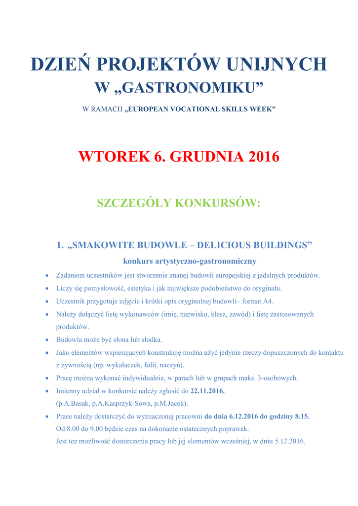 DZIEŃ PROJEKTÓW UNIJNYCH W „GASTRONOMIKU” W RAMACH „EUROPEAN VOCATIONAL SKILLS WEEK” WTOREK 6. GRUDNIA 2016 SZCZEGÓŁY KONKURSÓW: 1. „SMAKOWITE BUDOWLE – DELICIOUS BUILDINGS” konkurs artystyczno-gastronomiczny Zadaniem uczestników jest stworzenie znanej budowli europejskiej z jadalnych produktów. Liczy się pomysłowość, estetyka i jak największe podobieństwo do oryginału. Uczestnik przygotuje zdjęcie i krótki opis oryginalnej budowli– format A4. Należy dołączyć listę wykonawców (imię, nazwisko, klasa, zawód) i listę zastosowanych produktów. Budowla może być słona lub słodka. Jako elementów wspierających konstrukcję można użyć jedynie rzeczy dopuszczonych do kontaktu z żywnością (np. wykałaczek, folii, naczyń). Pracę można wykonać indywidualnie, w parach lub w grupach maks. 3-osobowych. Imienny udział w konkursie należy zgłosić do 22.11.2016. (p.A.Basak, p.A.Kasprzyk-Sowa, p.M.Jacek). Prace należy dostarczyć do wyznaczonej pracowni do dnia 6.12.2016 do godziny 8.15. Od 8.00 do 9.00 będzie czas na dokonanie ostatecznych poprawek. Jest też możliwość dostarczenia pracy lub jej elementów wcześniej, w dniu 5.12.2016. 2. „WARTO ZOBACZYĆ, WARTO SPRÓBOWAĆ” prezentacja Zadaniem uczestników jest wykonanie i przedstawienie prezentacji multimedialnej. Prezentacja musi być zgodna z tematem konkursu. Prezentacja musi dotyczyć miejscowości lub potraw związanych z projektami unijnymi prowadzonymi w naszej szkole ERASMUS+ „PODRÓŻE ZE SMAKIEM/TASTY TRAVELS” i PO WER „SKARBY REGIONÓW EUROPY/TREASURE REGIONS”. Prezentacja może dotyczyć tylko jednego miejsca lub kuchni. Miejscowości: Malaga, Walencja, Bolonia, Reggio-Emilia, Sofia. Charakterystyka kuchni włoskiej, hiszpańskiej, bułgarskiej. Program Power Point Ilość slajdów: 15-20 Prezentacje ze zbyt dużą ilością tekstu na slajdach będą miały obniżoną punktację. Imienny udział w konkursie należy zgłosić do 22.11.2016. (p.A.Basak, p.A.Kasprzyk-Sowa, p.M.Jacek). Prezentacje należy dostarczyć do 30.11.2016. (p.A.Basak, p.A.Kasprzyk-Sowa, p.M.Jacek). 3. „STAŻ ZAGRANICZNY MOJĄ SZANSĄ” esej Zadaniem uczestników jest napisanie eseju na temat „STAŻ ZAGRANICZNY MOJĄ SZANSĄ” Należy rozważyć i opisać korzyści, jakie może oferować 4-tygodniowy zagraniczny staż zawodowy organizowany i finansowany z funduszy Unii Europejskiej w ramach projektów „SKARBY REGIONÓW EUROPY/TREASURE REGIONS” (program PO WER) i „PODRÓŻE ZE SMAKIEM/TASTY TRAVELS” (program ERASMUS+). Długość pracy powinna mieścić się w granicach 250-300 słów. Imienny udział w konkursie należy zgłosić do 22.11.2016. (p.A.Basak, p.A.Kasprzyk-Sowa, p.M.Jacek). Eseje należy dostarczyć do 30.11.2016. (p.A.Basak, p.A.Kasprzyk-Sowa, p.M.Jacek).