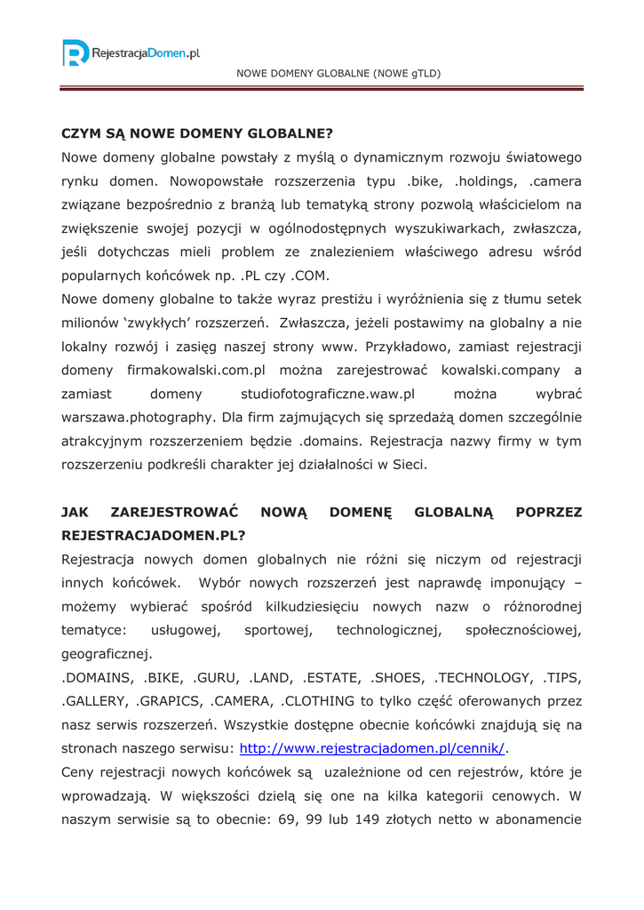 NOWE DOMENY GLOBALNE (NOWE gTLD) CZYM SĄ NOWE DOMENY GLOBALNE? Nowe domeny globalne powstały z myślą o dynamicznym rozwoju światowego rynku domen. Nowopowstałe rozszerzenia typu .bike, .holdings, .camera związane bezpośrednio z branżą lub tematyką strony pozwolą właścicielom na zwiększenie swojej pozycji w ogólnodostępnych wyszukiwarkach, zwłaszcza, jeśli dotychczas mieli problem ze znalezieniem właściwego adresu wśród popularnych końcówek np. .PL czy .COM. Nowe domeny globalne to także wyraz prestiżu i wyróżnienia się z tłumu setek milionów ‘zwykłych’ rozszerzeń. Zwłaszcza, jeżeli postawimy na globalny a nie lokalny rozwój i zasięg naszej strony www. Przykładowo, zamiast rejestracji domeny firmakowalski.com.pl zamiast domeny można zarejestrować kowalski.company studiofotograficzne.waw.pl można a wybrać warszawa.photography. Dla firm zajmujących się sprzedażą domen szczególnie atrakcyjnym rozszerzeniem będzie .domains. Rejestracja nazwy firmy w tym rozszerzeniu podkreśli charakter jej działalności w Sieci. JAK ZAREJESTROWAĆ NOWĄ DOMENĘ GLOBALNĄ POPRZEZ REJESTRACJADOMEN.PL? Rejestracja nowych domen globalnych nie różni się niczym od rejestracji innych końcówek. Wybór nowych rozszerzeń jest naprawdę imponujący – możemy spośród tematyce: wybierać usługowej, kilkudziesięciu sportowej, nowych nazw technologicznej, o różnorodnej społecznościowej, geograficznej. .DOMAINS, .BIKE, .GURU, .LAND, .ESTATE, .SHOES, .TECHNOLOGY, .TIPS, .GALLERY, .GRAPICS, .CAMERA, .CLOTHING to tylko część oferowanych przez nasz serwis rozszerzeń. Wszystkie dostępne obecnie końcówki znajdują się na stronach naszego serwisu: http://www.rejestracjadomen.pl/cennik/. Ceny rejestracji nowych końcówek są uzależnione od cen rejestrów, które je wprowadzają. W większości dzielą się one na kilka kategorii cenowych. W naszym serwisie są to obecnie: 69, 99 lub 149 złotych netto w abonamencie NOWE DOMENY GLOBALNE (NOWE gTLD) rocznym. Opłata za odnowienie nowej domeny globalnej na każdy kolejny rok abonamentowy będzie w RejestracjaDomen.pl równa promocyjnej cenie jej rejestracji. JAKIE SĄ ZASADY ZARZĄDZANIA DOMENAMI GLOBALNYMI? Rejestracja oraz odnowienie: Długość rejestrowanej nazwy domeny zawierać się musi w przedziale 363 znaków. Ponadto nie mogą być to znaki narodowe (np.ąęćłóżź). Przy wyborze nazwy domeny należy pamiętać, by nie naruszała ona czyjegoś znaku towarowego z listy TRADEMARK CLEARINGHOUSE: (https://secure.trademark-clearinghouse.com/tmch/public/) Domeny te mogą być rejestrowane i odnawiane na okres 1 – 10 lat oraz nie posiadają specjalnych wymogów względem Abonentów domeny New gTLD nie posiadają okresu kwarantanny, bezpośrednio po terminie wygasania przechodzą do 30 dniowego Redemption Grace Period w którym mogą być odnowione po wniesieniu opłaty dodatkowej. Transfery domen: Transfer nowych domen do naszego systemu jest darmowy. Tak jak w przypadku zwykłych domen globalnych i niektórych domen narodowych, wiąże się jedynie Rejestratora z koniecznością domeny oraz uzyskaniem kodu AuthInfo odnowienia domeny na od obecnego kolejny okres abonamentowy (Transfer z odnowieniem). Regulaminy: Rejestrem głównym dla nowych domen globalnych, które można zakupić w naszym serwisie jest obecnie firma Donuts. Polityka rejestratora Donuts (ang): http://www.donuts.co/policies/ Polityka rozwiązywania sporów domenowych: http://www.donuts.co/policies/sunrise-and-dpml-dispute-resolution-policy/
