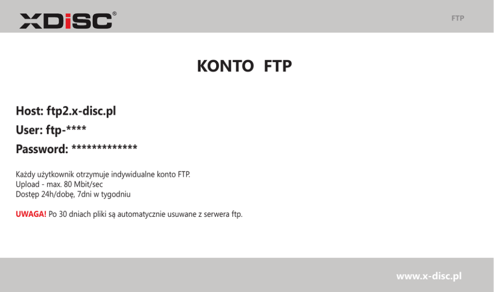 FTP KONTO FTP Host: ftp2.x-disc.pl User: ftp-**** Password: ************* Każdy użytkownik otrzymuje indywidualne konto FTP. Upload - max. 80 Mbit/sec Dostęp 24h/dobę, 7dni w tygodniu UWAGA! Po 30 dniach pliki są automatycznie usuwane z serwera ftp. www.x-disc.pl