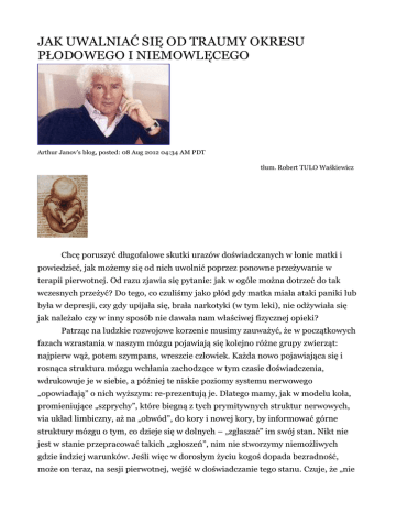 JAK UWALNIA SI OD TRAUMY OKRESU PèODOWEGO I NIEMOWL CEGO Arthur Janov's blog, posted: 08 Aug 2012 04:34 AM PDT tøum. Robert TULO Wa kiewicz Chc poruszy døugofalowe skutki urazów do wiadczanych w øonie matki i powiedzie , jak mo emy si od nich uwolni poprzez ponowne prze ywanie w terapii pierwotnej. Od razu zjawia si pytanie: jak w ogóle mo na dotrze do tak wczesnych prze y ? Do tego, co czuli my jako pøód gdy matka miaøa ataki paniki lub byøa w depresji, czy gdy upijaøa si , braøa narkotyki (w tym leki), nie od ywiaøa si jak nale aøo czy w inny sposób nie dawaøa nam wøa ciwej fizycznej opieki? Patrz c na ludzkie rozwojowe korzenie musimy zauwa y , e w pocz tkowych fazach wzrastania w naszym mózgu pojawiaj si kolejno ró ne grupy zwierz t: najpierw w , potem szympans, wreszcie czøowiek. Ka da nowo pojawiaj ca si i rosn ca struktura mózgu wchøania zachodz ce w tym czasie do wiadczenia, wdrukowuje je w siebie, a pó niej te niskie poziomy systemu nerwowego „opowiadaj ” o nich wy szym: re-prezentuj je. Dlatego mamy, jak w modelu koøa, promieniuj ce „szprychy”, które biegn z tych prymitywnych struktur nerwowych, via ukøad limbiczny, a na „obwód”, do kory i nowej kory, by informowa górne struktury mózgu o tym, co dzieje si w dolnych – „zgøasza ” im swój stan. Nikt nie jest w stanie przepracowa takich „zgøosze ”, nim nie stworzymy niemo liwych gdzie indziej warunków. Je li wi c w dorosøym yciu kogo dopada bezradno , mo e on teraz, na sesji pierwotnej, wej w do wiadczanie tego stanu. Czuje, e „nie ma nic, co mog zrobi , eby si przebi ”. Wtedy, wehikuøem odczuwania, pacjent zaczyna cofa si w przeszøo a do swoich pocz tków, kiedy uczucie to powstaøo. Osi stanu: „nie mam szans eby si przebi ” jest uczucie bezradno ci. Kiedy pacjent trwa w takim stanie i zanurza si we , to spomi dzy licznych przeszkód mo e zacz wyøania si jego prototyp: b d ce urazem zdarzenie pierwotne, zapisane na poziomie pierwszym. Jedn z cech tego stanu jest pot na walencja emocjonalna, co mo e grozi przeci eniem (przeøadowaniem). Zanim wi c dotrzemy do tego miejsca, podró ujemy wstecz najpierw przez møodo i dzieci stwo – przez kolejne, coraz wcze niejsze zdarzenia, które zapisaøy ów stan emocjonalny na poziomie drugim. Pacjent zaczyna na przykøad: „nigdy nie mog si do nich (rodziców) przebi ; nie widz mnie”. A wi c startujemy od tego stanu w tera niejszo ci i wchodzimy w obszar DMV (ukøadu limbicznego). Tu zaczynamy odczuwa niemo no przebicia si do rodziców w dzieci stwie. Uczucie bezradno ci ws cza si i wzbiera: „Wszystko jest beznadziejne, a ja jestem bezradny”. Mo emy utrzyma terapi na tym poziomie, albo te – z czasem – schodzi gø biej; dotarcie do prototypu i odczucie go stanowi ostatni przystanek na danej trasie. Uzdrowienie nast puje dopiero, gdy obejmie wszystkie cz ci zarówno naszej wiadomo ci jak nie wiadomo ci i poø czy je. Im gø biej schodzimy, tym prze ywane uczucia i stany s pot niejsze. Musimy za wszelk cen unika przeci enia. Dlatego caøy proces zajmuje wiele czasu. Z chwil kiedy zostajemy zamkni ci w jakim uczuciu, kontrol przejmuje mózg. Søucha on przekazu nadawanego przez prototyp, wi c musimy powstrzyma jakiekolwiek odgórne starania dotarcia do swojej przeszøo ci. Cofamy si w czasie nie na wøasne yczenie i wedøug z góry zaøo onego pomysøu, ale odwrotnie – odkøadamy „gøow ” na bok i powierzamy si uczuciom. W terapii, pacjent musi najpierw døugo „rozmawia ” z szympansem, który po miesi cach dostarcza ten przekaz w owi. Tam, na „dnie”, rozmowa jest czysto neurologiczna i fizjologiczna. Dlatego nadaje ona tak silnego „kopa” naszym reakcjom, cho my nie wiemy czemu tak strasznie walimy pi ciami. Czujemy si bezradni dzi , w tera niejszo ci, ale to nie jest uczucie normalne dla chwili obecnej, gdy niesie pot n siø pøyn c z pocz tków tego stanu emocjonalnego – z wdruku, z prototypu – gdy mogøa to by kwestia ycia lub mierci. Reagujemy na obecne zdarzenia z wielk przesad , ale przecie bezwiednie reagujemy przy tym na wøasn histori , która zapisaøa si w takich stanach. Kiedy prze yjemy dane uczucie w peøni, odkryjemy te automatycznie jego sytuacj macierzyst i mo emy zosta uwolnieni od jej szkodliwych skutków nawet bez zrozumienia, czego konkretnie dotyczyø ów pierwotny stan. Chc tu rozwia wszelkie niejasno ci, gdy jest to wa ny punkt: ka de wcze niejsze zdarzenie lub trauma jest rejestrowane – i metylizowane – wi c zmienia ono sposób, w jaki pracuj lub wyra aj si nasze geny. Wczesne do wiadczenia urazowe wdrukowuj si epigenetyczne. Nast pnie, w miar jak ro niemy, ka dy wczesny wdruk tworzy swoje reprezentacje informuj ce o nim na wy szych poziomach (systemu nerwowego). W informuje o tym szympansa, za szympans mówi dorosøemu czøowiekowi, ale ka da ze struktur mówi i rozumie na swój wøasny sposób. Problem wyst puje, gdy w próbuje skomunikowa si z ludzk neo-kor ; nie mamy poj cia, co próbuje nam opowiedzie , wiemy tylko, e czujemy si paskudnie, w strasznym l ku i przera eniu. Tak wøa nie „brzmi” j zyk w a; zmusza nas do lizgania si i ruchu, ale jeste my przykuci do pierwotnego stanu, zamkni ci w nim. Je li ten j zyk w a ugrz nie wewn trz, mo e wywoøa atak epilepsji, migren , nadci nienie, cokolwiek... Jest pot ny, gdy dziaøa tu archaiczny mózg warunkuj cy przetrwanie. Normalnie, gdy nast puje støumienie, blokuje ono uczucia lub odczuwanie zmysøowe i tworzy wiele symptomów z depresj wø cznie. Zachodz ce na poziomie pierwszym wyparcie urazów pøodowych prowadzi w pó niejszym yciu do katastrofalnych chorób. Ka dy tworz cy si poziom mózgu nast pnie dojrzewa. Teraz mo emy by w peøni informowani o zdarzeniach z naszego wcze niejszego ycia. Ka da informacja jest zakodowana neurofizjologicznie jako rodzaj uczucia, wi c podobne emocje wplataj si w podobne obwody nerwowe. W wieku lat trzydziestu pacjent mo e prze ywa na nowo poczucie bezradno ci, które wydaje si