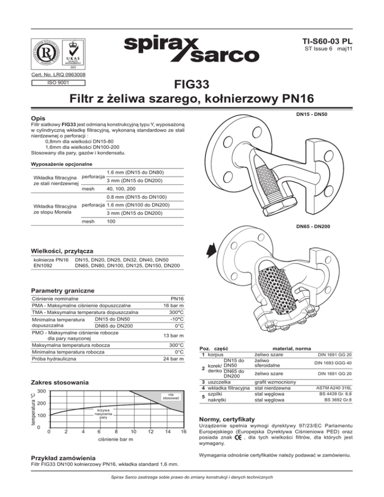TI-S60-03 PL ST Issue 6 maj11 Cert. No. LRQ 0963008 ISO 9001 FIG33 Filtr z żeliwa szarego, kołnierzowy PN16 DN15 - DN50 Opis Filtr siatkowy FIG33 jest odmianą konstrukcyjną typu Y, wyposażoną w cylindryczną wkładkę filtracyjną, wykonaną standardowo ze stali nierdzewnej o perforacji : 0,8mm dla wielkości DN15-80 1,6mm dla wielkości DN100-200 Stosowany dla pary, gazów i kondensatu. Wyposażenie opcjonalne 1.6 mm (DN15 do DN80) Wkładka filtracyjna perforacja 3 mm (DN15 do DN200) ze stali nierdzewnej mesh 40, 100, 200 0.8 mm (DN15 do DN100) Wkładka filtracyjna ze stopu Monela perforacja 1.6 mm (DN100 do DN200) 3 mm (DN15 do DN200) mesh 100 DN65 - DN200 Wielkości, przyłącza kołnierze PN16 EN1092 DN15, DN20, DN25, DN32, DN40, DN50 DN65, DN80, DN100, DN125, DN150, DN200 Parametry graniczne Ciśnienie nominalne PMA - Maksymalne ciśnienie dopuszczalne TMA - Maksymalna temperatura dopuszczalna DN15 do DN50 Minimalna temperatura dopuszczalna DN65 do DN200 PMO - Maksymalne ciśnienie robocze dla pary nasyconej Maksymalna temperatura robocza Minimalna temperatura robocza Próba hydrauliczna PN16 16 bar m 300°C -10°C 0°C 13 bar m 300°C 0°C 24 bar m temperatura °C Zakres stosowania 300 nie stosować 200 krzywa nasycenia pary 100 0 0 2 4 6 materiał, norma DIN 1691 GG 20 żeliwo szare żeliwo DIN 1693 GGG 40 sferoidalne żeliwo szare grafit wzmocniony stal nierdzewna stal węglowa stal węglowa DIN 1691 GG 20 ASTM A240 316L BS 4439 Gr. 8.8 BS 3692 Gr.8 Normy, certyfikaty 8 10 12 14 ciśnienie bar m Przykład zamówienia Poz. część 1 korpus DN15 do DN50 2 korek/ denko DN65 do DN200 3 uszczelka 4 wkładka filtracyjna szpilki 5 nakrętki 16 Urządzenie spełnia wymogi dyrektywy 97/23/EC Parlamentu Europejskiego (Europejska Dyrektywa Ciśnieniowa PED) oraz posiada znak , dla tych wielkości filtrów, dla których jest wymagany. Wymagania odnośnie certyfikatów należy podawać w zamówieniu. Filtr FIG33 DN100 kołnierzowy PN16, wkładka standard 1,6 mm. Spirax Sarco zastrzega sobie prawo do zmiany konstrukcji i danych technicznych strona 2/2 Współczynniki przepływu Kvs wielkość DN15 DN20 DN25 DN32 DN40 DN50 DN65 DN80 DN100 DN125 DN150 DN200 perforacja 0.8, 1.6, 3 mm 5 8 13 22 29 46 72 103 155 237 340 588 mesh 40, 100 5 8 13 22 29 46 72 103 155 237 340 588 mesh 200 4 6 10 17 23 37 58 83 124 186 268 464 Wielkości, wymiary [mm], masy [kg] wielkość A B DN15 130 70 DN20 150 80 DN25 160 95 DN32 180 135 DN40 200 145 DN50 230 175 DN65 290 200 DN80 310 210 DN100 350 255 DN125 400 300 DN150 480 345 DN200 600 435 * powierzchnia filtracyjna [cm2] C * masa 110 130 150 225 240 300 335 340 415 510 575 730 27 43 73 135 164 251 327 361 545 843 1 117 1 909 1,8 2,7 3,4 6,0 7,2 10,9 21,7 25,9 38,5 63,0 87,0 153,0 DN15 - DN50 3 4 A 2 odstęp dla demontażu B DN65 - DN200 C Części zamienne Dostępne części zamienne pokazano ciągłą linią na rysunku obok. 3 4 Dostępne części zamienne wkładka filtracyjna (przy zamówieniu należy podać odmianę materiałową, rodzaj perforacji/siatki oraz wielkość filtra) uszczelka korka (3 szt. w opakowaniu) 4 3 Przy zamawianiu części prosimy używać określeń podanych wyżej, a także podać typ i wielkość urządzenia. Przykład: uszczelka do filtra FIG33, DN15. Instalacja, konserwacja 5 5 Momenty siły zalecane przy skręcaniu lub poz Instalacja Zgodnie ze strzałką na korpusie, w rurociągu pionowym lub poziomym. Jeżeli filtr dla pary i gazów ma być zabudowany w rurociągu poziomym , zalecamy zabudowę kieszeni filtra w płaszczyźnie poziomej (dla uniknięcia zawodnienia kieszeni). Natomiast w instalacjach dla cieczy, kieszeń filtra powinna być skierowana ku dołowi, tworząc naturalny osadnik grawitacyjny. Konserwacja Przed przedsięwzięciem jakichkolwiek czynności serwisowych, należy odizolować filtr, od mediów będących pod ciśnieniem z obu stron filtra. Następnie należy pozwolić mu się schłodzić do temperatury umożliwiającej czynności serwisowe. Prosimy pamiętać, iż przed przystąpieniem do poprzeglądowego skręcania filtra należy zadbać o czystość wszystkich powierzchni styku oraz wymienić uszczelkę (3). Korek lub śruby należy dokręcić stosując zalecany moment siły, zgodnie z tabelą obok. nazwa wielkość Nm mm 2 5 korek szpilki nakrętki DN15 36 M28 DN20 38 M32 60 - 66 DN25 50 M42 100 - 110 DN32 46 M56 150 - 165 DN40 50 M60 170 - 185 DN50 60 M72 190 - 210 DN65 19 M12x40 20 - 24 DN80 19 M12x40 30 - 35 DN100 24 M16x50 70 - 77 DN125 24 M16x50 80 - 88 DN150 30 M20x60 100 - 110 DN200 30 M20x70 90 - 100 FIG33 Filtr z żeliwa szarego, kołnierzowy PN16 50 - 55 TI-S60-03 PL ST Issue 6 maj 11