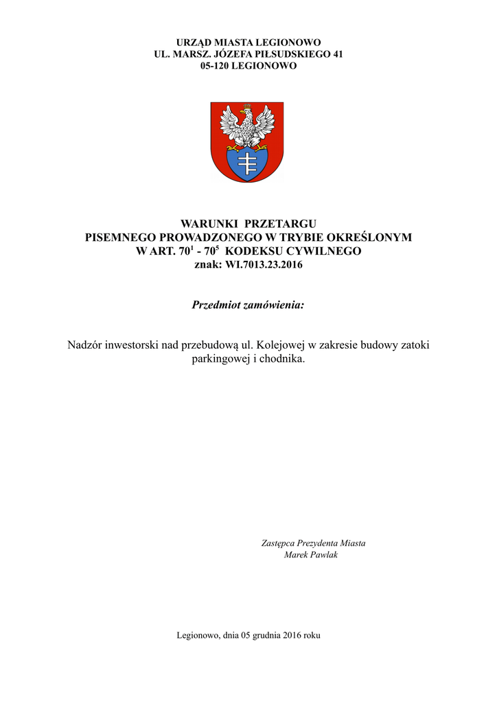 URZĄD MIASTA LEGIONOWO UL. MARSZ. JÓZEFA PIŁSUDSKIEGO 41 05-120 LEGIONOWO WARUNKI PRZETARGU PISEMNEGO PROWADZONEGO W TRYBIE OKREŚLONYM W ART. 701 - 705 KODEKSU CYWILNEGO znak: WI.7013.23.2016 Przedmiot zamówienia: Nadzór inwestorski nad przebudową ul. Kolejowej w zakresie budowy zatoki parkingowej i chodnika. Zastępca Prezydenta Miasta Marek Pawlak Legionowo, dnia 05 grudnia 2016 roku I. Postanowienia wstępne 1. Przetarg odbywa się zgodnie z art. 701 – 705 ustawy z dnia 23 kwietnia 1964 r. - Kodeks Cywilny (Dz. U. Nr 16, poz. 93, z późn. zm.). 2. Zamawiającym jest Gmina Miejska Legionowo – Urząd Miasta Legionowo, ul. marsz. Józefa Piłsudskiego 41, 05-120 Legionowo. NIP 536-19-23-243, REGON 000524832 telefon/faks: tel: (22) 766-40-82, faks: (22) 774 02 32. www.bip.legionowo.pl 3. W jego imieniu postępowanie prowadzone jest przez Wydział Inwestycji tel. (0-22) 766 40 71, fax (0-22) 774 02 32, e-mail: [email protected] 4. Postępowanie oznaczone jest znakiem: WI.7013.23.2016. Wszelka korespondencja w tej sprawie będzie powoływać się na powyższe oznaczenie. Adres do korespondencji: Urząd Miasta Legionowo – Wydział Inwestycji ul. marsz.Józefa Piłsudskiego 41, 05-120 Legionowo. 5. W niniejszym przetargu oświadczenia, wnioski, zawiadomienia oraz informacje zamawiający i wykonawcy przekazują drogą pisemną, elektroniczną lub faksem. W przypadku przekazywania oświadczeń, wniosków, zawiadomień oraz informacji faksem lub drogą elektroniczną, każda ze stron na żądanie drugiej niezwłocznie potwierdza fakt ich otrzymania. II. Przedmiot przetargu 1. Przedmiotem zamówienia jest usługa pełnienia nadzoru inwestorskiego nad przebudową ul. Kolejowej w zakresie budowy zatoki parkingowej i chodnika. Zakres robót budowlanych: 1) branża drogowa – wykonanie 29 miejsc parkingowych o pow. 335 m2 oraz 181 m2 chodnika o nawierzchni z kostki betonowej 2) drzewa do wycinki – 11 szt., 3) oznakowanie poziome i pionowe, 4) zieleń: trawniki. 2. Warunki realizacji przedmiotu zamówienia opisuje projekt umowy - zał. nr 2, 3. Ze względu na charakter ryczałtowy wynagrodzenia zaleca się, aby wykonawca o ile to możliwe dokonał wizji lokalnej (na własny koszt) na terenie objętym zakresem rzeczowym zadania i dokładnie rozpoznał warunki terenowe, zdobył wszelkie informacje, które mogą być konieczne do przygotowania oferty. III. Termin i miejsce złożenia oferty 1. Ofertę należy złożyć w Biurze Obsługi Klienta Urzędu Miasta Legionowo, ul. marsz. Józefa Piłsudskiego 41, 05-120 Legionowo. 2. Termin składania ofert upływa w dniu 09.12.2016 roku o godzinie 1130. 3. Zamawiający zwraca ofertę, która została złożona po terminie. 4. Miejsce i termin otwarcia ofert: Urząd Miasta Legionowo, ul. marsz. Józefa Piłsudskiego 41, 05-120 Legionowo, piętro II, pokój 3.17 w dniu 09.12.2016 roku o godzinie 1200. 5. Niezwłocznie po otwarciu ofert zamawiający przystąpi do ich badania pod względem zgodności z Warunkami Przetargu. IV. Kryteria oceny ofert i ich znaczenia Przez najkorzystniejszą ofertę należy najkorzystniejszą cenę - cena 100%. rozumieć ważną ofertę, która przedstawia V. Termin związania ofertą: 1.Wykonawca pozostaje związany ofertą przez okres 30 dni. Bieg terminu rozpoczyna się wraz z upływem terminu składania ofert. 2. Wykonawca samodzielnie lub na wniosek zamawiającego może przedłużyć termin związania ofertą, z tym że zamawiający może tylko raz, co najmniej na 3 dni przed upływem terminu związania ofertą, zwrócić się do wykonawców o wyrażenie zgody na przedłużenie tego terminu o oznaczony okres, nie dłuższy jednak niż 60 dni. 3. Termin wykonania przedmiotu zamówienia: a) Termin realizacji robót budowlanych ustala się na 25 dni kalendarzowych od dnia wprowadzenia WYKONAWCY na budowę. b) Wprowadzenie na budowę nastąpi w okresie od dnia 01.03.2017 r. do dnia 30.04.2017 r., w zależności od warunków pogodowych pozwalających na rozpoczęcie robót budowlanych. 4. Miejsce i termin podpisania umowy zostanie uzgodniony z wybranym Wykonawcą. VI. Warunki udziału w postępowaniu oraz opis sposobu dokonywania oceny spełnienia tych warunków: 1. O udzielenie Zamówienia mogą ubiegać się Wykonawcy, którzy spełniają warunki dotyczące: 1) posiadania wiedzy i doświadczenia – Zamawiający nie ustala w tym zakresie żadnych wymagań szczegółowych, warunek ten zostanie natomiast uznany ze spełniony, gdy Wykonawca zgodnie ze swoją wiedzą złoży oświadczenie, iż posiada wiedzę i doświadczenie gwarantujące należyte wykonanie przedmiotu zamówienia; 2) dysponowania odpowiednim potencjałem technicznym oraz osobami zdolnymi do wykonania zamówienia – warunek ten będzie spełniony jeżeli Wykonawca zapewni przy realizacji zamówienia udział następujących osób: a) inspektora nadzoru, posiadającego uprawnienia budowlane do kierowania robotami budowlanymi o specjalności drogowej; 2. Ponadto o udzielenie zamówienia mogą ubiegać się Wykonawcy, którzy nie podlegają wykluczeniu z postępowania na podstawie art. 24 ust. 1 ustawy PZP. VII. Wykaz oświadczeń lub dokumentów, jakie mają dostarczyć wykonawcy w celu potwierdzenia spełniania warunków udziału w postępowaniu: - wypełniony formularz ofertowy (według wzoru załącznika nr 1 do Warunków przetargu), - oświadczenie o spełnieniu warunków udziału w postępowaniu (załącznik nr 3 do Warunków Przetargu), - oświadczenie, że osoba, która będzie uczestniczyć w wykonywaniu zamówienia posiada wymagane uprawnienia (załącznik nr 4). VIII. Informacje o sposobie porozumiewania się zamawiającego z wykonawcami oraz przekazywania oświadczeń lub dokumentów, a także wskazanie osób uprawnionych do porozumiewania się z wykonawcami: 1. Pytania i wyjaśnienia dotyczące Warunków przetargu: 1) W przetargu wnioski, zawiadomienia oraz informacje Zamawiający i wykonawcy przekazują drogą pisemną, elektroniczną lub fa