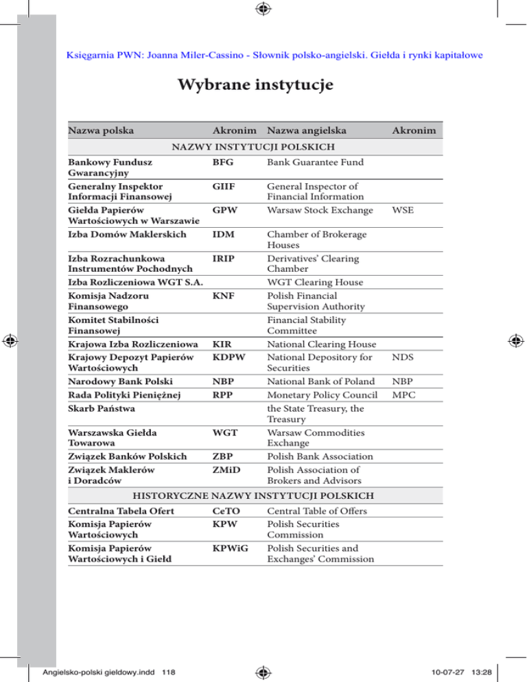 Księgarnia PWN: Joanna Miler-Cassino - Słownik polsko-angielski. Giełda i rynki kapitałowe Wybrane instytucje Nazwa polska Akronim Nazwa angielska Akronim nazwy instytucji polskich Bankowy Fundusz Gwarancyjny Generalny Inspektor Informacji Finansowej Giełda Papierów Wartościowych w Warszawie Izba Domów Maklerskich BFG Bank Guarantee Fund GIIF General Inspector of Financial Information Warsaw Stock Exchange Izba Rozrachunkowa Instrumentów Pochodnych Izba Rozliczeniowa WGT S.A. Komisja Nadzoru Finansowego Komitet Stabilności Finansowej Krajowa Izba Rozliczeniowa Krajowy Depozyt Papierów Wartościowych Narodowy Bank Polski Rada Polityki Pieniężnej Skarb Państwa IRIP Warszawska Giełda Towarowa Związek Banków Polskich Związek Maklerów i Doradców GPW IDM KNF KIR KDPW NBP RPP WGT ZBP ZMiD Chamber of Brokerage Houses Derivatives’ Clearing Chamber WGT Clearing House Polish Financial Supervision Authority Financial Stability Committee National Clearing House National Depository for Securities National Bank of Poland Monetary Policy Council the State Treasury, the Treasury Warsaw Commodities Exchange Polish Bank Association Polish Association of Brokers and Advisors WSE NDS NBP MPC historyczne nazwy instytucji polskich Centralna Tabela Ofert Komisja Papierów Wartościowych Komisja Papierów Wartościowych i Giełd Angielsko-polski gieldowy.indd 118 CeTO KPW KPWiG Central Table of Offers Polish Securities Commission Polish Securities and Exchanges’ Commission 10-07-27 13:28 119 Wybrane instytucje Nazwa polska Akronim Nazwa angielska Akronim nazwy instytucji międzynarodowych Agencja Wielostronna Gwarancji Inwestycyjnych Bank Światowy Europejski Bank Centralny Europejski Bank Inwestycyjny Europejski Bank Odbudowy i Rozwoju EBC EBI EBOiR Federacja Europejskich Giełd Papierów Wartościowych Komitet Europejskich Regulatorów Rynków Papierów Wartościowych Międzynarodowa Federacja Giełd Papierów Wartościowych Międzynarodowa Korporacja Finansowa Międzynarodowa Organizacja Komisji Papierów Wartościowych Międzynarodowe Stowarzyszenie Rozwoju Międzynarodowe Stowarzyszenie Rynków Kapitałowych Międzynarodowy Fundusz MFW Walutowy Organizacja Współpracy OECD Gospodarczej i Rozwoju Stowarzyszenie Izb Depozytowo‑Rozliczeniowych Światowa Organizacja Handlu Multilateral Investment Guarantee Agency World Bank European Central Bank European Investment Bank European Bank for Reconstruction and Development Federation of European Stock Exchanges Committee of European Securities Regulators MIGA International Federation of Stock Exchanges (Fédération Internationale des Bourses de Valeurs) International Finance Corporation International Organization of Securities Commissions International Development Association International Capital Market Association FIBV International Monetary Fund Organization for Economic Cooperation and Development European Central Securities Depositories Association World Trade Organization IMF ECB EIB EBRD FESE CESR IFC IOSCO IDA ICMA OECD ECSDA WTO nieformalne stowarzyszenia państw Klub Londyński Klub Paryski Angielsko-polski gieldowy.indd 119 London Club Paris Club 10-07-27 13:28 Analiza techniczna – nazwy formacji liniowych i świecowych Wybrane wyrażenia i terminy polskie biała świeca chorągiewki cienie czarna chmura a. formacja czarnej chmury czarna świeca diament a. formacja diamentu długa biała świeca a. długi biały korpus długa czarna świeca a. długi czarny korpus długie cienie długonogie doji fala impulsu flaga formacja klina formacja kontynuacji trendu formacja młota formacja objęcia bessy formacja objęcia hossy formacja odwrócenia trendu formacja przenikania formacja świecowa formacja V formacje liniowe głowa i ramiona gwiazda gwiazda poranna gwiazda poranna doji gwiazda wieczorna gwiazda wieczorna doji harami kanały trendowe kanapka klin klin zniżkujący klin zwyżkujący krótka biała świeca Angielsko-polski gieldowy.indd 120 Angielskie odpowiedniki white candlestick pennants shadows black cloud black candlestick diamond long white candle, long white candlestick long black candle, long black candlestick long shadows long legged doji impulse wave flag wedge pattern trend continuation pattern hammer bearish engulfing pattern bullish engulfing pattern trend reversal pattern piercing pattern candlestick formation V-formation chart patterns head and shoulders star morning star morning doji star evening star evening doji star harami trend channels sandwich candlestick formation wedge falling wedge rising wedge short white candle, short white candlestick 10-07-27 13:28 121 krótka czarna świeca luka luka przełamania luka ucieczki luka zwykła łączone świece młot nagrobek doji odwrócona głowa i ramiona odwrócony młot odwrócony spodek podwójne dno a. formacja podwójnego dna podwójny szczyt a. formacja podwójnego szczytu prostokąt a. formacja prostokąta spadająca gwiazda spodek szpulka świeca świeca doji a. formacja doji świeca japońska świeca marubozu trójkąt a. formacja trójkąta trójkąt odwrócony trójkąt prostokątny trójkąt równoramienny a. trójkąt symetryczny trójkąt zniżkujący trójkąt zwyżkujący trzej biali żołnierze trzy czarne wrony a. trzy kruki ważka doji wisielec wykresy świecowe zasłona ciemnej chmury złoty krzyż Angielsko-polski gieldowy.indd 121 Analiza techniczna short black candle, short black candlestick gap breakaway gap runaway gap common gap blending candles hammer gravestone doji inverse head and shoulders inverted hammer inverse saucer double bottom double top rectangle shooting star rounding bottom spinning top candle, candlestick doji, doji candle Japanese candle, Japanese candlestick marubozu triangle inverted triangle ascending triangle symmetrical triangle descending triangle ascending triangle three white soldiers three black crows dragon fly doji hanging man candlestick charts, indicators dark cloud cover golden cross 10-07-27 13:28 Żargon