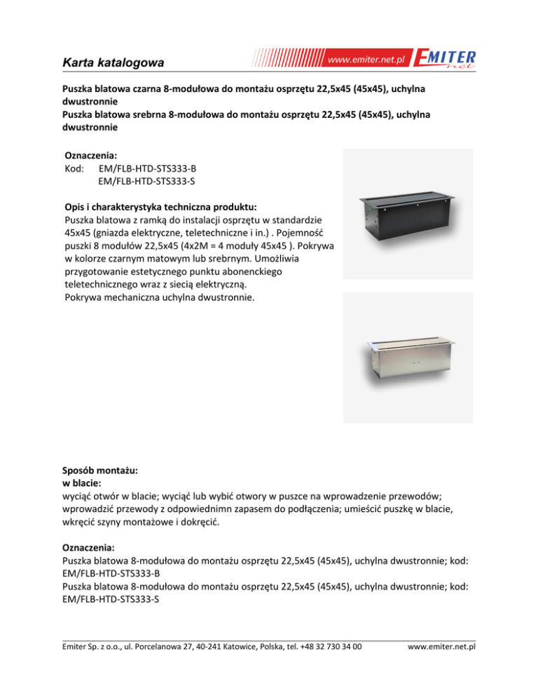 Karta katalogowa Puszka blatowa czarna 8-modułowa do montażu osprzętu 22,5x45 (45x45), uchylna dwustronnie Puszka blatowa srebrna 8-modułowa do montażu osprzętu 22,5x45 (45x45), uchylna dwustronnie Oznaczenia: Kod: EM/FLB-HTD-STS333-B EM/FLB-HTD-STS333-S Opis i charakterystyka techniczna produktu: Puszka blatowa z ramką do instalacji osprzętu w standardzie 45x45 (gniazda elektryczne, teletechniczne i in.) . Pojemność puszki 8 modułów 22,5x45 (4x2M = 4 moduły 45x45 ). Pokrywa w kolorze czarnym matowym lub srebrnym. Umożliwia przygotowanie estetycznego punktu abonenckiego teletechnicznego wraz z siecią elektryczną. Pokrywa mechaniczna uchylna dwustronnie. Sposób montażu: w blacie: wyciąć otwór w blacie; wyciąć lub wybić otwory w puszce na wprowadzenie przewodów; wprowadzić przewody z odpowiednimn zapasem do podłączenia; umieścić puszkę w blacie, wkręcić szyny montażowe i dokręcić. Oznaczenia: Puszka blatowa 8-modułowa do montażu osprzętu 22,5x45 (45x45), uchylna dwustronnie; kod: EM/FLB-HTD-STS333-B Puszka blatowa 8-modułowa do montażu osprzętu 22,5x45 (45x45), uchylna dwustronnie; kod: EM/FLB-HTD-STS333-S Emiter Sp. z o.o., ul. Porcelanowa 27, 40-241 Katowice, Polska, tel. +48 32 730 34 00 www.emiter.net.pl Karta katalogowa Produkty kompatybilne z puszką: gniazda: E/GN Gniazdo 230V z uziemieniem 1-krotne std 45x45, białe E/GNBZ Gniazdo 230V z uziemieniem 1-krotne std 45x45, z blokadą i zwalniaczem, czerwone adaptery (do montażu gniazd typu keystone): DC/FA-644-1SP Adapter jednomodułowy prosty 22,5x45mm dla 1xRJ45 lub 1xRJ 12 FU/FA-644-1SP Adapter jednomodułowy prosty 22,5x45mm dla 1xRJ45 lub 1xRJ 12 do gniazd kat. 6A narzędziowych DC/FA-644-2SP Adapter dwumodułowy prosty 45x45mm dla 1xRJ45 lub 1xRJ 12 DC/FA-644-3MP Z aślepka jednomodułowa 22,5x45mm FU/FA-644-9MP Adapter 45x45 1xRJ45,12, biały FU/FA-644-8MP Adapter 45x45 2xRJ45,12 biały EM/RW-DATA-1 Adapter dwumodułowy pojedynczy kątowy 1xRJ45 EM/RW-DATA-2 Adapter dwumodułowy podwójny kątowy 2xRJ45 gniazda: DCN/TS-868K-8-C5E DCN/TS-868K-8-C6 EM/PFK EM/PFP EM/PVK EM/P2VK Gniazdo UTP RJ 45 kat. 5e z adapterem 1-modułowe, białe, niskie Gniazdo UTP RJ 45 kat. 6 z adapterem 1-modułowe, białe, niskie Gniazdo RTV końcowe 45x45 (gn.antenowe męskie/gn.antenowe żeńskie) GniazdoRTV przelotowe 45x45 (gn.antenowe męskie/gn.antenowe żeńskie) Gniazdo RTV -SAT końcowe 45x45 (gn.antenowe męskie/gn.antenowe żeńskie/gn. typu F żeńskie) Gniazdo RTV-SAT podwójne końcowe 45x45 (gn.antenowe męskie/gn.antenowe żeńskie/ 2 x gn. typu F żeńskie) gniazda specjalne w adapterze (nie zaleca się montażu n/w gniazd w otworze 22,5x45): FU/FA-2420-VGA Gniazdo VGA 22,5x45mm FU/FA-2420-3RCA-AV Gniazdo AUDIO VIDEO 22,5x45mm FU/FA-2420-BNC Gniazdo BNC (F/F) 22,5x45mm FU/FA-2420-RF Gniazdo F (F/F) 22,5x45mm FU/FA-2420-SP Gniazdo SP (głośnikowe) 22,5x45mm FU/FA-2420-PHJ Gniazdo jack 3,5mm 22,5x45mm Uwaga: ze względu na różną głębokość gniazd oraz różne sposoby doprowadzenia i podłączenia przewodów, niektóre gniazda w adapterach mogą nie być kompatybilne; ze względu na możliwość wystąpienia różnych kombinacji zaleca się przed instalacją sprawdzenie lub kontakt z dz.technicznym. Emiter Sp. z o.o., ul. Porcelanowa 27, 40-241 Katowice, Polska, tel. +48 32 730 34 00 www.emiter.net.pl Karta katalogowa Parametry techniczne: Mechaniczne: wykonanie: aluminium kolor – czarny matowy lub srebrny wymiary zewn. (szer x dł x gł): 340 x 150 x 118 wymiary otworu do montażu (szer x dł): 320 x 135 mm masa: 1,7 kg Certyfikaty: Deklaracja Zgodności 3/04/2014 Produkt przeznaczony do blatów niepalnych i pustych (typ H). Produkt przeznaczony do montażu w miejscach, w których zostanie wykorzystana jego funkcjonalność i zastosowanie. W zależności od typu oraz ilości kabli i przewodów przyłączeniowych wpinanych do montowanych w puszce gniazd pokrywa może, ale nie musi się domykać w pełni. Odpowiednia funkcjonalność, wynikająca z cech produktu, powinna zostać przewidziana przez projektanta na etapie projektu. Dołożyliśmy wszelkich starań, aby przedstawione informacje były rzetelne i kompletne. Jednak nie ponosimy odpowiedzialności za dokładność i kompletność danych oraz w szczególności nie możemy zagwarantować, że niniejsza specyfikacja nie zawiera błędów lub pomyłek. Informacje zawarte w niniejszej specyfikacji mogą zostać zmienione w każdej chwili bez powiadomienia. Emiter Sp. z o.o., ul. Porcelanowa 27, 40-241 Katowice, Polska, tel. +48 32 730 34 00 www.emiter.net.pl