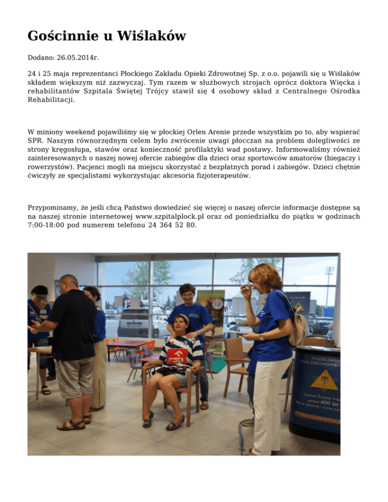 Gościnnie u Wiślaków Dodano: 26.05.2014r. 24 i 25 maja reprezentanci Płockiego Zakładu Opieki Zdrowotnej Sp. z o.o. pojawili się u Wiślaków składem większym niż zazwyczaj. Tym razem w służbowych strojach oprócz doktora Więcka i rehabilitantów Szpitala Świętej Trójcy stawił się 4 osobowy skład z Centralnego Ośrodka Rehabilitacji. W miniony weekend pojawiliśmy się w płockiej Orlen Arenie przede wszystkim po to, aby wspierać SPR. Naszym równorzędnym celem było zwrócenie uwagi płocczan na problem dolegliwości ze strony kręgosłupa, stawów oraz konieczność profilaktyki wad postawy. Informowaliśmy również zainteresowanych o naszej nowej ofercie zabiegów dla dzieci oraz sportowców amatorów (biegaczy i rowerzystów). Pacjenci mogli na miejscu skorzystać z bezpłatnych porad i zabiegów. Dzieci chętnie ćwiczyły ze specjalistami wykorzystując akcesoria fizjoterapeutów. Przypominamy, że jeśli chcą Państwo dowiedzieć się więcej o naszej ofercie informacje dostępne są na naszej stronie internetowej www.szpitalplock.pl oraz od poniedziałku do piątku w godzinach 7:00-18:00 pod numerem telefonu 24 364 52 80. Zdjęcia facebook