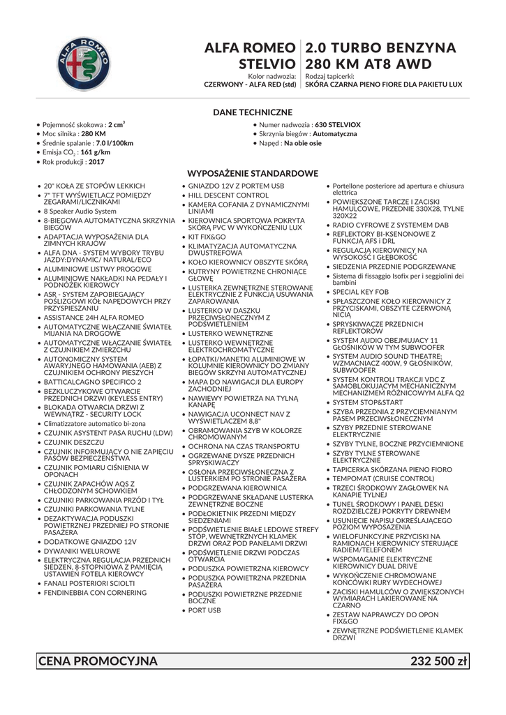 ALFA ROMEO 2.0 TURBO BENZYNA STELVIO 280 KM AT8 AWD Kolor nadwozia: CZERWONY - ALFA RED (std) Rodzaj tapicerki: SKÓRA CZARNA PIENO FIORE DLA PAKIETU LUX DANE TECHNICZNE • Pojemność skokowa : 2 cm • Moc silnika : 280 KM • Średnie spalanie : 7.0 l/100km • Emisja CO2 : 161 g/km • Rok produkcji : 2017 3 • Numer nadwozia : 630 STELVIOX • Skrzynia biegów : Automatyczna • Napęd : Na obie osie WYPOSAŻENIE STANDARDOWE • 20" KOŁA ZE STOPÓW LEKKICH • 7" TFT WYŚWIETLACZ POMIĘDZY ZEGARAMI/LICZNIKAMI • 8 Speaker Audio System • 8-BIEGOWA AUTOMATYCZNA SKRZYNIA BIEGÓW • ADAPTACJA WYPOSAŻENIA DLA ZIMNYCH KRAJÓW • ALFA DNA - SYSTEM WYBORY TRYBU JAZDY:DYNAMIC/ NATURAL/ECO • ALUMINIOWE LISTWY PROGOWE • ALUMINIOWE NAKŁADKI NA PEDAŁY I PODNÓŻEK KIEROWCY • ASR - SYSTEM ZAPOBIEGAJĄCY POŚLIZGOWI KÓŁ NAPĘDOWYCH PRZY PRZYSPIESZANIU • ASSISTANCE 24H ALFA ROMEO • AUTOMATYCZNE WŁĄCZANIE ŚWIATEŁ MIJANIA NA DROGOWE • AUTOMATYCZNE WŁĄCZANIE ŚWIATEŁ Z CZUJNIKIEM ZMIERZCHU • AUTONOMICZNY SYSTEM AWARYJNEGO HAMOWANIA (AEB) Z CZUJNIKIEM OCHRONY PIESZYCH • BATTICALCAGNO SPECIFICO 2 • BEZKLUCZYKOWE OTWARCIE PRZEDNICH DRZWI (KEYLESS ENTRY) • BLOKADA OTWARCIA DRZWI Z WEWNĄTRZ - SECURITY LOCK • Climatizzatore automatico bi-zona • CZUJNIK ASYSTENT PASA RUCHU (LDW) • CZUJNIK DESZCZU • CZUJNIK INFORMUJĄCY O NIE ZAPIĘCIU PASÓW BEZPIECZEŃSTWA • CZUJNIK POMIARU CIŚNIENIA W OPONACH • CZUJNIK ZAPACHÓW AQS Z CHŁODZONYM SCHOWKIEM • CZUJNIKI PARKOWANIA PRZÓD I TYŁ • CZUJNIKI PARKOWANIA TYLNE • DEZAKTYWACJA PODUSZKI POWIETRZNEJ PRZEDNIEJ PO STRONIE PASAŻERA • DODATKOWE GNIAZDO 12V • DYWANIKI WELUROWE • ELEKTRYCZNA REGULACJA PRZEDNICH SIEDZEŃ, 8-STOPNIOWA Z PAMIĘCIĄ USTAWIEŃ FOTELA KIEROWCY • FANALI POSTERIORI SCIOLTI • FENDINEBBIA CON CORNERING CENA PROMOCYJNA • GNIAZDO 12V Z PORTEM USB • HILL DESCENT CONTROL • KAMERA COFANIA Z DYNAMICZNYMI LINIAMI • KIEROWNICA SPORTOWA POKRYTA SKÓRĄ PVC W WYKOŃCZENIU LUX • KIT FIX&GO • KLIMATYZACJA AUTOMATYCZNA DWUSTREFOWA • KOŁO KIEROWNICY OBSZYTE SKÓRĄ • KUTRYNY POWIETRZNE CHRONIĄCE GŁOWĘ • LUSTERKA ZEWNĘTRZNE STEROWANE ELEKTRYCZNIE Z FUNKCJĄ USUWANIA ZAPAROWANIA • LUSTERKO W DASZKU PRZECIWSŁONECZNYM Z PODŚWIETLENIEM • LUSTERKO WEWNĘTRZNE • LUSTERKO WEWNĘTRZNE ELEKTROCHROMATYCZNE • ŁOPATKI/MANETKI ALUMINIOWE W KOLUMNIE KIEROWNICY DO ZMIANY BIEGÓW SKRZYNI AUTOMATYCZNEJ • MAPA DO NAWIGACJI DLA EUROPY ZACHODNIEJ • NAWIEWY POWIETRZA NA TYLNĄ KANAPĘ • NAWIGACJA UCONNECT NAV Z WYŚWIETLACZEM 8,8" • OBRAMOWANIA SZYB W KOLORZE CHROMOWANYM • OCHRONA NA CZAS TRANSPORTU • OGRZEWANE DYSZE PRZEDNICH SPRYSKIWACZY • OSŁONA PRZECIWSŁONECZNA Z LUSTERKIEM PO STRONIE PASAŻERA • PODGRZEWANA KIEROWNICA • PODGRZEWANE SKŁADANE LUSTERKA ZEWNĘTRZNE BOCZNE • PODŁOKIETNIK PRZEDNI MIĘDZY SIEDZENIAMI • PODŚWIETLENIE BIAŁE LEDOWE STREFY STÓP, WEWNĘTRZNYCH KLAMEK DRZWI ORAZ POD PANELAMI DRZWI • PODŚWIETLENIE DRZWI PODCZAS OTWARCIA • PODUSZKA POWIETRZNA KIEROWCY • PODUSZKA POWIETRZNA PRZEDNIA PASAŻERA • PODUSZKI POWIETRZNE PRZEDNIE BOCZNE • PORT USB • Portellone posteriore ad apertura e chiusura elettrica • POWIĘKSZONE TARCZE I ZACISKI HAMULCOWE, PRZEDNIE 330X28, TYLNE 320X22 • RADIO CYFROWE Z SYSTEMEM DAB • REFLEKTORY BI-KSENONOWE Z FUNKCJĄ AFS i DRL • REGULACJA KIEROWNICY NA WYSOKOŚĆ I GŁĘBOKOŚĆ • SIEDZENIA PRZEDNIE PODGRZEWANE • Sistema di fissaggio Isofix per i seggiolini dei bambini • SPECIAL KEY FOB • SPŁASZCZONE KOŁO KIEROWNICY Z PRZYCISKAMI, OBSZYTE CZERWONĄ NICIĄ • SPRYSKIWACZE PRZEDNICH REFLEKTORÓW • SYSTEM AUDIO OBEJMUJACY 11 GŁOŚNIKÓW W TYM SUBWOOFER • SYSTEM AUDIO SOUND THEATRE: WZMACNIACZ 400W, 9 GŁOŚNIKÓW, SUBWOOFER • SYSTEM KONTROLI TRAKCJI VDC Z SAMOBLOKUJĄCYM MECHANICZNYM MECHANIZMEM RÓŻNICOWYM ALFA Q2 • SYSTEM STOP&START • SZYBA PRZEDNIA Z PRZYCIEMNIANYM PASEM PRZECIWSŁONECZNYM • SZYBY PRZEDNIE STEROWANE ELEKTRYCZNIE • SZYBY TYLNE, BOCZNE PRZYCIEMNIONE • SZYBY TYLNE STEROWANE ELEKTRYCZNIE • TAPICERKA SKÓRZANA PIENO FIORO • TEMPOMAT (CRUISE CONTROL) • TRZECI ŚRODKOWY ZAGŁOWEK NA KANAPIE TYLNEJ • TUNEL ŚRODKOWY I PANEL DESKI ROZDZIELCZEJ POKRYTY DREWNEM • USUNIĘCIE NAPISU OKREŚLAJĄCEGO POZIOM WYPOSAZENIA • WIELOFUNKCYJNE PRZYCISKI NA RAMIONACH KIEROWNICY STERUJĄCE RADIEM/TELEFONEM • WSPOMAGANIE ELEKTRYCZNE KIEROWNICY DUAL DRIVE • WYKOŃCZENIE CHROMOWANE KOŃCÓWKI RURY WYDECHOWEJ • ZACISKI HAMULCÓW O ZWIĘKSZONYCH WYMIARACH LAKIEROWANE NA CZARNO • ZESTAW NAPRAWCZY DO OPON FIX&GO • ZEWNĘTRZNE PODŚWIETLENIE KLAMEK DRZWI 232 500 zł Niniejsze ogłoszenie jest wyłącznie informacją handlową i nie stanowi oferty w myśl art. 66, § 1. Kodeksu Cywilnego. Sprzedający nie odpowiada za ewentualne błędy lub nieaktualność ogłoszenia.