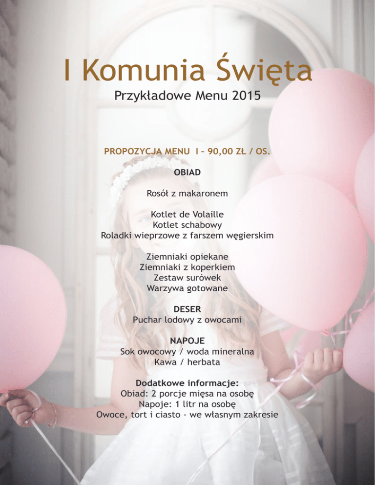 I Komunia Święta Przykładowe Menu 2015 PROPOZYCJA MENU I – 90,00 ZŁ / OS. OBIAD Rosół z makaronem Kotlet de Volaille Kotlet schabowy Roladki wieprzowe z farszem węgierskim Ziemniaki opiekane Ziemniaki z koperkiem Zestaw surówek Warzywa gotowane DESER Puchar lodowy z owocami NAPOJE Sok owocowy / woda mineralna Kawa / herbata Dodatkowe informacje: Obiad: 2 porcje mięsa na osobę Napoje: 1 litr na osobę Owoce, tort i ciasto - we własnym zakresie PROPOZYCJA MENU II – 130,00 ZŁ / OS. OBIAD Rosół z makaronem Kotlet de Volaille Kotlet schabowy Roladki wieprzowe z farszem węgierskim Ziemniaki opiekane Ziemniaki z koperkiem Zestaw surówek Warzywa gotowane DESER Puchar lodowy z owocami KOLACJA Szynka ze szparagami Rulon drobiowy z papryko i ze szpinakiem Schab ze śliwką lub morelą Kiełbaski delikatesowe Łosoś wędzony z cytrynką Sałatka jarzynowa Sałatka szopska Pieczywo / masło Sos cumberland / tatarski NAPOJE Sok owocowy / woda mineralna Kawa / herbata Dodatkowe informacje: Obiad: 2 porcje mięsa na osobę Kolacja: 3 porcje na osobę Napoje: 1 litr na osobę Owoce, tort i ciasto - we własnym zakresie