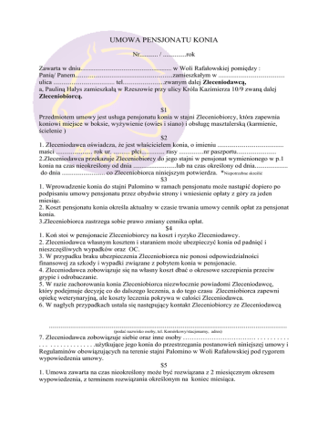 UMOWA PENSJONATU KONIA Nr........... / ..............rok Zawarta w dniu....................................................... w Woli Rafałowskiej pomiędzy : Panią/ Panem...........................................................zamieszkałym w ........................................ ulica ..................................... tel.........................zwanym dalej Zleceniodawcą, a, Pauliną Hałys zamieszkałą w Rzeszowie przy ulicy Króla Kazimierza 10/9 zwaną dalej Zleceniobiorcą. $1 Przedmiotem umowy jest usługa pensjonatu konia w stajni Zleceniobiorcy, która zapewnia koniowi miejsce w boksie, wyŜywienie (owies i siano) i obsługę masztalerską (karmienie, ścielenie ) $2 1. Zleceniodawca oświadcza, Ŝe jest właścicielem konia, o imieniu ........................................ maści ...................... rok ur. .......... płci.............. rasy ...............nr paszportu........................ 2.Zleceniodawca przekazuje Zleceniobiorcy do jego stajni w pensjonat wymienionego w p.1 konia na czas nieokreślony od dnia ..........................lub na czas określony od dnia.................... do dnia .......................... co Zleceniobiorca niniejszym potwierdza. *Niepotrzebne skreślić $3 1. Wprowadzenie konia do stajni Palomino w ramach pensjonatu moŜe nastąpić dopiero po podpisaniu umowy pensjonatu przez obydwie strony i wniesienie opłaty z góry za jeden miesiąc. 2. Koszt pensjonatu konia określa aktualny w czasie trwania umowy cennik opłat za pensjonat konia. 3.Zleceniobiorca zastrzega sobie prawo zmiany cennika opłat. $4 1. Koń stoi w pensjonacie Zleceniobiorcy na koszt i ryzyko Zleceniodawcy. 2. Zleceniodawca własnym kosztem i staraniem moŜe ubezpieczyć konia od padnięć i nieszczęśliwych wypadków oraz OC. 3. W przypadku braku ubezpieczenia Zleceniobiorca nie ponosi odpowiedzialności finansowej za szkody i wypadki związane z pobytem konia w pensjonacie. 4. Zleceniodawca zobowiązuje się na własny koszt dbać o okresowe szczepienia przeciw grypie i odrobaczanie. 5. W razie zachorowania konia Zleceniobiorca niezwłocznie powiadomi Zleceniodawcę, który podejmuje decyzję co do dalszego leczenia, a do tego czasu Zleceniobiorca zapewni opiekę weterynaryjną, ale koszty leczenia pokrywa w całości Zleceniodawca. 6. W nagłych przypadkach ustala się następujący kontakt Zleceniobiorcy ze Zleceniodawcą ................................................................................................................................................ (podać nazwisko osoby, tel. Komórkowy/stacjonarny, adres) 7. Zleceniodawca zobowiązuje siebie oraz inne osoby …………………………… . . . . . . . . . . . . . . . . . . . . . . . . . . .uŜytkujące jego konia do przestrzegania postanowień niniejszej umowy i Regulaminów obowiązujących na terenie stajni Palomino w Woli Rafałowskiej pod rygorem wypowiedzenia umowy. $5 1. Umowa zawarta na czas nieokreślony moŜe być rozwiązana z 2 miesięcznym okresem wypowiedzenia, z terminem rozwiązania określonym na koniec miesiąca. 2. Uprawnienie do rozwiązania umowy bez podania przyczyny przysługuje kaŜdej ze stron z zachowaniem terminu wypowiedzenia. 3. Na drodze porozumienia stron umowa moŜe zostać rozwiązana w kaŜdym innym terminie. 4. Wypowiedzenie wymaga formy pisemnej. $6 1.Zleceniobiorca zastrzega sobie prawo rozwiązania umowy szczególnie w następujących przypadkach: a) nie ponoszenie opłat za pobyt konia za 3 miesiące b) raŜące naruszanie postanowień Regulaminów obowiązujących u Zleceniobiorcy 2. Bez uregulowania wszelkich naleŜności wynikających z tej umowy Zleceniodawcy nie wolno wyprowadzić konia poza teren stajni bez uzgodnienia. Koń będzie stanowił zabezpieczenie naleŜności do momentu ostatecznego rozliczenia finansowego. $7 Integralną część umowy stanowią załączniki: Zał. Nr1 Oświadczenie Zleceniodawcy o stanie zdrowia konia Zał. Nr2 Wykaz osób uprawnionych do zajmowania się pielęgnacją i uŜytkowaniem konia Zał. Nr3 Aktualny cennik opłat za pensjonat konia. $8 W sprawach nieuregulowanych niniejszą umową obowiązuje kodeks cywilny. $9 Umowę sporządzono w dwóch jednobrzmiących egzemplarzach po 1 dla kaŜdej ze stron. Zleceniodawca ............................................. Zleceniobiorca 1. ................................................ 2. ................................................ (czytelny podpis / pieczątka) (czytelny podpis / pieczątka) Załącznik Nr 1 do Umowy Pensjonatu Nr ……./......... . Oświadczenie o stanie zdrowia konia 1. Koń jest wolny od chorób zakaźnych oraz posiada aktualne dokumenty szczepień. Data ostatniego szczepienia wykonanego przez lekarza weterynarii Data Imię i nazwisko lek. wet. Lub kserokopia odpowiednich dokumentów – paszport, zaświadczenie lek wet. (oryginały do wglądu). 2. Koń posiada następujące wady, narowy i nałogi: ………………………………………………………………………………………… ………………………………………………………………………………………… ………………………………. Podpis Zleceniodawcy Załącznik Nr 2 Wykaz osób uprawnionych do uŜytkowania, pielęgnacji konia poza pracownikami stajni Lp. Imię i nazwisko Rok urodzenia Adres, telefon Funkcja (trener, jeździec, lekarz itp.) ………………………………. Podpis Zleceniodawcy Załącznik Nr 3 CENNIK OPŁAT Za pensjonat konia i korzystania z ujeŜdŜalni I Za pensjonat konia – umowa na czas nieokreślony 1. 550zł/miesiąc – dla wpłacających do dnia 10 bieŜącego miesiąca – (pełny miesiąc kalendarzowy bez względu na ilość dni w miesiącu). 2. 600zł/miesiąc ; - dla wpłacających od dnia 11 do końca bieŜącego miesiąca rozliczeniowego – (pełny miesiąc kalendarzowy bez względu na ilość dni w miesiącu). 3. 25zł x ilość dni w miesiącu – dla rozliczających się za miniony miesi
