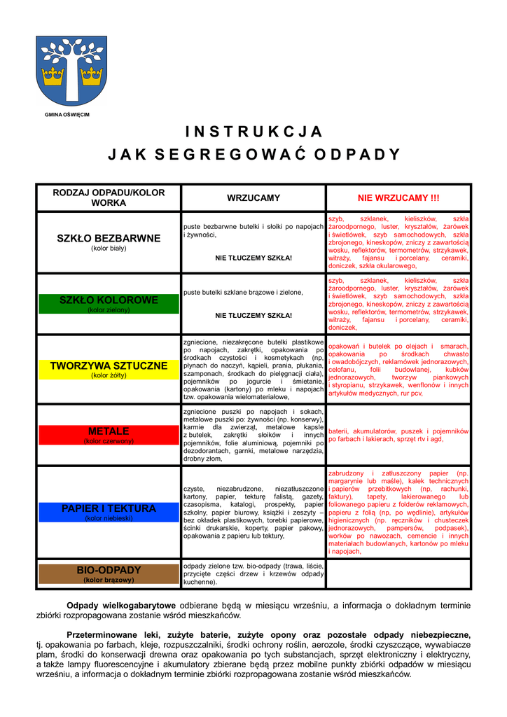 GMINA OŚWIĘCIM INSTRUKCJA JAK S EG REG OWAĆ O DPADY RODZAJ ODPADU/KOLOR WORKA SZKŁO BEZBARWNE (kolor biały) WRZUCAMY szyb, szklanek, kieliszków, szkła puste bezbarwne butelki i słoiki po napojach żaroodpornego, luster, kryształów, żarówek i żywności, i świetlówek, szyb samochodowych, szkła zbrojonego, kineskopów, zniczy z zawartością wosku, reflektorów, termometrów, strzykawek, NIE TŁUCZEMY SZKŁA! witraży, fajansu i porcelany, ceramiki, doniczek, szkła okularowego, puste butelki szklane brązowe i zielone, SZKŁO KOLOROWE (kolor zielony) TWORZYWA SZTUCZNE (kolor żółty) METALE (kolor czerwony) PAPIER I TEKTURA (kolor niebieski) BIO-ODPADY (kolor brązowy) NIE WRZUCAMY !!! NIE TŁUCZEMY SZKŁA! zgniecione, niezakręcone butelki plastikowe po napojach, zakrętki, opakowania po środkach czystości i kosmetykach (np, płynach do naczyń, kąpieli, prania, płukania, szamponach, środkach do pielęgnacji ciała), pojemników po jogurcie i śmietanie, opakowania (kartony) po mleku i napojach tzw. opakowania wielomateriałowe, szyb, szklanek, kieliszków, szkła żaroodpornego, luster, kryształów, żarówek i świetlówek, szyb samochodowych, szkła zbrojonego, kineskopów, zniczy z zawartością wosku, reflektorów, termometrów, strzykawek, witraży, fajansu i porcelany, ceramiki, doniczek, opakowań i butelek po olejach i smarach, opakowania po środkach chwasto i owadobójczych, reklamówek jednorazowych, celofanu, folii budowlanej, kubków jednorazowych, tworzyw piankowych i styropianu, strzykawek, wenflonów i innych artykułów medycznych, rur pcv, zgniecione puszki po napojach i sokach, metalowe puszki po: żywności (np. konserwy), karmie dla zwierząt, metalowe kapsle baterii, akumulatorów, puszek i pojemników z butelek, zakrętki słoików i innych po farbach i lakierach, sprzęt rtv i agd, pojemników, folie aluminiową, pojemniki po dezodorantach, garnki, metalowe narzędzia, drobny złom, czyste, niezabrudzone, niezatłuszczone kartony, papier, tekturę falistą, gazety, czasopisma, katalogi, prospekty, papier szkolny, papier biurowy, książki i zeszyty – bez okładek plastikowych, torebki papierowe, ścinki drukarskie, koperty, papier pakowy, opakowania z papieru lub tektury, zabrudzony i zatłuszczony papier (np. margarynie lub maśle), kalek technicznych i papierów przebitkowych (np, rachunki, faktury), tapety, lakierowanego lub foliowanego papieru z folderów reklamowych, papieru z folią (np, po wędlinie), artykułów higienicznych (np. ręczników i chusteczek jednorazowych, pampersów, podpasek), worków po nawozach, cemencie i innych materiałach budowlanych, kartonów po mleku i napojach, odpady zielone tzw. bio-odpady (trawa, liście, przycięte części drzew i krzewów odpady kuchenne). Odpady wielkogabarytowe odbierane będą w miesiącu wrześniu, a informacja o dokładnym terminie zbiórki rozpropagowana zostanie wśród mieszkańców. Przeterminowane leki, zużyte baterie, zużyte opony oraz pozostałe odpady niebezpieczne, tj. opakowania po farbach, kleje, rozpuszczalniki, środki ochrony roślin, aerozole, środki czyszczące, wywabiacze plam, środki do konserwacji drewna oraz opakowania po tych substancjach, sprzęt elektroniczny i elektryczny, a także lampy fluorescencyjne i akumulatory zbierane będą przez mobilne punkty zbiórki odpadów w miesiącu wrześniu, a informacja o dokładnym terminie zbiórki rozpropagowana zostanie wśród mieszkańców.
