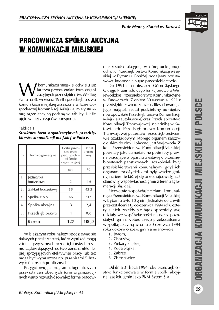 PRACOWNICZA SPÓ£KA AKCYJNA W KOMUNIKACJI MIEJSKIEJ Piotr Heine, Stanis³aw Karasek W komunikacji miejskiej od wielu ju¿ lat trwa proces zmian form organi zacyjnych przedsiêbiorstw. Wed³ug stanu na 30 wrzenia 1998 r przedsiêbiorstwa komunikacji miejskiej zrzeszone w Izbie Gospodarczej Komunikacji Miejskiej mia³y strukturê organizacyjn¹ podan¹ w tablicy 1. Nie ujêto w niej zarz¹dów transportu. Tablica 1 Struktura form organizacyjnych przedsiêbiorstw komunikacji miejskiej w Polsce. Lp. Forma organizacyjna Liczba przedsiêbiorstw pracuj¹cych w tej formie organizacyjnej Udzia³ procen-towy szt. % 1. Jednostka bud¿etowa 2 1,6 2. Zak³ad bud¿etowy 55 43.3 3. Spó³ka z o.o. 66 51,9 4. Spó³ka akcyjna 3 2,4 5. Przedsiêbiorstwo 1 0,8 127 100,0 Razem W bie¿¹cym roku nale¿y spodziewaæ siê dalszych przekszta³ceñ, które wynikaæ mog¹ z inicjatywy samych przedsiêbiorstw lub samorz¹dów d¹¿¹cych do tworzenia struktur lepiej sprzyjaj¹cych efektywnej pracy lub te¿ mog¹ byæ wymuszone np. przepisami Ustawy o finansach publicznych. Przygotowuj¹c program d³ugofalowych przekszta³ceñ obecnych form organizacyjnych warto rozwa¿yæ równie¿ formê pracow- Biuletyn Komunikacji Miejskiej nr 45 niczej spó³ki akcyjnej, w której funkcjonuje od roku Przedsiêbiorstwo Komunikacji Miejskiej w Bytomiu. Poni¿ej podajemy podstawowe informacje o tym przedsiêbiorstwie. Do 1991 r na obszarze Górnol¹skiego Okrêgu Przemys³owego funkcjonowa³o Wojewódzkie Przedsiêbiorstwo Komunikacyjne w Katowicach. Z dniem 30 wrzenia 1991 r przedsiêbiorstwo to zosta³o zlikwidowane, a jego maj¹tek zosta³ podzielony pomiêdzy nowopowsta³e Przedsiêbiorstwa Komunikacji Miejskiej (autobusowe) oraz Przedsiêbiorstwo Komunikacji Tramwajowej z siedzib¹ w Katowicach. Przedsiêbiorstwo Komunikacji Tramwajowej pozosta³o przedsiêbiorstwem wielozak³adowym, którego organem za³o¿ycielskim do chwili obecnej jest Wojewoda. Z kolei Przedsiêbiorstwa Komunikacji Miejskiej powsta³y jako samodzielne podmioty prawne pracuj¹ce w oparciu o ustawê o przedsiêbiorstwach pañstwowych, aczkolwiek by³y przedsiêbiorstwami komunalnymi, gdy¿ ich organami za³o¿ycielskimi by³y w³adze gminy, na terenie której siê one znajdowa³y, za stanowi³y wspó³w³asnoæ gmin z terenu aglomeracji l¹skiej. Pierwotnie wspó³w³acicielami komunalnego Przedsiêbiorstwa Komunikacji Miejskiej w Bytomiu by³o 10 gmin. Jednak¿e do chwili przekszta³cenia tj. do czerwca 1994 roku cztery z nich zrzek³y siê b¹d sprzeda³y swe udzia³y we wspó³w³asnoci na rzecz pozosta³ych gmin, wobec czego przekszta³cenia w spó³kê akcyjn¹ w dniu 30 czerwca 1994 roku dokona³o szeæ gmin a mianowicie: 1. Bytom, 2. Chorzów, 3. Piekary l¹skie, 4. Ruda l¹ska, 5. Zabrze, 6. Zbros³awice. Od dnia 01 lipca 1994 roku przedsiêbiorstwo funkcjonowa³o w formie spó³ki akcyjnej szeciu gmin jako PKM Bytom S.A. 0RGANIZACJA KOMUNIKACJI MIEJSKIEJ W POLSCE PRACOWNICZA SPÓ£KA AKCYJNA W KOMUNIKACJI MIEJSKIEJ 32 Podstawowym powodem wyboru tej for− my prawnej był fakt, że spółka winna zapew− nić realizację zadania własnego gmin, jakim jest zapewnienie wykonywania usług komu− nikacji miejskiej oraz nieprzerwane i ciągłe zaspakajanie potrzeb lokalnych społeczności w zakresie przemieszczania się. Tym samym spółka ukierunkowana została na zapewnie− nie dostępności świadczonych usług i reali− zację zadań własnych swych założycieli a nie na osiąganie celów gospodarczych. W celu realizacji swych zadań nie mogła więc być to spółka z ograniczoną odpowiedzialnością, gdyż artykuł 158 § 1 kodeksu handlowego stwierdza, że “Spółki z ograniczoną odpowie− dzialnością mogą być tworzone w celach gospodarczych...”. Nie jest zaś celem gospo− darczym zapewnienie wykonania zadań, o których mowa wyżej. Takiego ograniczenia, jak przy spółce z o.o. kodeks handlowy nie zawiera przy spółce akcyjnej, co z punktu widzenia założycieli PKM Bytom S.A. prze− sądziło o wyborze tej formy prawnej. Zgodnie z postanowieniami Statutu PKM Bytom S.A. przedmiotem przedsiębiorstwa spółki jest bowiem wszelka działalność usłu− gowo−produkcyjna i handlowa a w szczegól− ności zaspakajanie potrzeb zbiorowych wspólnot gminnych, podmiotów gospodar− czych i osób fizycznych w zakresie: − realizacji transportu zbiorowego, − wytwarzania i dystrybucji biletów, − diagnostyki i naprawy pojazdów, − regeneracji podzespołów i części za− miennych maszyn i urządzeń, − importu wyrobów, materiałów pędnych, części i akcesorii samochodowych, − dystrybucji paliw, olejów, części i ak− cesorii samochodowych, − świadczenia innych usług związanych z wykonywaniem transportu zbiorowego. Fundusz założycielski i fundusz przedsię− biorstwa dotychczasowego przedsiębiorstwa komunalnego utworzyły kapitał własny spół− ki. Kapitał akcyjny wyniósł 700.000,−PLN, zaś pozostała część została przeznaczona na ka− pitał zapasowy. Kapitał akcyjny stanowił od− zwierciedlenie 14.000 sztuk akcji imiennych o wartości 50, −PLN każda. Wszystkie akcje objęły gminy – założyciele spółki i były one imiennymi akcjami założycielskimi. Dla ak− Biuletyn Komunikacji Miejskiej nr 45 cji tych przyjęto oznaczenie serii A. W przy− padku następnych emisji akcje nosić będą oznaczenia kolejnych serii (seria B, seria C itd.) i będą akcjami na okaziciela chyba, że Walne Zgromadzenie Akcjonariuszy postano− wi inaczej. Zgodnie ze Statutem spółki akcje imienne mogą być zamieniane na akcje na okaziciela bądź zbywane tylko za zgodą spół− ki. W razie odmowy wyrażenia zgody z uza− sadnionych powodów na zbycie akcji imien− nych Zarząd spółki ma obowiązek wskazać w terminie do trzech miesięcy nabywcę (in− nego, niż dotychczas proponowany przez zbywającego akcje imienne), na nabycie przez którego akcji zgodę wyrazi. Na mocy obowiązując