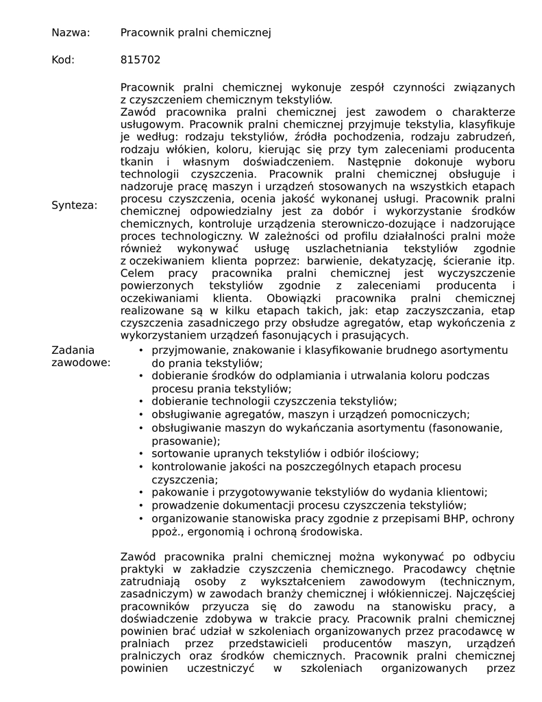 Nazwa: Pracownik pralni chemicznej Kod: 815702 Pracownik pralni chemicznej wykonuje zespół czynności związanych z czyszczeniem chemicznym tekstyliów. Zawód pracownika pralni chemicznej jest zawodem o charakterze usługowym. Pracownik pralni chemicznej przyjmuje tekstylia, klasyfikuje je według: rodzaju tekstyliów, źródła pochodzenia, rodzaju zabrudzeń, rodzaju włókien, koloru, kierując się przy tym zaleceniami producenta tkanin i własnym doświadczeniem. Następnie dokonuje wyboru technologii czyszczenia. Pracownik pralni chemicznej obsługuje i nadzoruje pracę maszyn i urządzeń stosowanych na wszystkich etapach procesu czyszczenia, ocenia jakość wykonanej usługi. Pracownik pralni Synteza: chemicznej odpowiedzialny jest za dobór i wykorzystanie środków chemicznych, kontroluje urządzenia sterowniczo-dozujące i nadzorujące proces technologiczny. W zależności od profilu działalności pralni może również wykonywać usługę uszlachetniania tekstyliów zgodnie z oczekiwaniem klienta poprzez: barwienie, dekatyzację, ścieranie itp. Celem pracy pracownika pralni chemicznej jest wyczyszczenie powierzonych tekstyliów zgodnie z zaleceniami producenta i oczekiwaniami klienta. Obowiązki pracownika pralni chemicznej realizowane są w kilku etapach takich, jak: etap zaczyszczania, etap czyszczenia zasadniczego przy obsłudze agregatów, etap wykończenia z wykorzystaniem urządzeń fasonujących i prasujących. Zadania • przyjmowanie, znakowanie i klasyfikowanie brudnego asortymentu zawodowe: do prania tekstyliów; • dobieranie środków do odplamiania i utrwalania koloru podczas procesu prania tekstyliów; • dobieranie technologii czyszczenia tekstyliów; • obsługiwanie agregatów, maszyn i urządzeń pomocniczych; • obsługiwanie maszyn do wykańczania asortymentu (fasonowanie, prasowanie); • sortowanie upranych tekstyliów i odbiór ilościowy; • kontrolowanie jakości na poszczególnych etapach procesu czyszczenia; • pakowanie i przygotowywanie tekstyliów do wydania klientowi; • prowadzenie dokumentacji procesu czyszczenia tekstyliów; • organizowanie stanowiska pracy zgodnie z przepisami BHP, ochrony ppoż., ergonomią i ochroną środowiska. Zawód pracownika pralni chemicznej można wykonywać po odbyciu praktyki w zakładzie czyszczenia chemicznego. Pracodawcy chętnie zatrudniają osoby z wykształceniem zawodowym (technicznym, zasadniczym) w zawodach branży chemicznej i włókienniczej. Najczęściej pracowników przyucza się do zawodu na stanowisku pracy, a doświadczenie zdobywa w trakcie pracy. Pracownik pralni chemicznej powinien brać udział w szkoleniach organizowanych przez pracodawcę w pralniach przez przedstawicieli producentów maszyn, urządzeń pralniczych oraz środków chemicznych. Pracownik pralni chemicznej powinien uczestniczyć w szkoleniach organizowanych przez stowarzyszenia i inne organizacje branżowe. Dodatkowe zadania Uwaga – opis standardów kompetencji zawodowych dla tego zawodu zawodowe: można znaleźć w bazie danych: www.kwalifikacje.praca.gov.pl