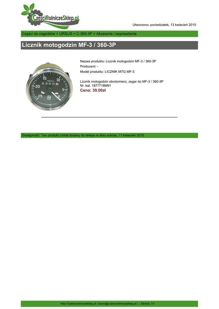 Utworzono: poniedziałek, 13 kwiecień 2015 Części do ciągników > URSUS > C-360-3P > Akcesoria i wyposażenie Licznik motogodzin MF-3 / 360-3P Nazwa produktu: Licznik motogodzin MF-3 / 360-3P Producent: Model produktu: LICZNIK MTG MF-3 Licznik motogodzin obrotomierz, zegar do MF-3 / 360-3P Nr. kat. 1877718M91 Cena: 39.00zł Dostępność: Ten produkt został dodany do sklepu w dniu sobota, 11 kwiecień 2015 http://czescirolniczesklep.pl | [email protected] | | Strona 1/1