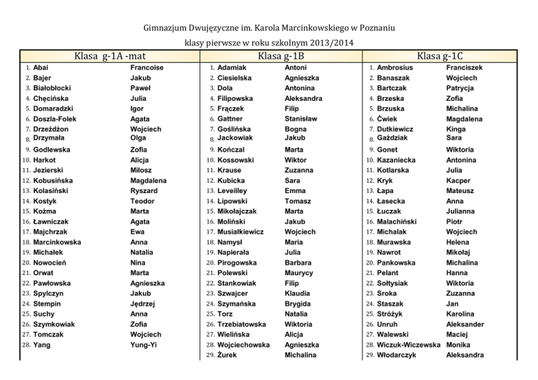 Gimnazjum Dwujęzyczne im. Karola Marcinkowskiego w Poznaniu klasy pierwsze w roku szkolnym 2013/2014 Klasa g-1A -mat 1. Abai 2. Bajer 3. Białobłocki 4. Chęcińska 5. Domaradzki 6. Doszla-Folek 7. DrzeŜdŜon 8. Drzymała 9. Godlewska 10. Harkot 11. Jezierski 12. Kobusińska 13. Kolasiński 14. Kostyk 15. Koźma 16. Ławniczak 17. Majchrzak 18. Marcinkowska 19. Michałek 20. Nowocień 21. Orwat 22. Pawłowska 23. Spylczyn 24. Stempin 25. Suchy 26. Szymkowiak 27. Tomczak 28. Yang Klasa g-1B Francoise Jakub Paweł Julia Igor Agata Wojciech Olga 1. Adamiak Zofia Alicja Miłosz Magdalena Ryszard Teodor Marta Agata Ewa Anna Natalia Nina Marta Agnieszka Jakub Jędrzej Anna Zofia Wojciech Yung-Yi 9. Kończal 2. Ciesielska 3. Dola 4. Filipowska 5. Frączek 6. Gattner 7. Goślińska 8. Jackowiak 10. Kossowski 11. Krause 12. Kubicka 13. Leveilley 14. Lipowski 15. Mikołajczak 16. Moliński 17. Musiałkiewicz 18. Namysł 19. Napierała 20. Pirogowska 21. Polewski 22. Stankowiak 23. Szwajcer 24. Szymańska 25. Torz 26. Trzebiatowska 27. Wielińska 28. Wojciechowska 29. śurek Klasa g-1C Antoni Agnieszka Antonina Aleksandra Filip Stanisław Bogna Jakub 1. Ambrosius Marta Wiktor Zuzanna Sara Emma Tomasz Marta Jakub Wojciech Maria Julia Barbara Maurycy Filip Klaudia Brygida Natalia Wiktoria Alicja Agnieszka Michalina 9. Gonet 2. Banaszak 3. Bartczak 4. Brzeska 5. Brzuska 6. Ćwiek 7. Dutkiewicz 8. Gaździak Franciszek Wojciech Patrycja Zofia Michalina Magdalena Kinga Sara Wiktoria 10. Kazaniecka Antonina 11. Kotlarska Julia 12. Kryk Kacper 13. Łapa Mateusz 14. Łasecka Anna 15. Łuczak Julianna 16. Malachiński Piotr 17. Michalak Wojciech 18. Murawska Helena 19. Nawrot Mikołaj 20. Pankowska Michalina 21. Pelant Hanna 22. Sołtysiak Wiktoria 23. Sroka Zuzanna 24. Staszak Jan 25. StróŜyk Karolina 26. Unruh Aleksander 27. Walewski Maciej 28. Wiczuk-Wiczewska Monika 29. Włodarczyk Aleksandra