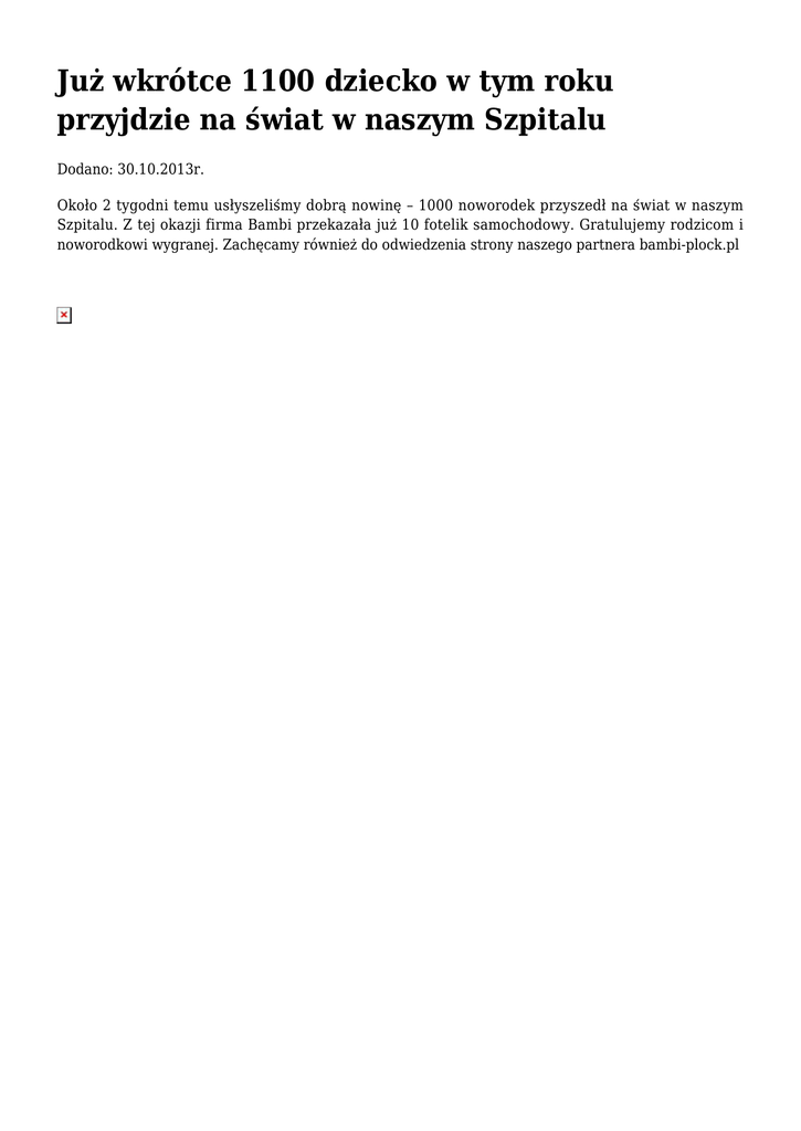 Już wkrótce 1100 dziecko w tym roku przyjdzie na świat w naszym Szpitalu Dodano: 30.10.2013r. Około 2 tygodni temu usłyszeliśmy dobrą nowinę – 1000 noworodek przyszedł na świat w naszym Szpitalu. Z tej okazji firma Bambi przekazała już 10 fotelik samochodowy. Gratulujemy rodzicom i noworodkowi wygranej. Zachęcamy również do odwiedzenia strony naszego partnera bambi-plock.pl