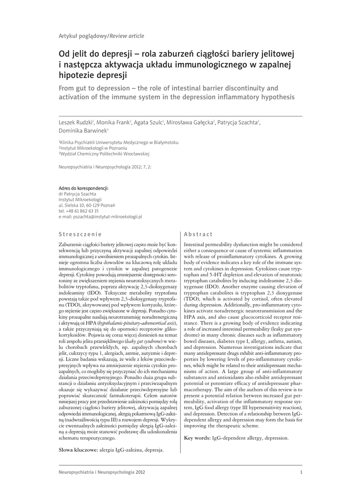 Artykuł poglądowy/Review article Od jelit do depresji – rola zaburzeń ciągłości bariery jelitowej i następcza aktywacja układu immunologicznego w zapalnej hipotezie depresji From gut to depression – the role of intestinal barrier discontinuity and activation of the immune system in the depression inflammatory hypothesis Leszek Rudzki1, Monika Frank2, Agata Szulc1, Mirosława Gałęcka2, Patrycja Szachta2, Dominika Barwinek3 1Klinika Psychiatrii Uniwersytetu Medycznego w Białymstoku Mikroekologii w Poznaniu 3Wydział Chemiczny Politechniki Wrocławskiej 2Instytut Neuropsychiatria i Neuropsychologia 2012; 7, 2: Adres do korespondencji: dr Patrycja Szachta Instytut Mikroekologii ul. Sielska 10, 60-129 Poznań tel. +48 61 862 63 15 e-mail: [email protected] Streszczenie Abstract Zaburzenie ciągłości bariery jelitowej często może być konsekwencją lub przyczyną aktywacji zapalnej odpowiedzi immunologicznej z uwolnieniem prozapalnych cytokin. Istnieje ogromna liczba dowodów na kluczową rolę układu immunologicznego i cytokin w zapalnej patogenezie depresji. Cytokiny powodują zmniejszenie dostępności serotoniny ze zwiększeniem stężenia neurotoksycznych metabolitów tryptofanu, poprzez aktywację 2,3-dioksygenazy indoleaminy (IDO). Toksyczne metabolity tryptofanu powstają także pod wpływem 2,3-dioksygenazy tryptofanu (TDO), aktywowanej pod wpływem kortyzolu, którego stężenie jest często zwiększone w depresji. Ponadto cytokiny prozapalne nasilają neurotransmisję noradrenergiczną i aktywują oś HPA (hypothalamic-pituitary-adrenocortical axis), a także przyczyniają się do oporności receptorów glikokortykoidów. Pojawia się coraz więcej doniesień na temat roli zespołu jelita przesiękliwego (leaky gut syndrome) w wielu chorobach przewlekłych, np. zapalnych chorobach jelit, cukrzycy typu 1, alergiach, astmie, autyzmie i depresji. Liczne badania wskazują, że wiele z leków przeciwdepresyjnych wpływa na zmniejszenie stężenia cytokin prozapalnych, co mogłoby się przyczyniać do ich mechanizmu działania przeciwdepresyjnego. Ponadto duża grupa substancji o działaniu antyoksydacyjnym i przeciwzapalnym okazuje się wykazywać działanie przeciwdepresyjne lub poprawiać skuteczność farmakoterapii. Celem autorów niniejszej pracy jest przedstawienie zależności pomiędzy rolą zaburzonej ciągłości bariery jelitowej, aktywacją zapalnej odpowiedzi immunologicznej, alergią pokarmową IgG-zależną (nadwrażliwością typu III) a rozwojem depresji. Wykrycie ewentualnych zależności pomiędzy alergią IgG-zależną a depresją może stanowić podstawę dla udoskonalenia schematu terapeutycznego. Intestinal permeability dysfunction might be considered either a consequence or cause of systemic inflammation with release of proinflammatory cytokines. A growing body of evidence indicates a key role of the immune system and cytokines in depression. Cytokines cause tryptophan and 5-HT depletion and elevation of neurotoxic tryptophan catabolites by inducing indoleamine 2,3 dioxygenase (IDO). Another enzyme causing elevation of tryptophan catabolites is tryptophan 2,3 dioxygenase (TDO), which is activated by cortisol, often elevated during depression. Additionally, pro-inflammatory cytokines activate noradrenergic neurotransmission and the HPA axis, and also cause glucocorticoid receptor resistance. There is a growing body of evidence indicating a role of increased intestinal permeability (leaky gut syndrome) in many chronic diseases such as inflammatory bowel diseases, diabetes type I, allergy, asthma, autism, and depression. Numerous investigations indicate that many antidepressant drugs exhibit anti-inflammatory properties by lowering levels of pro-inflammatory cytokines, which might be related to their antidepressant mechanisms of action. A large group of anti-inflammatory substances and antioxidants also exhibit antidepressant potential or potentiate efficacy of antidepressant pharmacotherapy. The aim of the authors of this review is to present a potential relation between increased gut permeability, activation of the inflammatory response system, IgG food allergy (type III hypersensitivity reaction), and depression. Detection of a relationship between IgGdependent allergy and depression may form the basis for improving the therapeutic scheme. Key words: IgG-dependent allergy, depression. Słowa kluczowe: alergia IgG-zależna, depresja. Neuropsychiatria i Neuropsychologia 2012 1 Leszek Rudzki, Monika Frank, Agata Szulc, Mirosława Gałęcka, Patrycja Szachta, Dominika Barwinek Wstęp Według Światowej Organizacji Zdrowia (World Health Organization – WHO) do 2020 r. depresja stanie się drugą co do częstości występowania chorobą na świecie, ze średnią częstością w ciągu życia sięgającą 15%. W ostatnich 20 latach pojawiła się ogromna liczba dowodów wskazujących na zapalne podłoże depresji. Jej występowanie wykazuje ścisły związek z wieloma chorobami somatycznymi i przewlekłymi. Istnieje wiele analogii pomiędzy objawami depresji a fizjologiczną reakcją organizmu towarzyszącą infekcji i zapaleniu. Obserwacje te sugerują, że depresja może być postrzegana jako zaburzenie psychoneuroimmunologiczne, w którym kluczową rolę odgrywają cytokiny wpływające na funkcje neurochemiczne i neuroendokrynne. Depresji towarzyszy ogólnoustrojowa reakcja zapalna, za czym przemawiają zwiększone stężenia cytokin prozapalnych: interleukiny (IL)-1β, IL-5, IL-6 i czynnika martwicy nowotworu α (tumor necrosis factor α – TNF-α), zwiększone stężenia osoczowych pozytywnych białek ostrej fazy, np. haptoglobiny, i zmniejszone stężenia negatywnych białek ostrej fazy, takich jak albuminy czy transferyna (Maes 1993, 1995; Song i wsp. 1994; Myint i wsp. 2005; Elomaa i wsp. 2012). Współzależność aktywacji układu immunologicznego w depresji jest dodatkowo poparta częstym współwystępowaniem depresji z chorobami zapaln