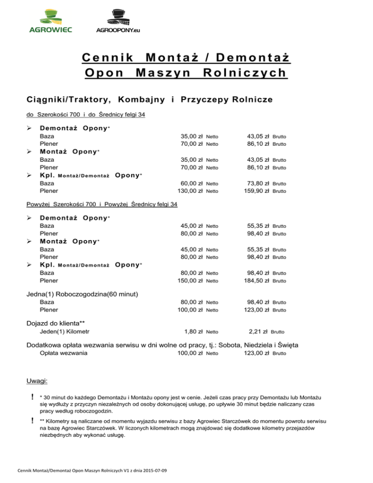 Cennik Montaż / Demontaż Opon Maszyn Rolniczych Ciągniki/Traktory, Kombajny i Przyczepy Rolnicze do Szerokości 700 i do Średnicy felgi 34 Demont aż Opony * 35,00 zł Netto 70,00 zł Netto 43,05 zł Brutto 86,10 zł Brutto 35,00 zł Netto 70,00 zł Netto 43,05 zł Brutto 86,10 zł Brutto 60,00 zł Netto 130,00 zł Netto 73,80 zł Brutto 159,90 zł Brutto Baza Plener Montaż Opony * Baza Plener Kpl. Montaż/Demontaż Opony * Baza Plener Powyżej Szerokości 700 i Powyżej Średnicy felgi 34 Demont aż Opony * Baza Plener 55,35 zł Brutto 98,40 zł Brutto 45,00 zł Netto 80,00 zł Netto 55,35 zł Brutto 98,40 zł Brutto 80,00 zł Netto 150,00 zł Netto 98,40 zł Brutto 184,50 zł Brutto 80,00 zł Netto 100,00 zł Netto 98,40 zł Brutto 123,00 zł Brutto 1,80 zł Netto 2,21 zł Brutto Montaż Opony * Baza Plener 45,00 zł Netto 80,00 zł Netto Kpl. Montaż/Demontaż Opony * Baza Plener Jedna(1) Roboczogodzina(60 minut) Baza Plener Dojazd do klienta** Jeden(1) Kilometr Dodatkowa opłata wezwania serwisu w dni wolne od pracy, tj.: Sobota, Niedziela i Święta Opłata wezwania 100,00 zł Netto 123,00 zł Brutto Uwagi: * 30 minut do każdego Demontażu i Montażu opony jest w cenie. Jeżeli czas pracy przy Demontażu lub Montażu się wydłuży z przyczyn niezależnych od osoby dokonującej usługę, po upływie 30 minut będzie naliczany czas pracy według roboczogodzin. ** Kilometry są naliczane od momentu wyjazdu serwisu z bazy Agrowiec Starczówek do momentu powrotu serwisu na bazę Agrowiec Starczówek. W liczonych kilometrach mogą znajdować się dodatkowe kilometry przejazdów niezbędnych aby wykonać usługę. Cennik Montaż/Demontaż Opon Maszyn Rolniczych V1 z dnia 2015-07-09