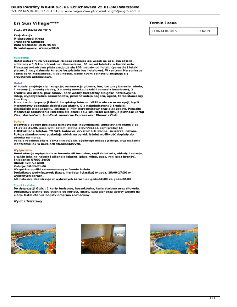 Biuro Podróży WIGRA s.c. ul. Człuchowska 25 01-360 Warszawa Tel. 22 665 06 06, 22 664 94 86, www.wigra.com.pl, e-mail: [email protected] Eri Sun Village**** Kreta 07.06-14.06.2015 Termin i cena 07.06-14.06.2015 2349 zł Kraj: Grecja Miejscowość: Kreta Transport: Samolot Data ważności: 2015-06-06 Nr katalogowy: Wczasy/2015 Położenie Hotel położony na wzgórzu,z którego roztacza się widok na pobliską zatokę, oddalony o 1,5 km od centrum Hersonissos, 30 km od lotniska w Heraklionie. Piaszczysto-żwirowa plaża znajduje się 800 metrów od hotelu (parasole i leżaki płatne, 3 razy dziennie kursuje bezpłatnie bus hotelowy). W centrum Hersonissos liczne bary, restauracje, klubu nocne. Około 600m od hotelu znajduje się przystanek autobusowy. Hotel W hotelu znajduje się: recepcja, restauracja główna, bar, bar przy basenie, winda, 3 baseny (1 z wodą słodką, 2 z wodą morską, leżaki i parasole bezpłatne), 2 brodziki dla dzieci, plac zabaw, park wodny (bezpłatny dla gości hotelowych), sklep, wypożyczalnia samochodów, przechowalnia bagażu, ogród, taras słoneczny i parking. Ponadto do dyspozycji Gości: bezpłatny internet WiFi w obszarze recepcji, kącik internetowy pozostaje dodatkowo płatny. Dla najmłodszych: 2 brodziki, zjeżdżalnie w aquaparku, animacje, mini kort tenisowy oraz plac zabaw. Ponadto możliwość zamówienia łóżeczka dla dzieci do 2 lat. Hotel akceptuje płatność kartą: Visa, MasterCard, EuroCard, American Express oraz Dinner`s Club. Pokoje Wszystkie pokoje posiadają klimatyzacje indywidualną (bezpłatna w okresie od 01.07 do 31.08, poza tymi datami płatna 3 EUR/doba), sejf (płatny 15 EUR/tydzień), telefon, TV SAT, lodówka, prysznic lub wanna, suszarka, balkon. Pokoje standardowe posiadają widok na ogród. Istniej możliwość dopłaty do widoku na morze. Pokoje rodzinne około 54m2 składają się z jednego dużego pokoju, wyposażenie identyczne jak w pokojach standardowych. Wyżywienie Hotel oferuje wyżywienie w formule All Inclusive, czyli śniadania, obiady i kolacje, a także lokalne napoje i alkohole lokalne (piwo, wino, ouzo, raki oraz brandy). Śniadanie: 07:00-10:00 Obiad: 12:15-14:00 Kolacja: 18:15-21:00 Wszystkie posiłki serwowane są w formie bufetu. Dodatkowo podwieczorek (kawa, herbata i ciastka) w godz. 16:00-17:30 w wybranych barach. All inclusive obowiązuje w wybranych barach od godz.10:00 do godz.22:00 Sport i relaks Do dyspozycji Gości: 2 korty tenisowe, koszykówka, tenis stołowy oraz siłownia. Dodatkowo płatne oświetlenie do kortów, bilard, sala gier oraz sporty wodne na plaży. Hotel oferuje bogaty program animacyjny. Wylot z Warszawy 1/1 Powered by TCPDF (www.tcpdf.org)