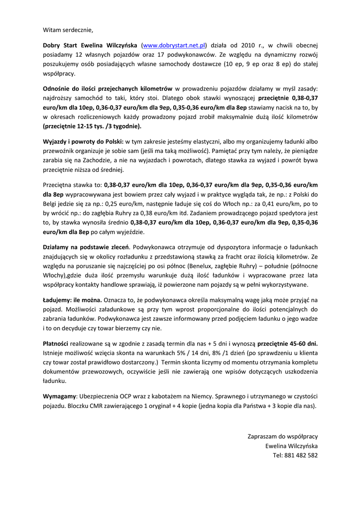 Witam serdecznie, Dobry Start Ewelina Wilczyńska (www.dobrystart.net.pl) działa od 2010 r., w chwili obecnej posiadamy 12 własnych pojazdów oraz 17 podwykonawców. Ze względu na dynamiczny rozwój poszukujemy osób posiadających własne samochody dostawcze (10 ep, 9 ep oraz 8 ep) do stałej współpracy. Odnośnie do ilości przejechanych kilometrów w prowadzeniu pojazdów działamy w myśl zasady: najdroższy samochód to taki, który stoi. Dlatego obok stawki wynoszącej przeciętnie 0,38-0,37 euro/km dla 10ep, 0,36-0,37 euro/km dla 9ep, 0,35-0,36 euro/km dla 8ep stawiamy nacisk na to, by w okresach rozliczeniowych każdy prowadzony pojazd zrobił maksymalnie dużą ilość kilometrów (przeciętnie 12-15 tys. /3 tygodnie). Wyjazdy i powroty do Polski: w tym zakresie jesteśmy elastyczni, albo my organizujemy ładunki albo przewoźnik organizuje je sobie sam (jeśli ma taką możliwość). Pamiętać przy tym należy, że pieniądze zarabia się na Zachodzie, a nie na wyjazdach i powrotach, dlatego stawka za wyjazd i powrót bywa przeciętnie niższa od średniej. Przeciętna stawka to: 0,38-0,37 euro/km dla 10ep, 0,36-0,37 euro/km dla 9ep, 0,35-0,36 euro/km dla 8ep wypracowywana jest bowiem przez cały wyjazd i w praktyce wygląda tak, że np.: z Polski do Belgi jedzie się za np.: 0,25 euro/km, następnie ładuje się coś do Włoch np.: za 0,41 euro/km, po to by wrócić np.: do zagłębia Ruhry za 0,38 euro/km itd. Zadaniem prowadzącego pojazd spedytora jest to, by stawka wynosiła średnio 0,38-0,37 euro/km dla 10ep, 0,36-0,37 euro/km dla 9ep, 0,35-0,36 euro/km dla 8ep po całym wyjeździe. Działamy na podstawie zleceń. Podwykonawca otrzymuje od dyspozytora informacje o ładunkach znajdujących się w okolicy rozładunku z przedstawioną stawką za fracht oraz ilością kilometrów. Ze względu na poruszanie się najczęściej po osi północ (Benelux, zagłębie Ruhry) – południe (północne Włochy),gdzie duża ilość przemysłu warunkuje dużą ilość ładunków i wypracowane przez lata współpracy kontakty handlowe sprawiają, iż powierzone nam pojazdy są w pełni wykorzystywane. Ładujemy: ile można. Oznacza to, że podwykonawca określa maksymalną wagę jaką może przyjąć na pojazd. Możliwości załadunkowe są przy tym wprost proporcjonalne do ilości potencjalnych do zabrania ładunków. Podwykonawca jest zawsze informowany przed podjęciem ładunku o jego wadze i to on decyduje czy towar bierzemy czy nie. Płatności realizowane są w zgodnie z zasadą termin dla nas + 5 dni i wynoszą przeciętnie 45-60 dni. Istnieje możliwość wzięcia skonta na warunkach 5% / 14 dni, 8% /1 dzień (po sprawdzeniu u klienta czy towar został prawidłowo dostarczony.) Termin skonta liczymy od momentu otrzymania kompletu dokumentów przewozowych, oczywiście jeśli nie zawierają one wpisów dotyczących uszkodzenia ładunku. Wymagamy: Ubezpieczenia OCP wraz z kabotażem na Niemcy. Sprawnego i utrzymanego w czystości pojazdu. Bloczku CMR zawierającego 1 oryginał + 4 kopie (jedna kopia dla Państwa + 3 kopie dla nas). Zapraszam do współpracy Ewelina Wilczyńska Tel: 881 482 582