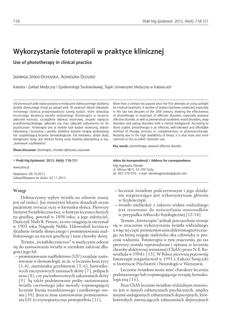 718 Probl Hig Epidemiol 2013, 94(4): 718-721 Wykorzystanie fototerapii w praktyce klinicznej Use of phototherapy in clinical practice Jadwiga Jośko-Ochojska, Agnieszka Oleszko Katedra i Zakład Medycyny i Epidemiologii Środowiskowej, Śląski Uniwersytet Medyczny w Katowicach Od pierwszych prób wykorzystania w medycynie dobroczynnego działania światła słonecznego minął już ponad wiek. W ostatnich dwóch dekadach minionego stulecia przeprowadzono szereg badań, które dowodzą leczniczego działania światła widzialnego (fototerapii) w leczeniu zaburzeń nastroju, szczególnie depresji sezonowej, zespołu napięcia przedmiesiączkowego, zaburzeń snu oraz zaburzeń odżywiania na tle psychicznym. Fototerapia jest w świetle tych badań skuteczną, dobrze tolerowaną i korzystną z punktu widzenia kosztów terapią podstawową lub uzupełniającą leczenie farmakologiczne. Od niedawna, dzięki dużej dostępności lamp, jest również formą coraz bardziej powszechną w tzw. „domowym użytkowaniu”. More than a century has passed since the first attempts at using sunlight for medical treatment. A number of studies had been conducted, especially in the last two decades of the 20th century, showing the effectiveness of phototherapy in treatment of affective disorders, especially seasonal affective disorder, as well as premenstrual syndrome, mood disorders, sleep disorders and eating disorders with a mental background. According to those studies, phototherapy is an effective, well-tolerated and affordable method of therapy, primary or complementary to pharmacotherapy. Recently, due to the high availability of lamps, it is also more and more common in the so-called ‘domestic use’. Key words: phototherapy, seasonal affective disorder Słowa kluczowe: fototerapia, choroba afektywna sezonowa © Probl Hig Epidemiol 2013, 94(4): 718-721 www.phie.pl Nadesłano: 09.10.2013 Zakwalifikowano do druku: 02.11.2013 Wstęp Dobroczynny wpływ światła na zdrowie znany jest od stuleci. Już starożytni lekarze doradzali swym pacjentom zwracać oczy w kierunku słońca. Pierwszy Instytut Światłolecznictwa, w którym leczono chorych na gruźlicę, powstał w 1898 roku, a jego założyciel, Duńczyk Niels R. Finsen, za swe osiągnięcia otrzymał w 1903 roku Nagrodę Nobla. Udowodnił lecznicze działanie światła słonecznego i promieniowania nadfioletowego na toczeń gruźliczy i inne choroby skóry. Termin „światłolecznictwo” w medycynie odnosi się do zastosowania światła w szerokim zakresie długości jego fal: –promieniowanie nadfioletowe (UV) znajduje zastosowanie w dermatologii, m.in. w leczeniu łuszczycy [1-4], ziarniniaku grzybiastym [5, 6], barwnikowych naczyniowych zmianach skóry [7], polipach nosa [8], czy paciorkowcowych zakażeniach skóry [9]. Są także podejmowane próby zastosowania światła czerwonego jako metody wspomagającej leczenie liszaja twardzinowego i zanikowego sromu [10]. Jeszcze inne zastosowanie promieniowania UV to erytropoetyczna protoporfiria [11]. Adres do korespondencji / Address for correspondence Mgr Agnieszka Oleszko ul. Witosa 4B/5, 43-100 Tychy tel. 607 370 070, e-mail: [email protected] –leczenie światłem podczerwonym i jego działanie rozgrzewające jest wykorzystywane głównie w fizykoterapii. –światło niebieskie z zakresu widma widzialnego jest stosowane do naświetlania noworodków w przypadku żółtaczki fizjologicznej [12-14]. Termin „fototerapia” jednak powszechnie stosuje się w znaczeniu wykorzystania światła widzialnego, a więc tej część promieniowania elektromagnetycznego, na którą reaguje siatkówka oka człowieka w procesie widzenia. Fototerapia w tym znaczeniu, po raz pierwszy została wprowadzona i opisana w leczeniu choroby afektywnej sezonowej (ChAS) przez N. E. Rosenthala w 1984 r. [15]. W Polsce pierwszą pracownię fototerapii zorganizował w 1991 r. Łukasz Święcicki w Instytucie Psychiatrii i Neurologii w Warszawie. Leczenie światłem może mieć charakter leczenia podstawowego lub wspomagającego terapię farmakologiczną [16]. Poza ChAS leczenie światłem widzialnym stosowane jest w innych zaburzeniach psychicznych, między innymi endogennych zaburzeniach depresyjnych, krótkotrwałych nawracających zaburzeniach depresyjnych Jośko-Ochojska J, Oleszko A. Wykorzystanie fototerapii w praktyce klinicznej i zaburzeniach snu [17]. Wśród obiecujących wskazań do zastosowania fototerapii wymieniane są też: zaburzenia dwubiegunowe, przedmiesiączkowe zaburzenia dysforyczne, depresja u kobiet w ciąży, zespół przewlekłego zmęczenia [18], anoreksja [19, 20] czy współwystępująca z depresją osobowość borderline [21]. Istnieją ponadto doniesienia o zastosowaniu terapii światłem w padaczce skroniowej [22], zastosowaniu lasera argonowego w leczeniu opornego grzybiczego zapalenia rogówki [23], stymulowaniu procesu angiogenezy przez światło laserowe i diody LED [24] oraz wpływie światła niebieskiego na poprawę funkcji poznawczych u objętych opieką długoterminową osób w podeszłym wieku [25]. Szyszynka – „trzecie oko” dla promieniowania słonecznego Związek pomiędzy światłem a działaniem zegara biologicznego został dokładnie poznany stosunkowo niedawno. Fotony, drażniąc fotoreceptory siatkówki, powodują powstanie impulsu biegnącego przez nerw wzrokowy do jądra skrzyżowania, które komunikuje się przez połączenia wielonerwowe z szyszynką. Wydzielana przez nią melatonina jest odpowiedzialna za senność i obniżanie się temperatury ciała, pojawiające się wraz ze zbliżaniem się zmierzchu. Stężenie melatoniny w surowicy krwi jest najwyższe nocą i zwykle maleje około godziny 6:00 rano [17]. Spowodowane długimi zimowymi nocami nadmierne jej wydzielanie może u części osób wywoływać bezustanne uczucie senności i zmęczenia [26]. Szyszynka zwana jest więc czasem „trzecim okiem”. W ciągu dnia, pod wpływem promieniowania ultrafiole