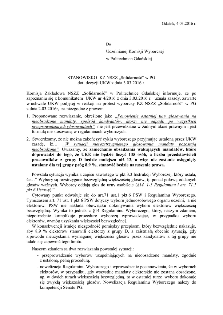Gdańsk, 4.03.2016 r. Do Uczelnianej Komisji Wyborczej w Politechnice Gdańskiej STANOWISKO KZ NSZZ „Solidarność” w PG dot. decyzji UKW z dnia 3.03.2016 r. Komisja Zakładowa NSZZ „Solidarność” w Politechnice Gdańskiej informuje, że po zapoznaniu się z komunikatem UKW nr 4/2016 z dnia 3.03.2016 r. uznała zasady, zawarte w uchwale UKW podjętej w reakcji na protest wyborczy KZ NSZZ „Solidarność” w PG z dnia 2.03.2016r, za niezgodne z prawem. 1. Proponowane rozwiązanie, określone jako „Ponowienie ostatniej tury głosowania na nieobsadzone mandaty, spośród kandydatów, którzy nie odpadli po wszystkich przeprowadzonych głosowaniach”, nie jest przewidziane w żadnym akcie prawnym i jest formułą nie stosowaną w regulaminach wyborczych. 2. Stwierdzamy, że nie można zakończyć cyklu wyborczego przyjmując ustaloną przez UKW zasadę, iż… „W sytuacji nierozstrzygniętego głosowania mandaty pozostają nieobsadzone”. Uważamy, że zaniechanie obsadzania wakujących mandatów, które doprowadzi do tego, że UKE nie będzie liczyć 135 osób, a liczba przedstawicieli pracowników z grupy D będzie mniejsza niż 12, a więc nie zostanie osiągnięty ustalony dla tej grupy próg 8,9 %, stanowić będzie naruszenie prawa. Powstała sytuacja wynika z zapisu zawartego w pkt 3.3 Instrukcji Wyborczej, który ustala, że…” Wybory są rozstrzygane bezwzględną większością głosów, tj. ponad połową oddanych głosów ważnych. Wyborcy oddają głos do urny osobiście (§14. 1-3 Regulaminu i art. 71.1 pkt 6 Ustawy).” Cytowany punkt odwołuje się do art.71 ust.1 pkt.6 PSW i Regulaminu Wyborczego. Tymczasem art. 71 ust. 1 pkt 6 PSW dotyczy wyboru jednoosobowego organu uczelni, a nie elektorów. PSW nie nakłada obowiązku dokonywania wyboru elektorów większością bezwzględną. Wynika to jednak z §14 Regulaminu Wyborczego, który, naszym zdaniem, niepotrzebnie komplikuje procedurę wyborczą wprowadzając, w przypadku wyboru elektorów, wymóg uzyskania większości bezwzględnej. W konsekwencji istnieje niezgodność pomiędzy przepisem, który bezwzględnie nakazuje, aby 8,9 % elektorów stanowili elektorzy z grupy D, a zaistniałą obecnie sytuacją, gdy z powodu nieuzyskania wymaganej większości głosów przez kandydatów z tej grupy nie udało się zapewnić tego limitu. Naszym zdaniem są dwa rozwiązania powstałej sytuacji: - przeprowadzenie wyborów uzupełniających na nieobsadzone mandaty, zgodnie z ustaloną, pełną procedurą, - nowelizacja Regulaminu Wyborczego i wprowadzenie postanowienia, że w wyborach elektorów, w przypadku, gdy wszystkie mandaty elektorskie nie zostaną obsadzone, np. w dwóch turach większością bezwzględną, to w ostatniej turze wyboru dokonuje się zwykłą większością głosów. Nowelizacja Regulaminu Wyborczego należy do kompetencji Senatu PG. Uściślenia wymaga ta druga propozycja. W nowelizacji tegorocznego Regulaminu Wyborczego należałoby zapisać, że ”... gdy wszystkie mandaty elektorskie nie zostaną obsadzone w 4. turach większością bezwzględną, to w ostatniej, 5. turze wyboru dokonuje się zwykłą większością głosów.” Jest to uznanie obsady miejsc mandatowych już uzyskanych w tegorocznych wyborach. Natomiast propozycja zredukowania liczby tur z obowiązującą do uzyskania mandatu bezwzględną liczba głosów np. do dwóch (trzech) i dokonanie wyboru w 3. (4.) turze zwykłą większością głosów dotyczy następnych wyborów. Z wyrazami szacunku Przewodniczący KZ NSZZ „Solidarność” w PG Dr inż. Tadeusz Szymański