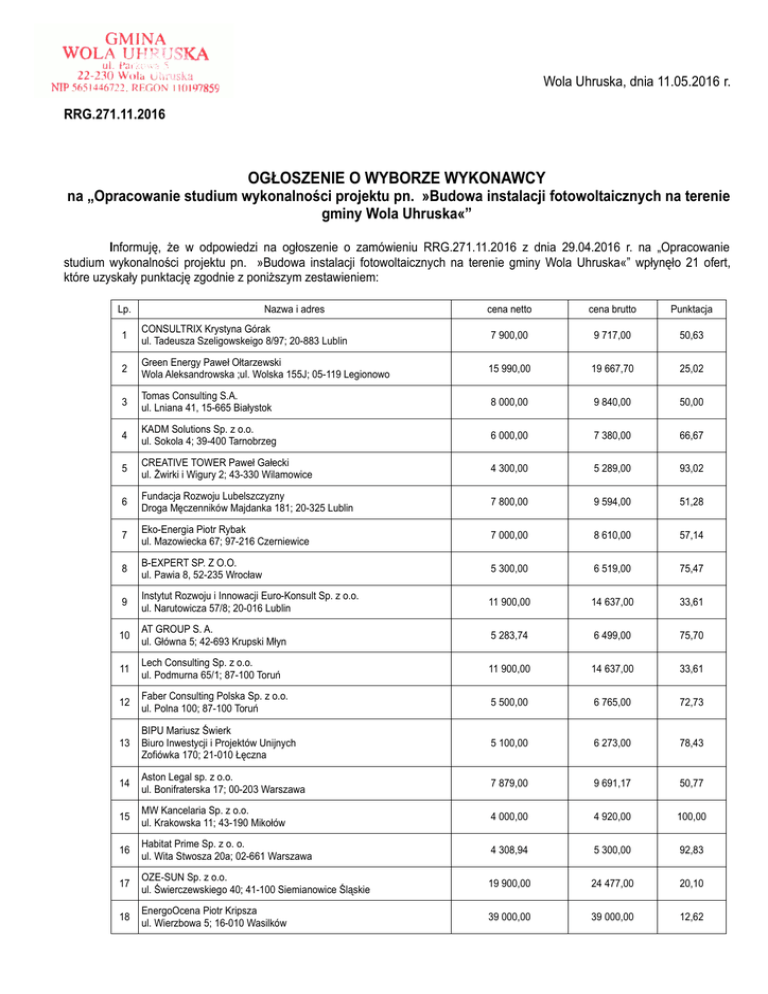 Wola Uhruska, dnia 11.05.2016 r. RRG.271.11.2016 OGŁOSZENIE O WYBORZE WYKONAWCY na „Opracowanie studium wykonalności projektu pn. »Budowa instalacji fotowoltaicznych na terenie gminy Wola Uhruska«” Informuję, że w odpowiedzi na ogłoszenie o zamówieniu RRG.271.11.2016 z dnia 29.04.2016 r. na „Opracowanie studium wykonalności projektu pn. »Budowa instalacji fotowoltaicznych na terenie gminy Wola Uhruska«” wpłynęło 21 ofert, które uzyskały punktację zgodnie z poniższym zestawieniem: Lp. Nazwa i adres cena netto cena brutto Punktacja 1 CONSULTRIX Krystyna Górak ul. Tadeusza Szeligowskeigo 8/97; 20-883 Lublin 7 900,00 9 717,00 50,63 2 Green Energy Paweł Ołtarzewski Wola Aleksandrowska ;ul. Wolska 155J; 05-119 Legionowo 15 990,00 19 667,70 25,02 3 Tomas Consulting S.A. ul. Lniana 41, 15-665 Białystok 8 000,00 9 840,00 50,00 4 KADM Solutions Sp. z o.o. ul. Sokola 4; 39-400 Tarnobrzeg 6 000,00 7 380,00 66,67 5 CREATIVE TOWER Paweł Gałecki ul. Żwirki i Wigury 2; 43-330 Wilamowice 4 300,00 5 289,00 93,02 6 Fundacja Rozwoju Lubelszczyzny Droga Męczenników Majdanka 181; 20-325 Lublin 7 800,00 9 594,00 51,28 7 Eko-Energia Piotr Rybak ul. Mazowiecka 67; 97-216 Czerniewice 7 000,00 8 610,00 57,14 8 B-EXPERT SP. Z O.O. ul. Pawia 8, 52-235 Wrocław 5 300,00 6 519,00 75,47 9 Instytut Rozwoju i Innowacji Euro-Konsult Sp. z o.o. ul. Narutowicza 57/8; 20-016 Lublin 11 900,00 14 637,00 33,61 10 AT GROUP S. A. ul. Główna 5; 42-693 Krupski Młyn 5 283,74 6 499,00 75,70 11 Lech Consulting Sp. z o.o. ul. Podmurna 65/1; 87-100 Toruń 11 900,00 14 637,00 33,61 12 Faber Consulting Polska Sp. z o.o. ul. Polna 100; 87-100 Toruń 5 500,00 6 765,00 72,73 13 BIPU Mariusz Świerk Biuro Inwestycji i Projektów Unijnych Zofiówka 170; 21-010 Łęczna 5 100,00 6 273,00 78,43 14 Aston Legal sp. z o.o. ul. Bonifraterska 17; 00-203 Warszawa 7 879,00 9 691,17 50,77 15 MW Kancelaria Sp. z o.o. ul. Krakowska 11; 43-190 Mikołów 4 000,00 4 920,00 100,00 16 Habitat Prime Sp. z o. o. ul. Wita Stwosza 20a; 02-661 Warszawa 4 308,94 5 300,00 92,83 17 OZE-SUN Sp. z o.o. ul. Świerczewskiego 40; 41-100 Siemianowice Śląskie 19 900,00 24 477,00 20,10 18 EnergoOcena Piotr Kripsza ul. Wierzbowa 5; 16-010 Wasilków 39 000,00 39 000,00 12,62 19 FOKUS2 Sp. z o.o. ul. Sudecka 8j/2; 41-608 Świętochłowice 4 600,00 5 658,00 86,96 20 Best Consulting Plus Sp. z o.o. ul. Roździeńskiego2; 41-946 Piekary Śląskie 7 000,00 8 610,00 57,14 21 Lubelska Fundaca Inicjatyw Ekologicznych ul. Lubelska 88; 23-200 Kraśnik 4 800,00 5 904,00 83,33 Zgodnie z zapisami w/w ogłoszenia, wybrano ofertę z najniższą ceną brutto za wykonanie całości zamówienia, złożoną przez MW Kancelaria Sp. z o.o., ul. Krakowska 11; 43-190 Mikołów, która uzyskała 100,00 punktów. Z poważaniem Ogłoszenie niniejsze podano do publicznej wiadomości poprzez umieszczenie na tablicy ogłoszeń Urzędu Gminy Wola Uhruska w terminie od dnia 11.05.2016 r. do dnia …..................2016 r. oraz opublikowano w Biuletynie Informacji Publicznej pod adresem: http://ugwolauhruska.bip.lubelskie.pl